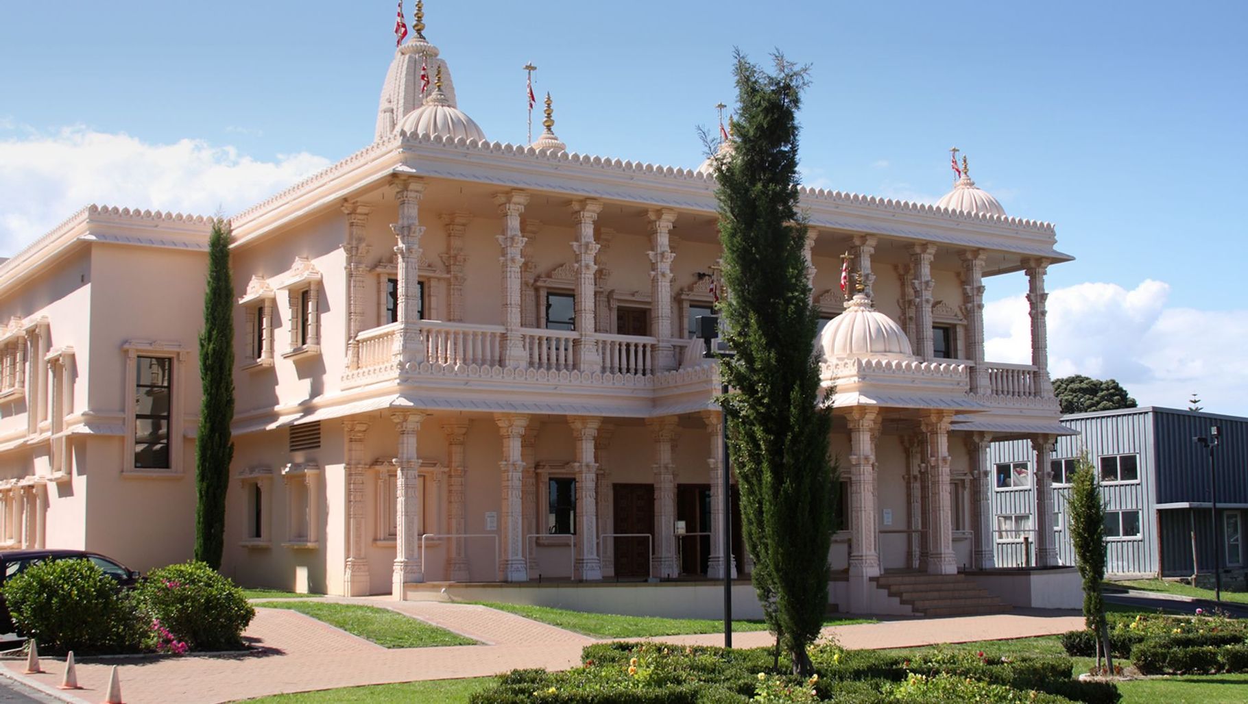ArchiPro Project Summary - Traditional North Indian Swaminarayan temple in West Auckland, blending Indian craftsmanship with modern New Zealand construction methods, featuring prototype sandstone carvings and glass reinforced concrete components.