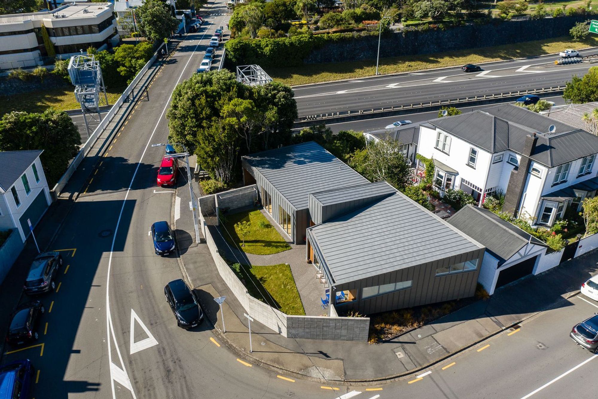 ArchiPro Project Summary - A minimalist urban residence in Wellington, designed for earthquake resilience with a floating form, zinc cladding, and a focus on privacy, blending functionality with modern aesthetics.