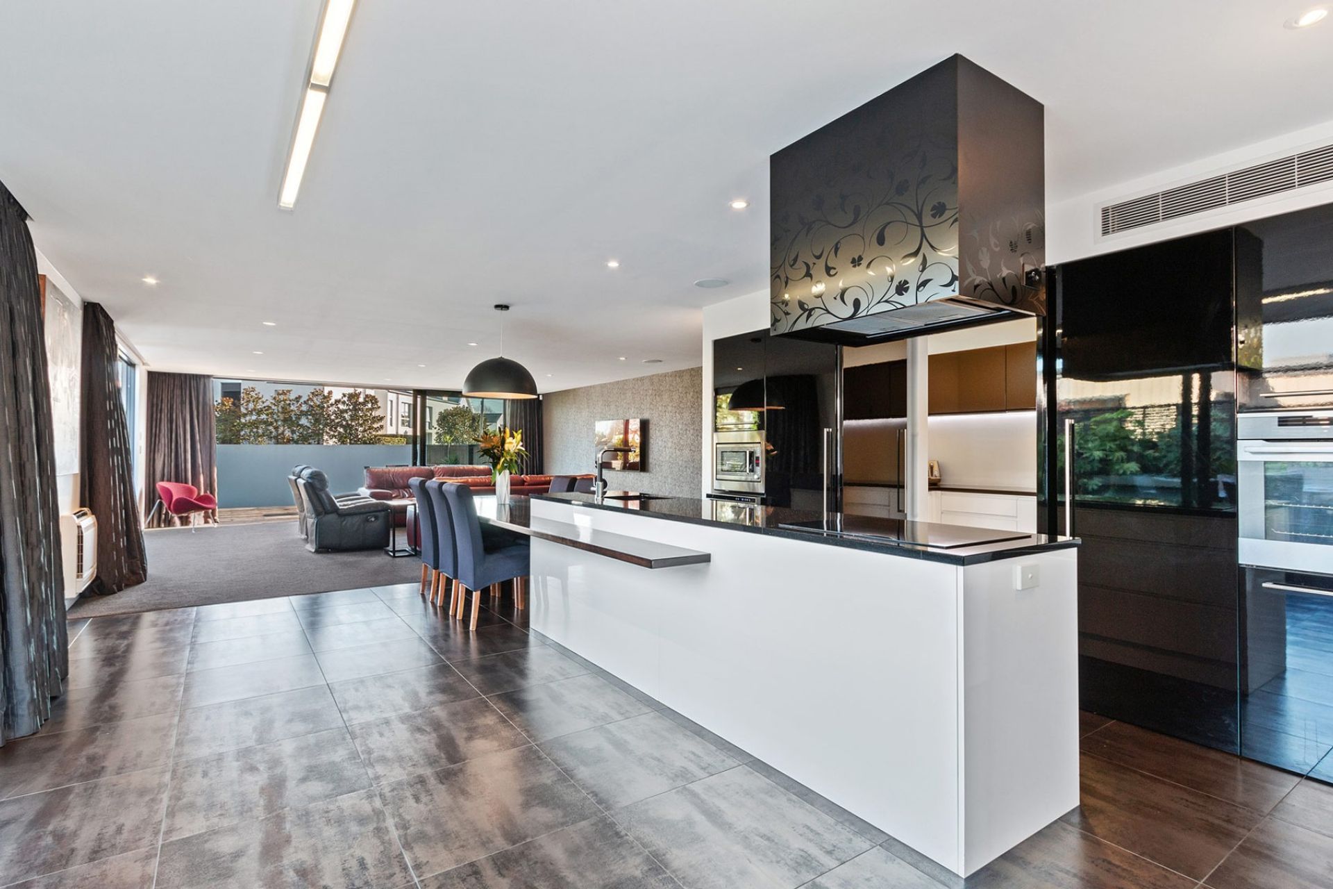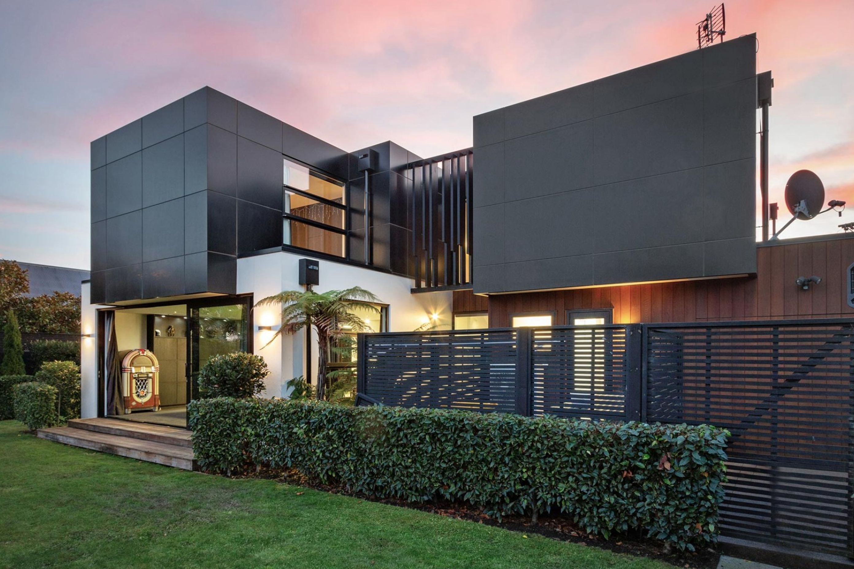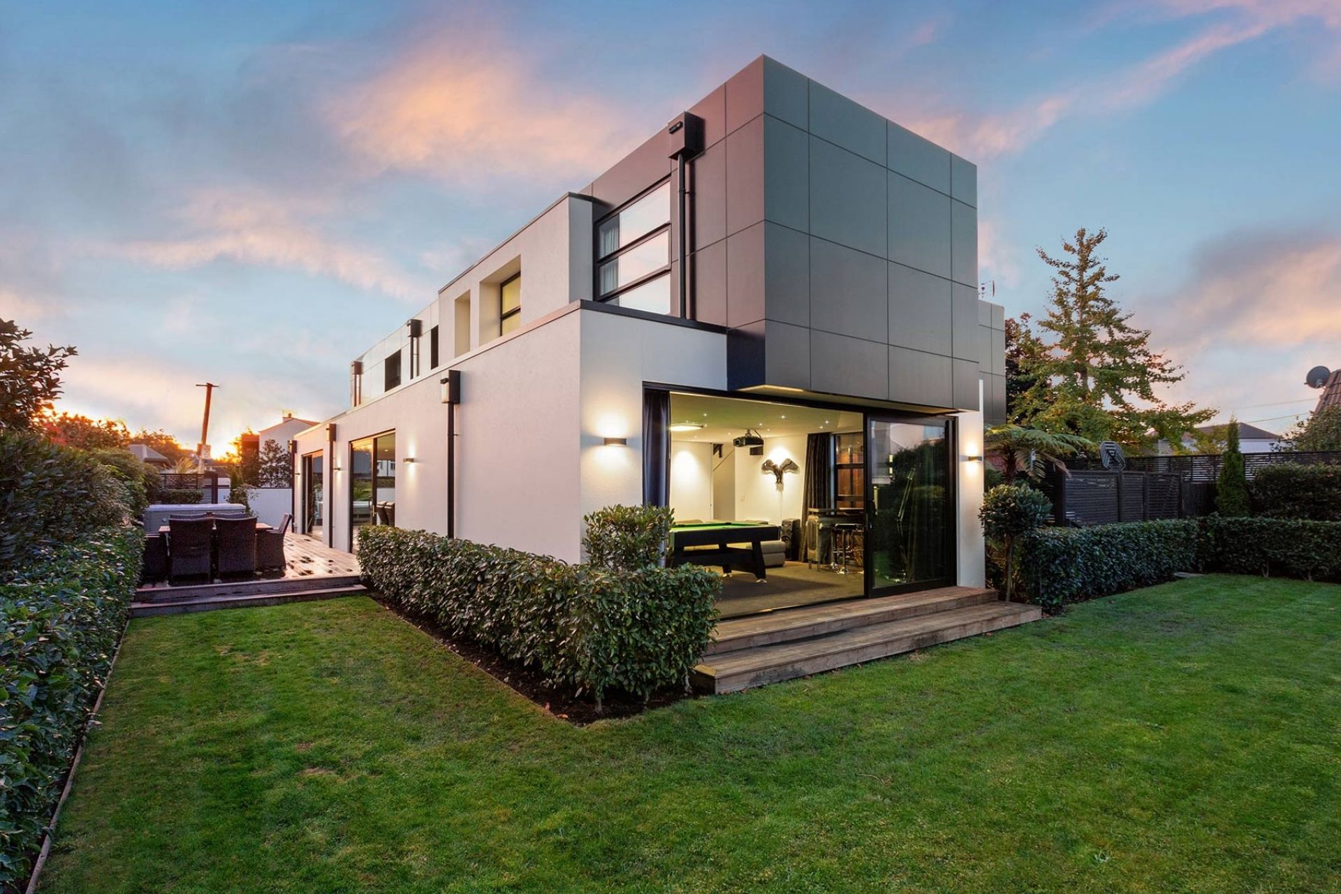 ArchiPro Project Summary - Contemporary luxury home in Fendalton featuring striking Alpolic black cladding and Rockcote finishes, designed for family living and entertaining with spacious, stylish interiors and high-end joinery.