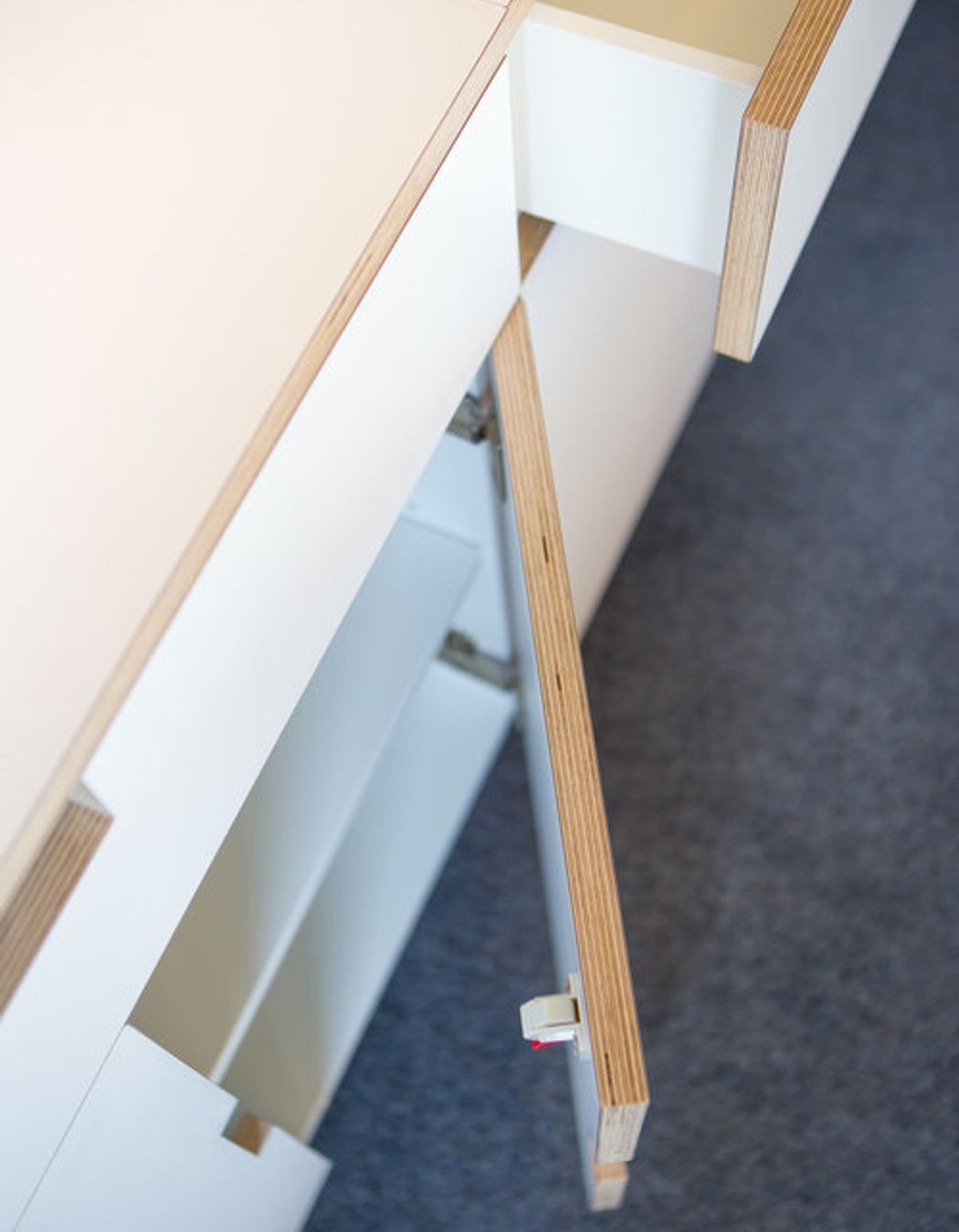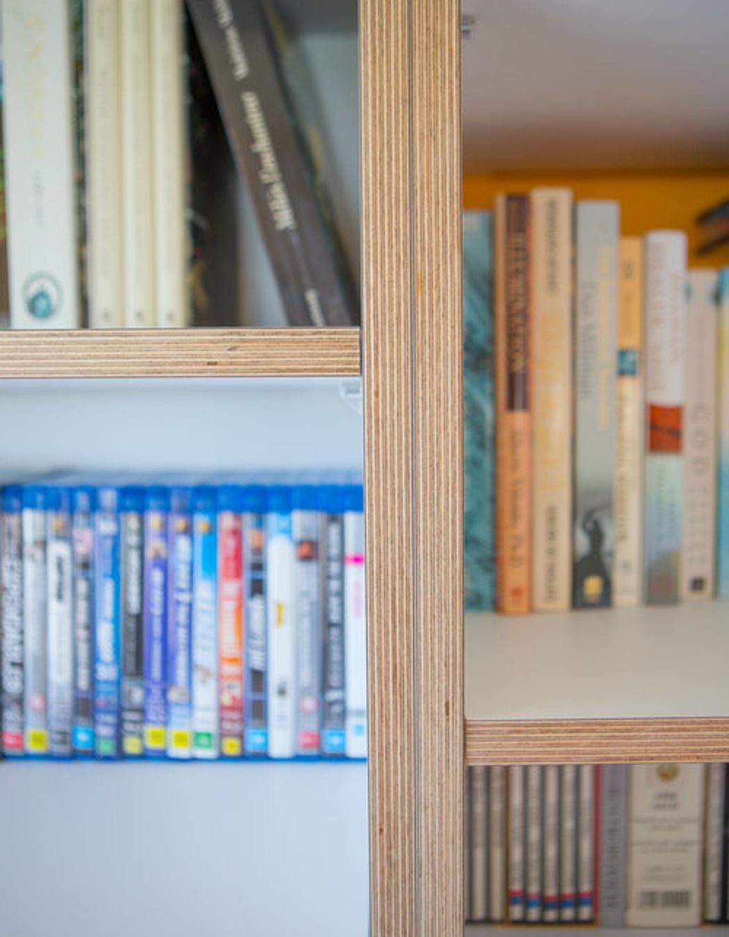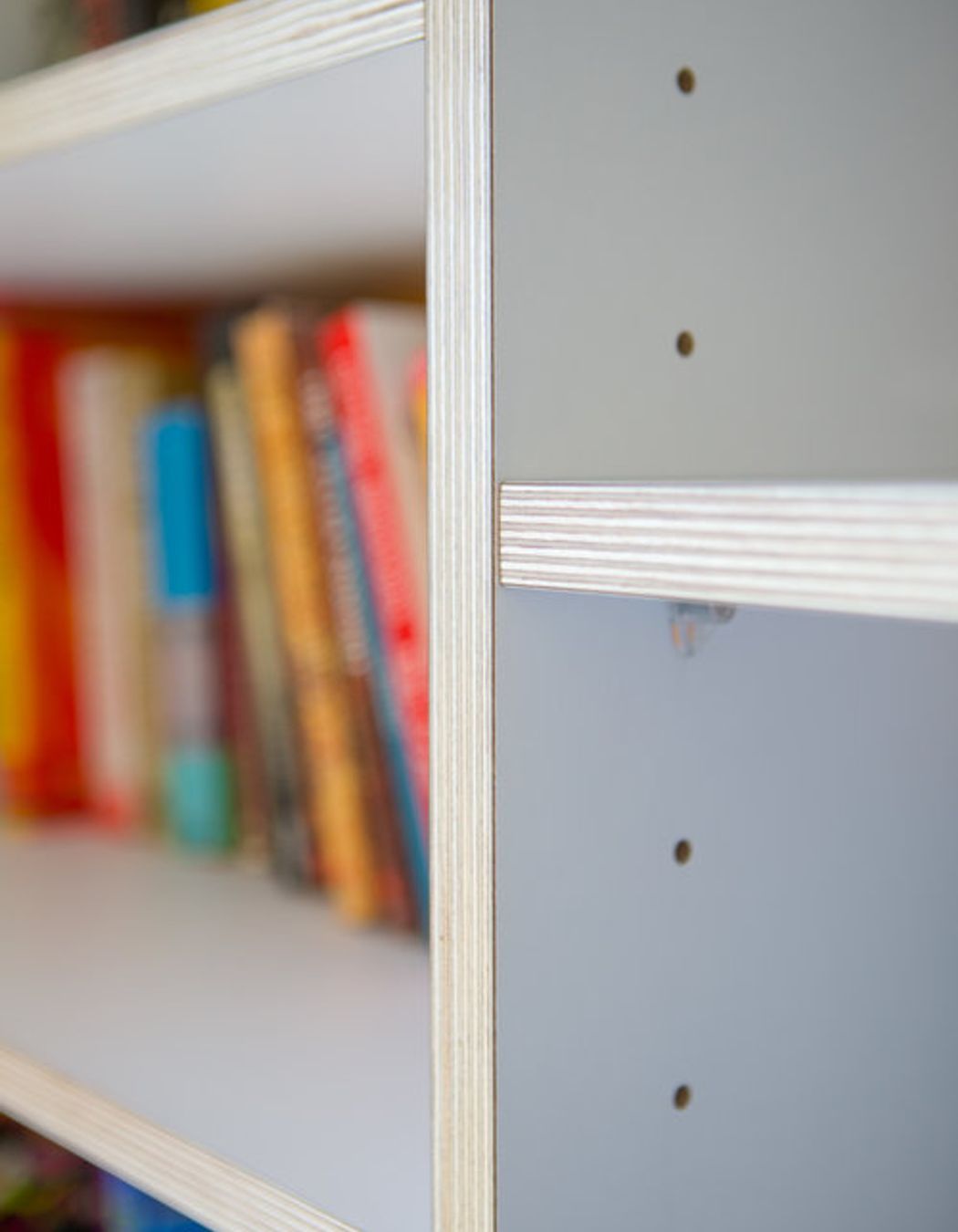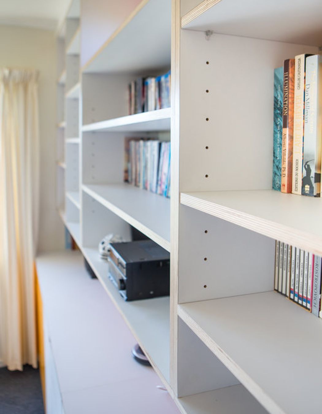 ArchiPro Project Summary - Custom plywood joinery designed for a flexible living room entertainment space, featuring integrated shelving, cable management, power points, and secure storage with child locks for safety.