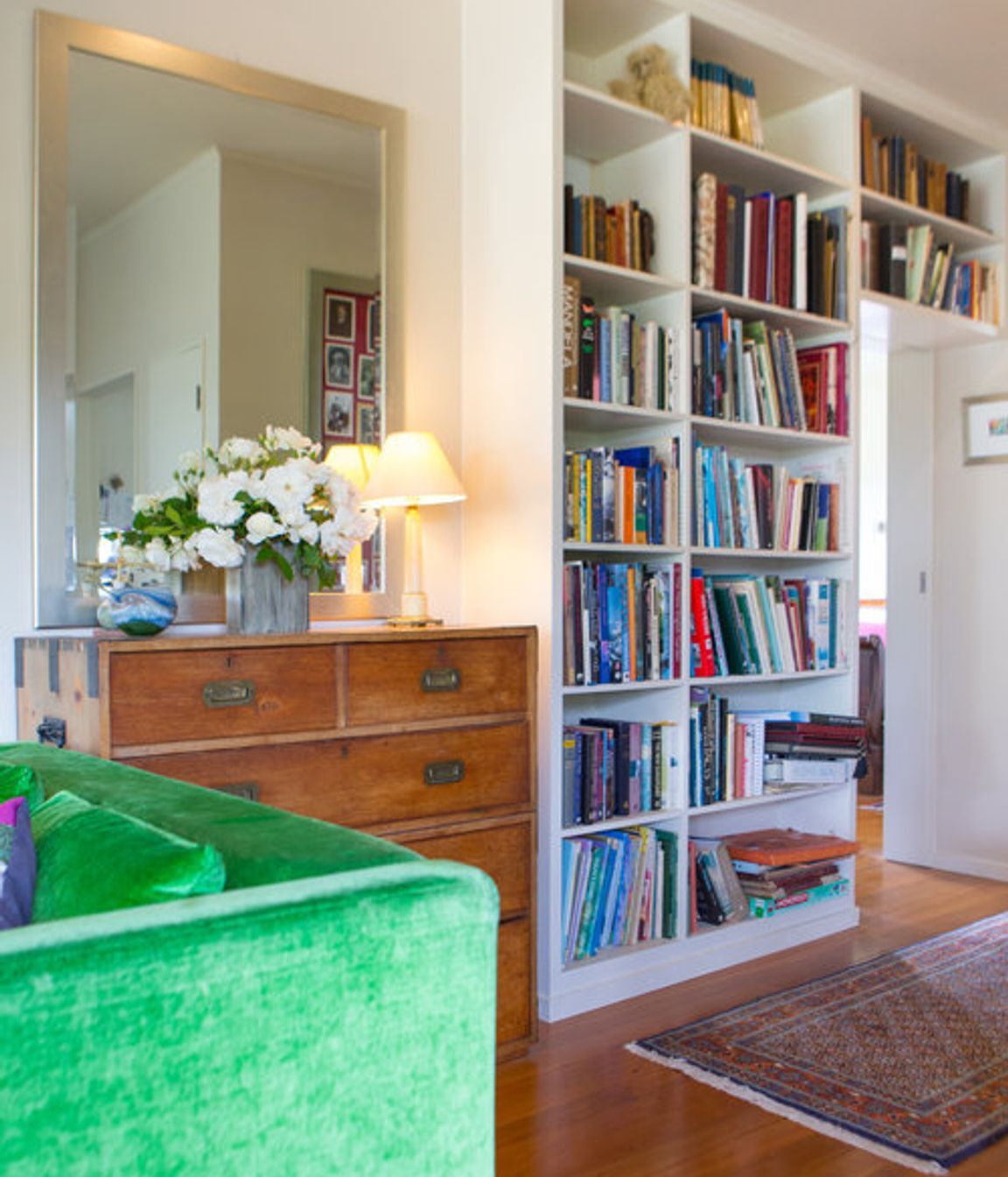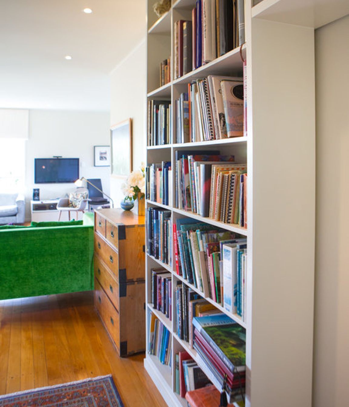 ArchiPro Project Summary - Custom-designed floor-to-ceiling bookshelf enhances hallway space while discreetly concealing a sliding door to the master bedroom.
