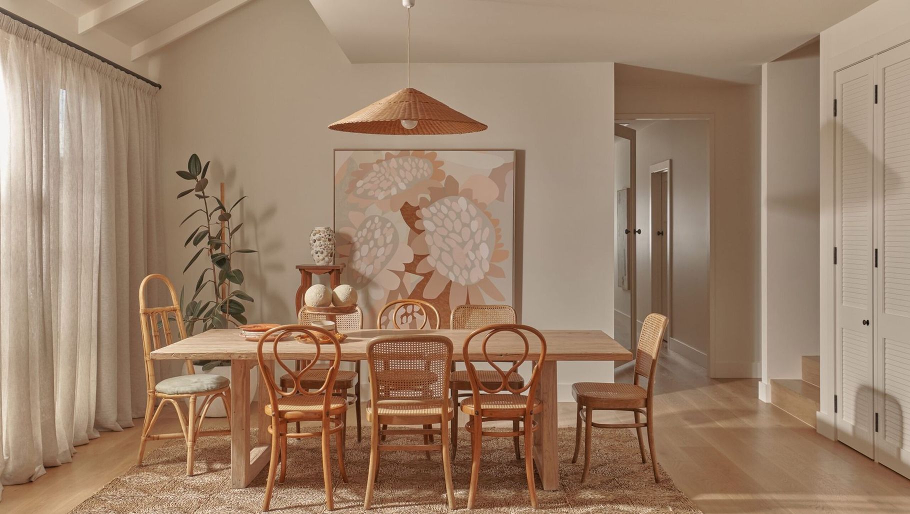 Kimmy’s talents in creativity and fine art brought a stunning sense of artistry to every corner of the home. A colour palette of warm tones and natural timber epitomise the property’s character. Infused with thoughtful design concepts, this project was crafted to feel lived-in, practical and nurturing for the family. Blending design concepts from France and the Mediterranean, the curation of vintage and contemporary furniture is a striking combination. Honey browns, soft oranges and cream colours offer an earthy, yet energetic feel to the home. Taking inspiration from Kimmy’s art, the residence incorporates botanical accents inspired by nature.