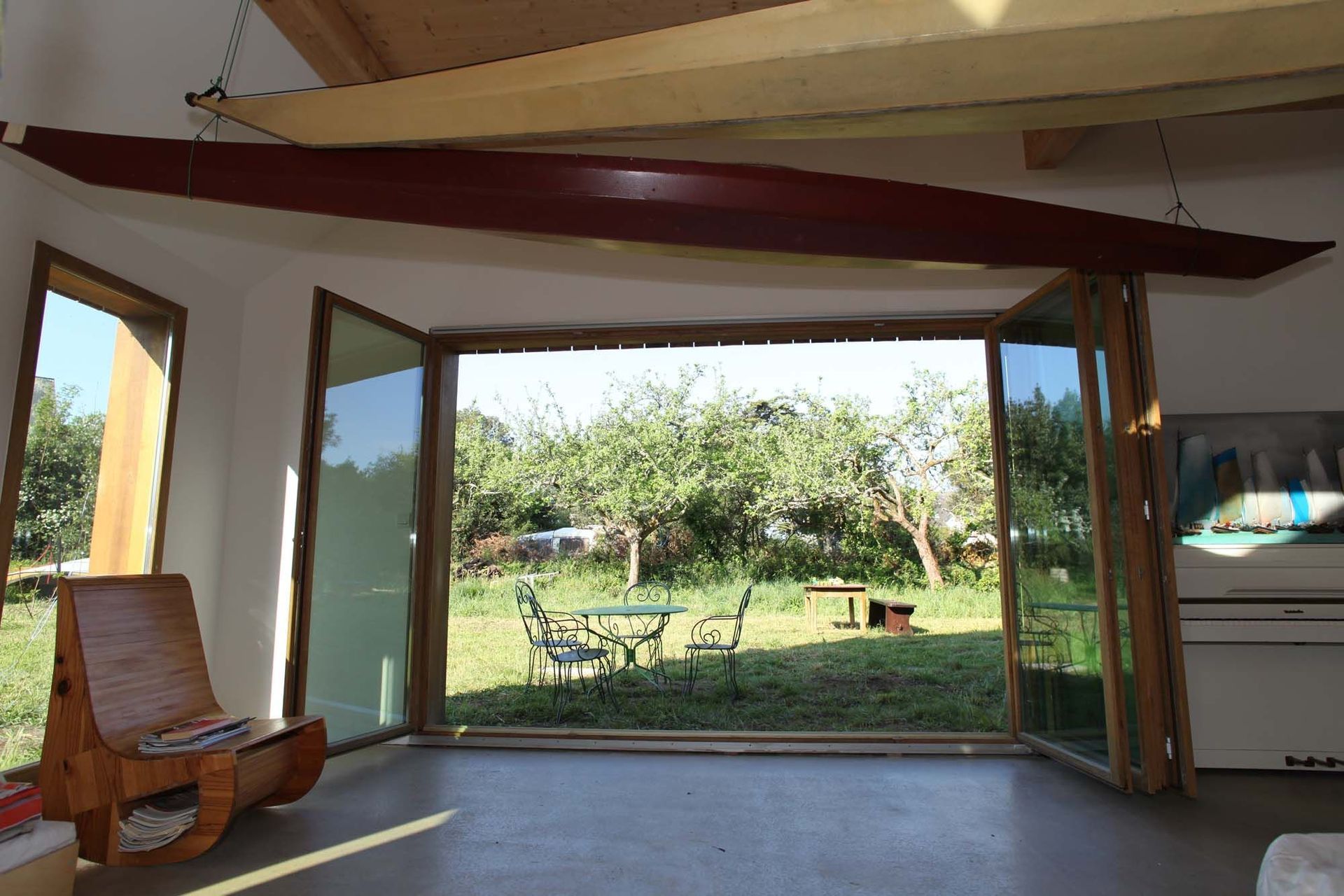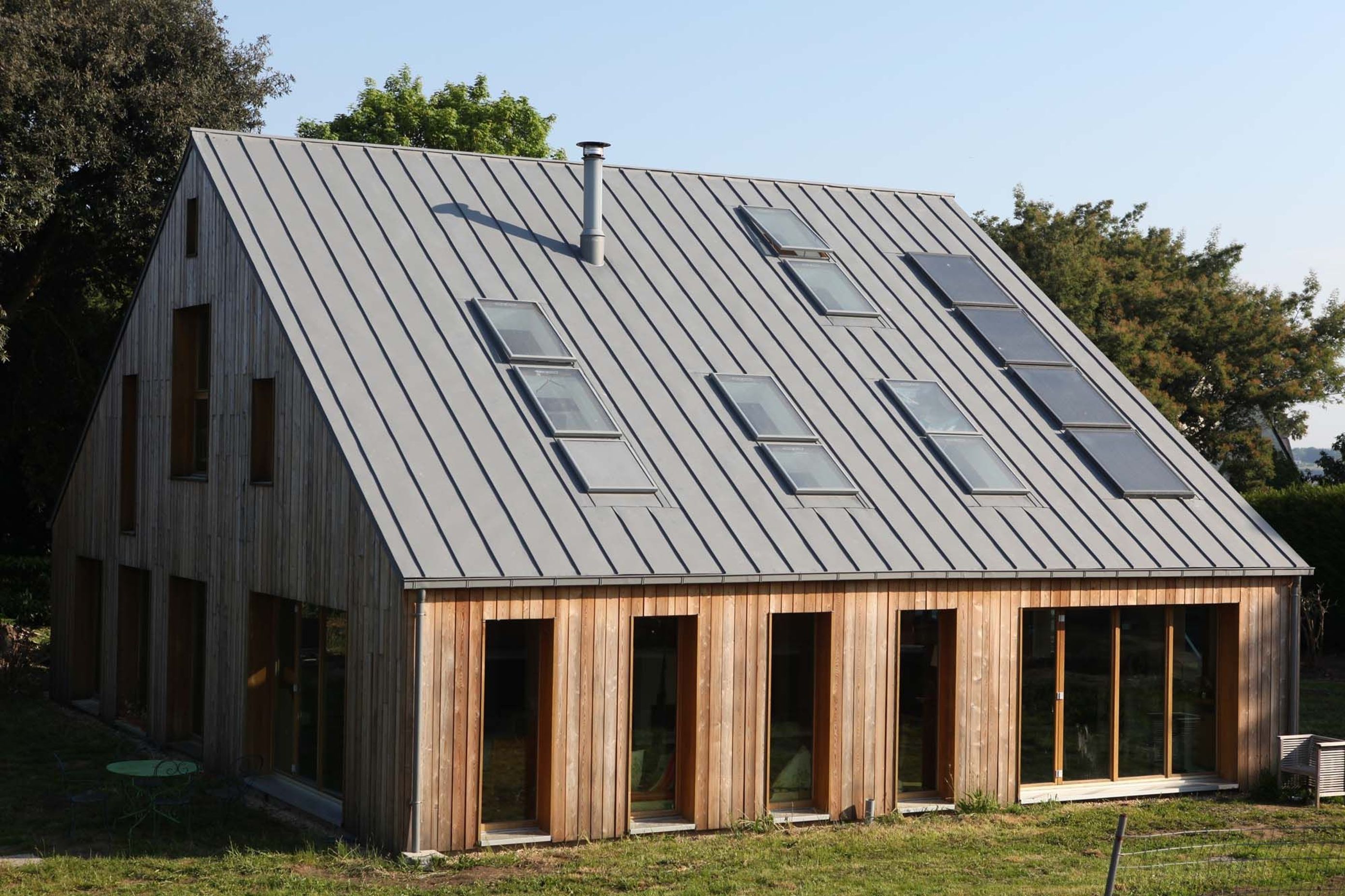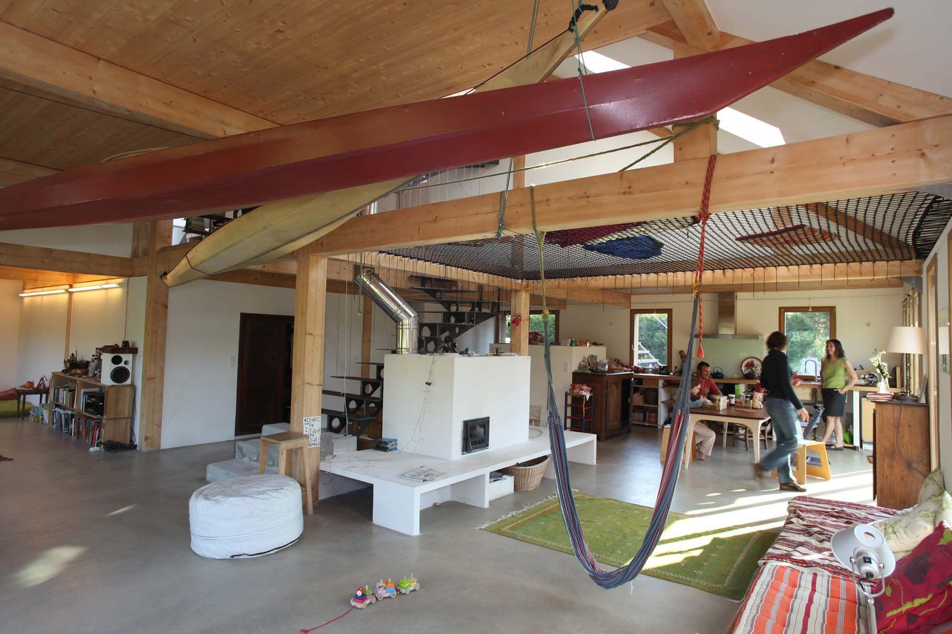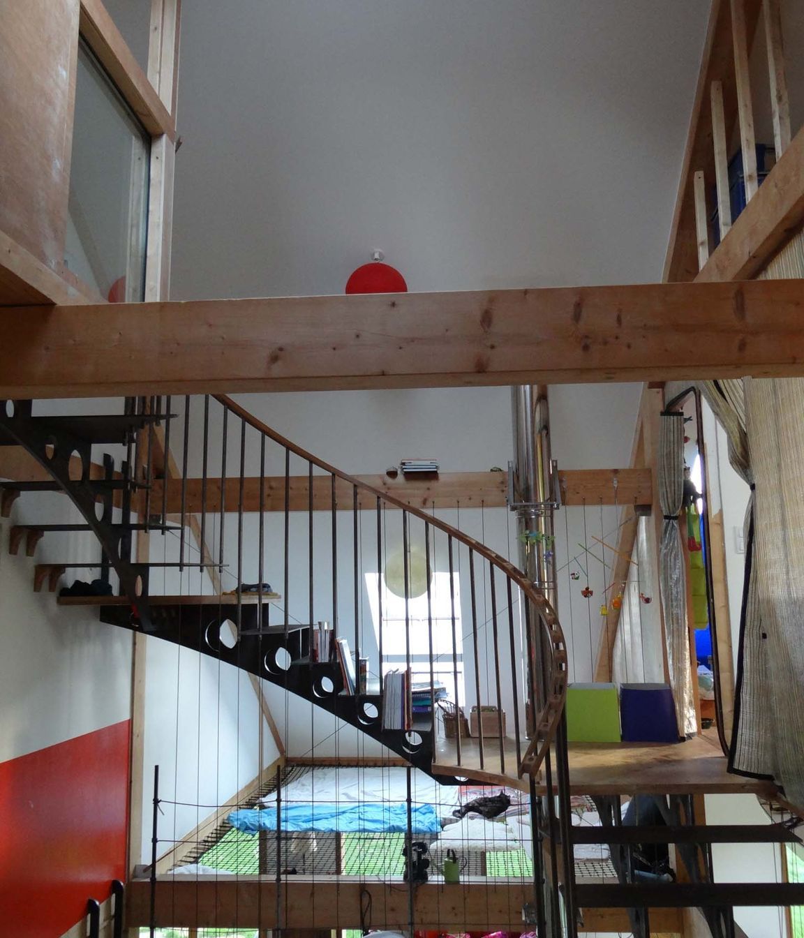 ArchiPro Project Summary - Innovative zero carbon home design inspired by yurt elements, featuring a central ceramic stove, flexible spaces, and sustainable materials including massive timber structure and recycled fabric insulation.