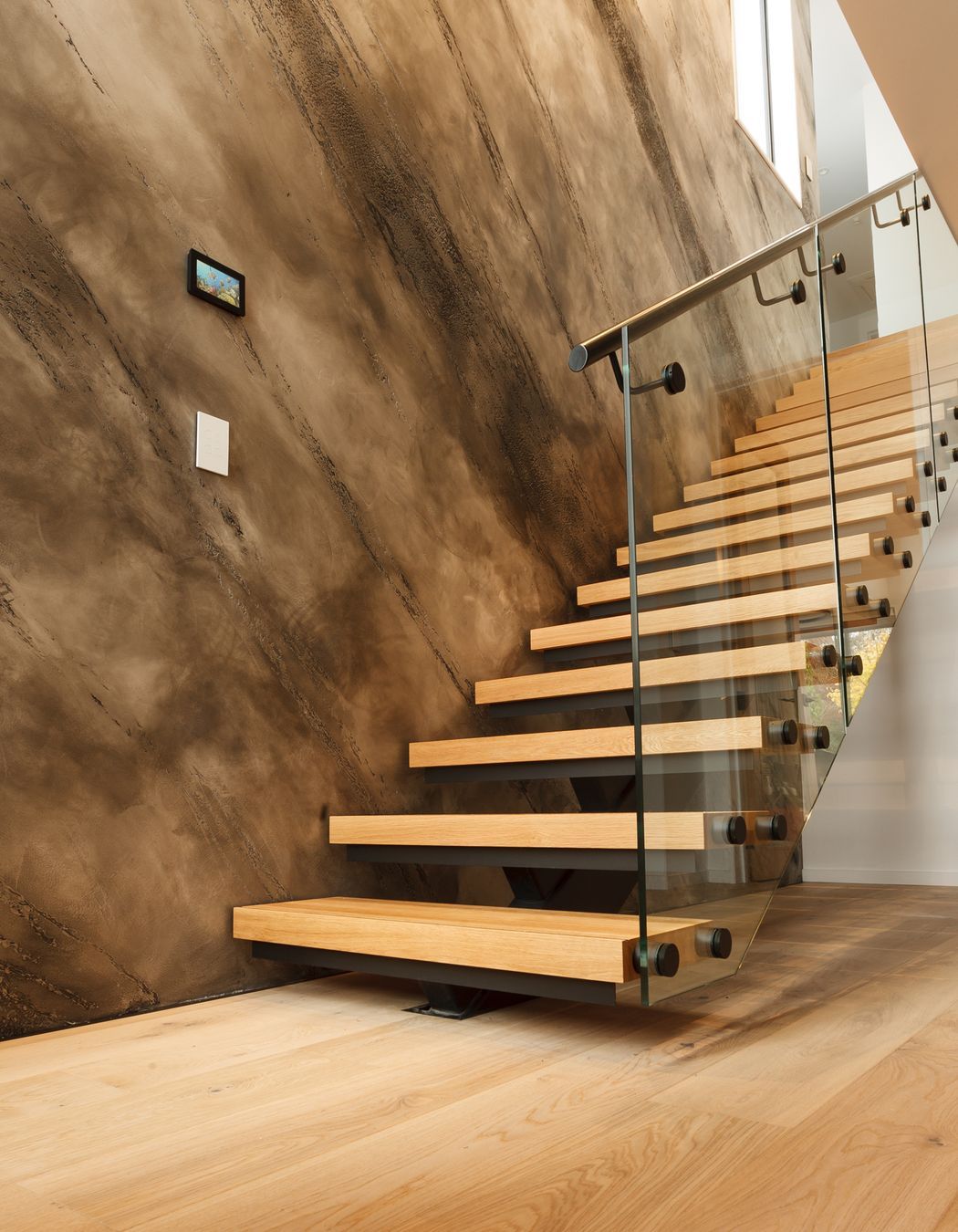 ArchiPro Project Summary - A bespoke Christchurch residence showcasing innovative finishes and high-quality materials, featuring a striking stairwell with Italian Eco-style ‘Crazy Stone’ lime plaster, expertly crafted by Home Trends Builders and Bruce Cooper Plastering.