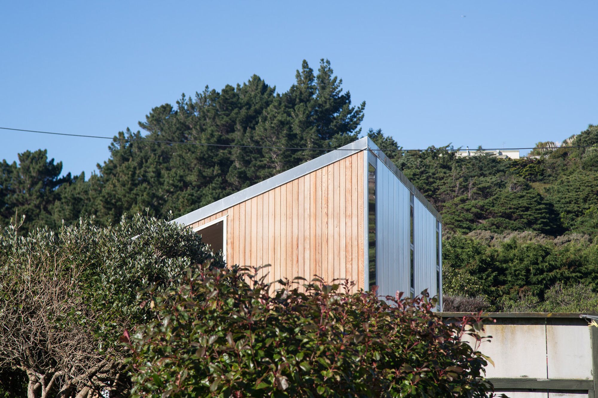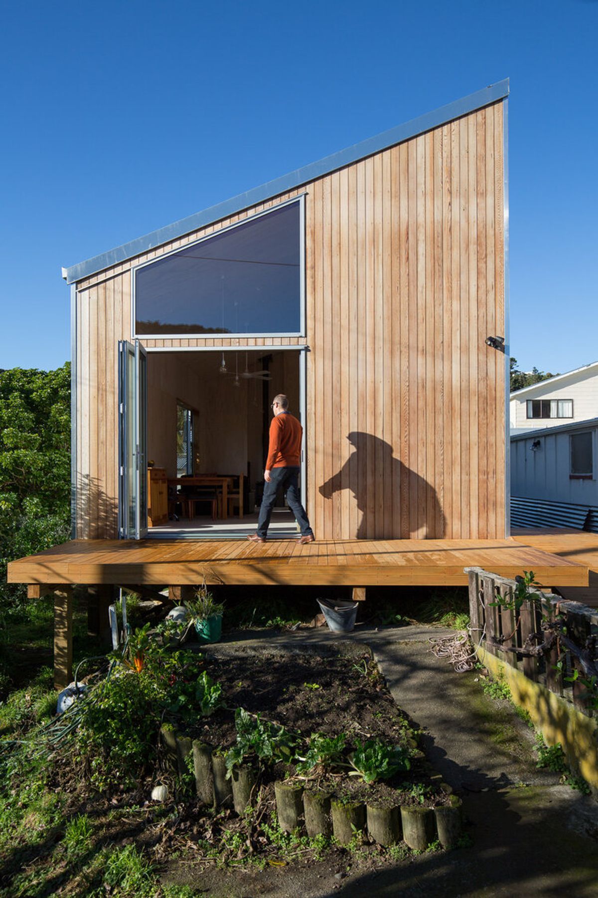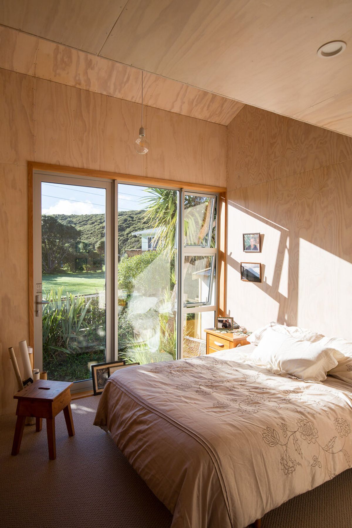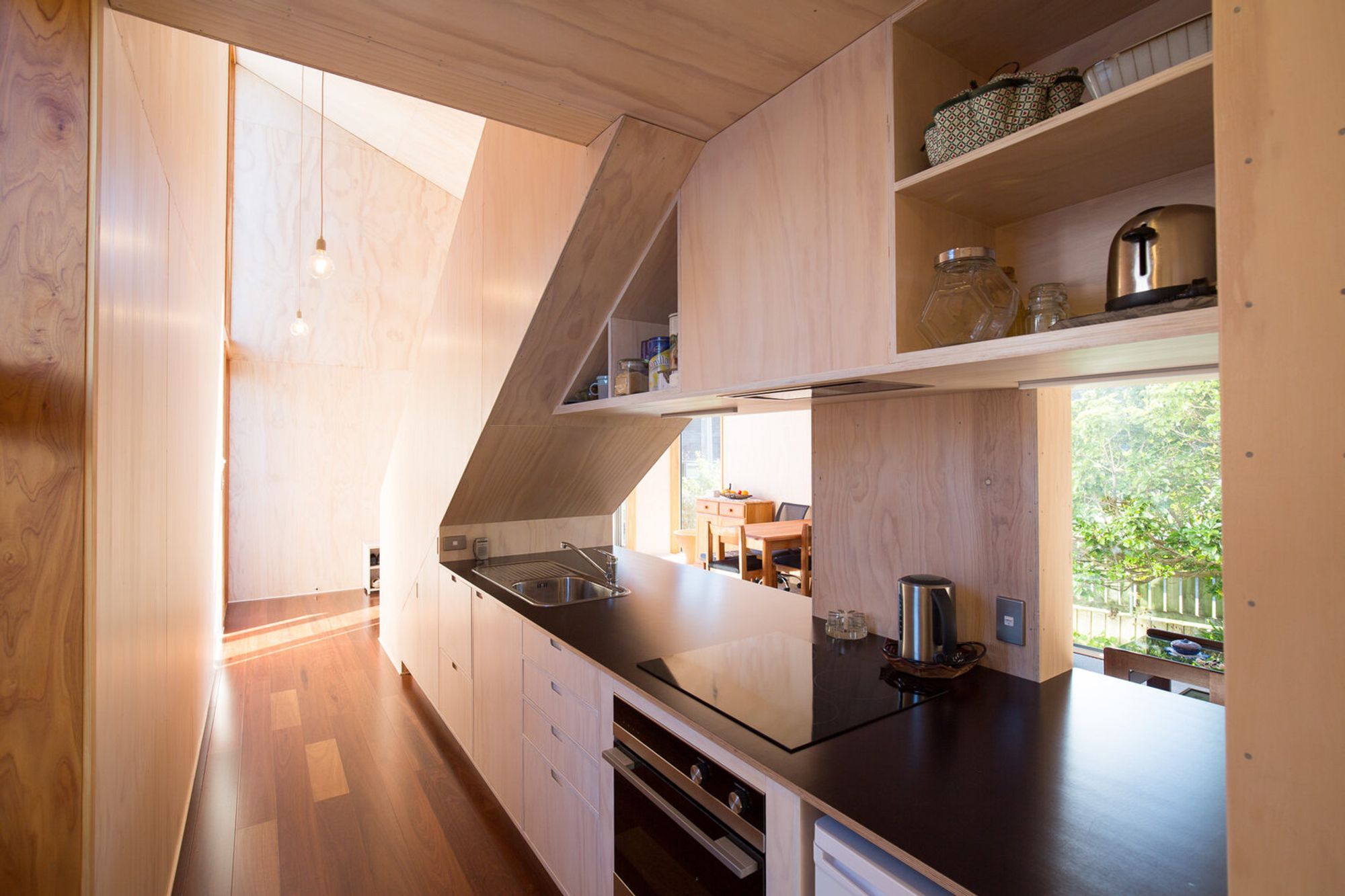 ArchiPro Project Summary - A cost-effective secondary dwelling in Hongoeka Bay, featuring a minimalist footprint and a double-height space with a mezzanine writing studio, designed with extensive family involvement and serving as a precursor to the innovative prefab solution 'Fab-one'.