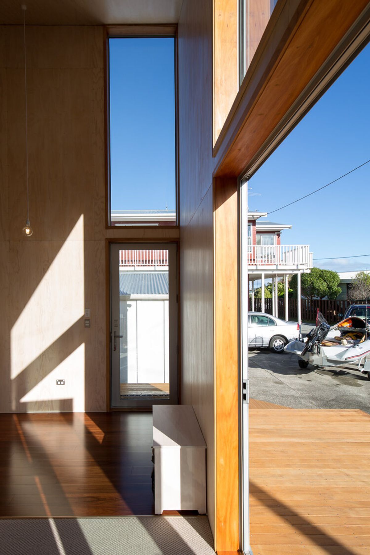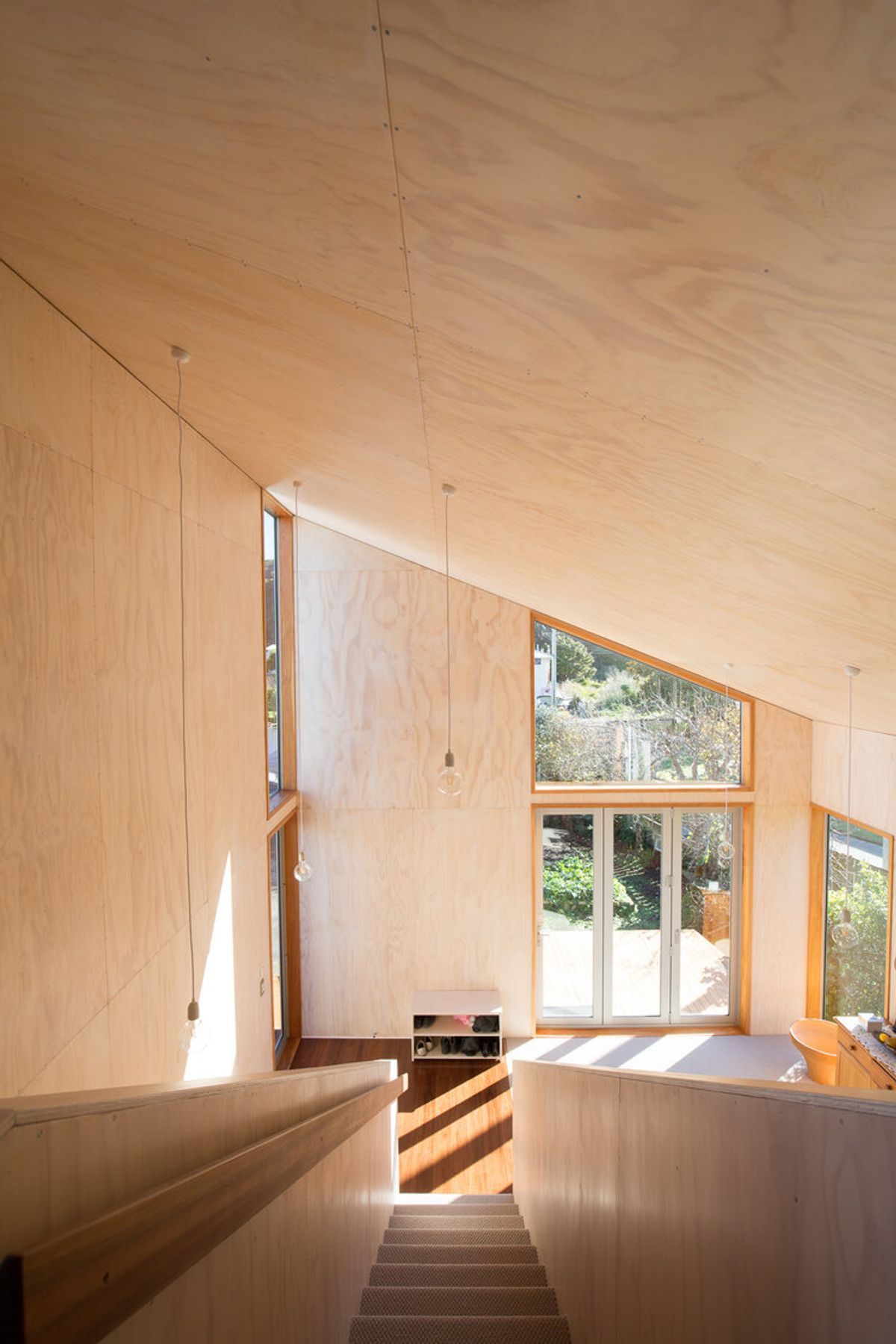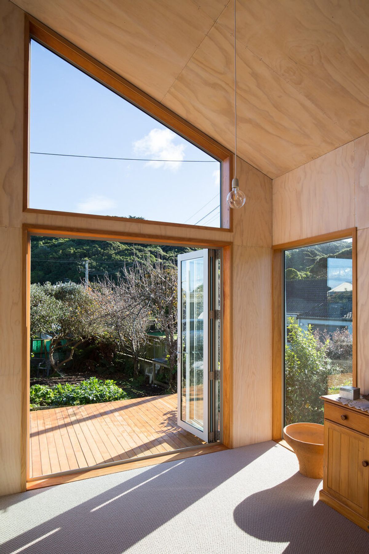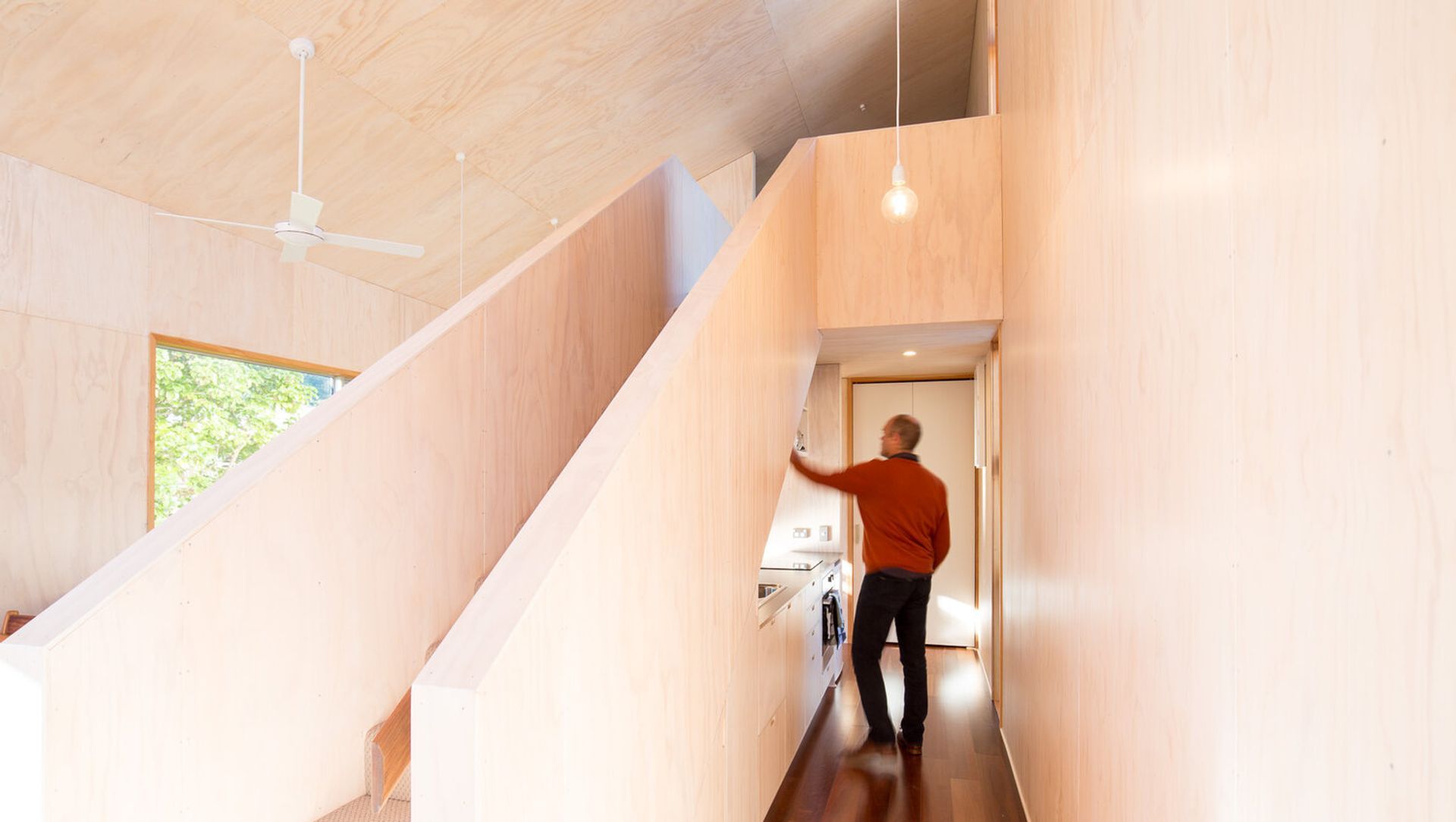 ArchiPro Project Summary - A cost-effective secondary dwelling in Hongoeka Bay, featuring a minimalist footprint and a double-height space with a mezzanine writing studio, designed with extensive family involvement and serving as a precursor to the innovative prefab solution 'Fab-one'.