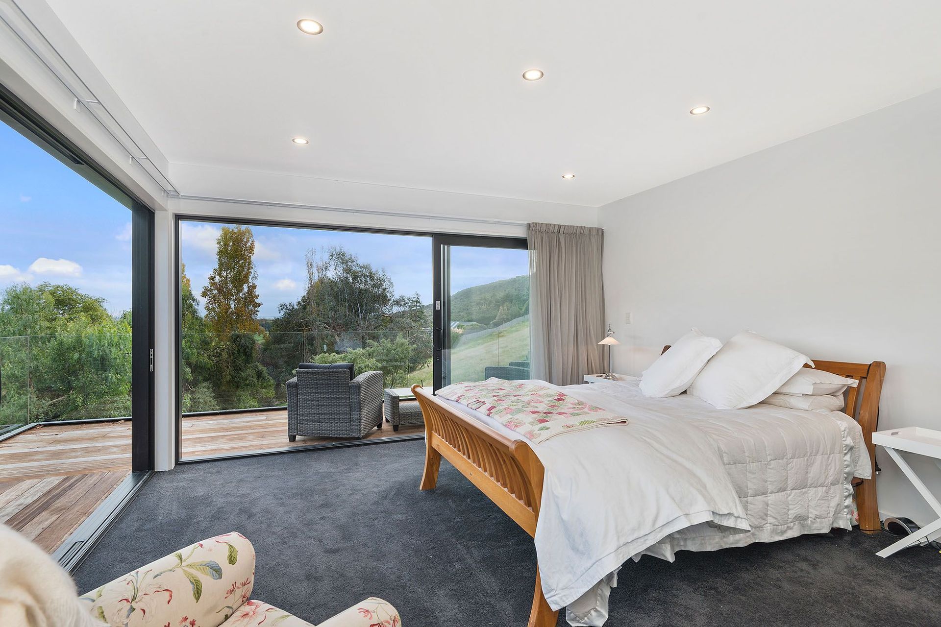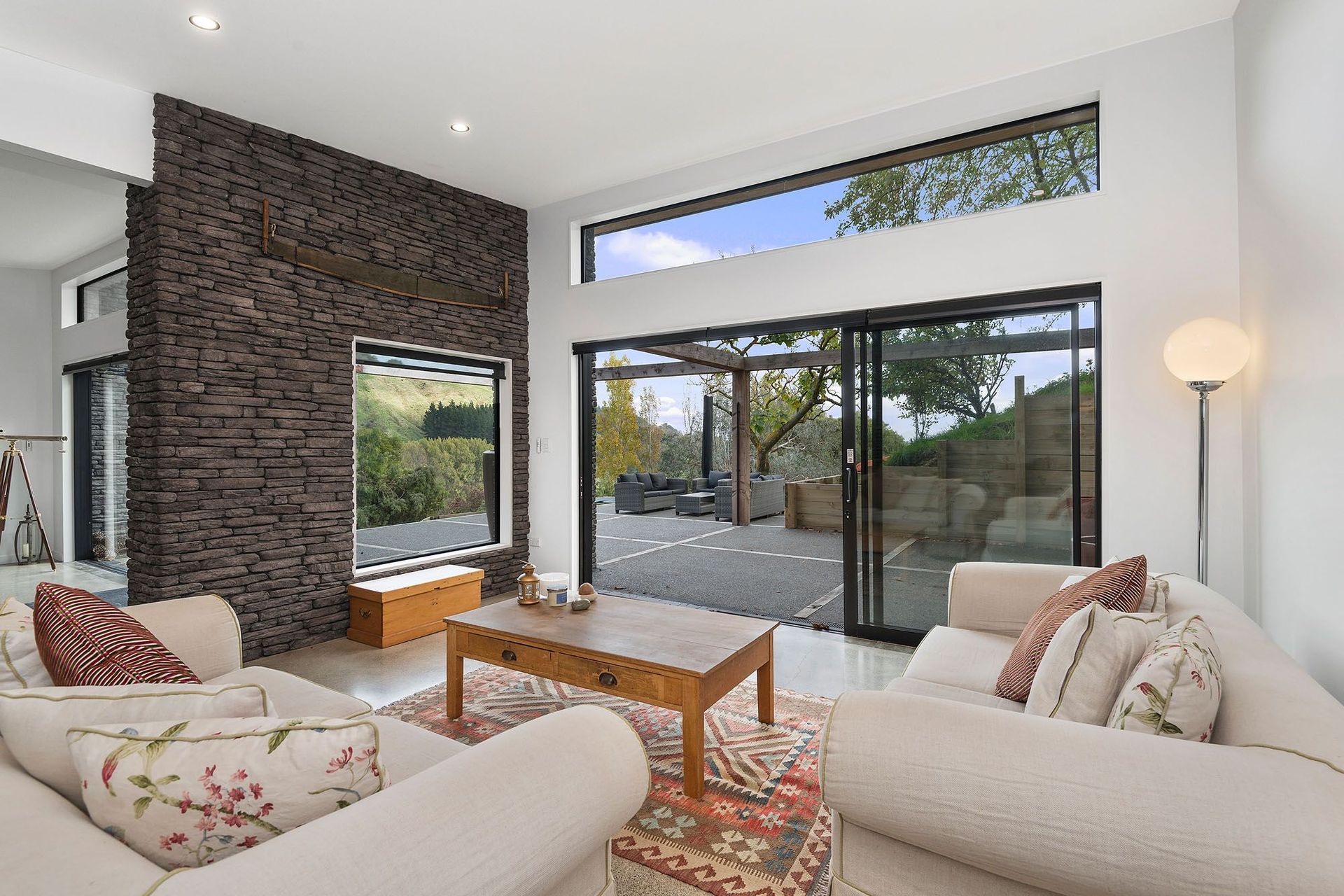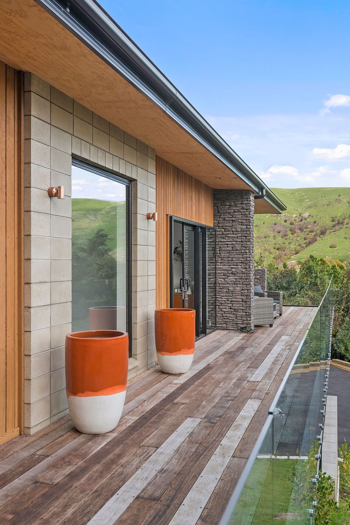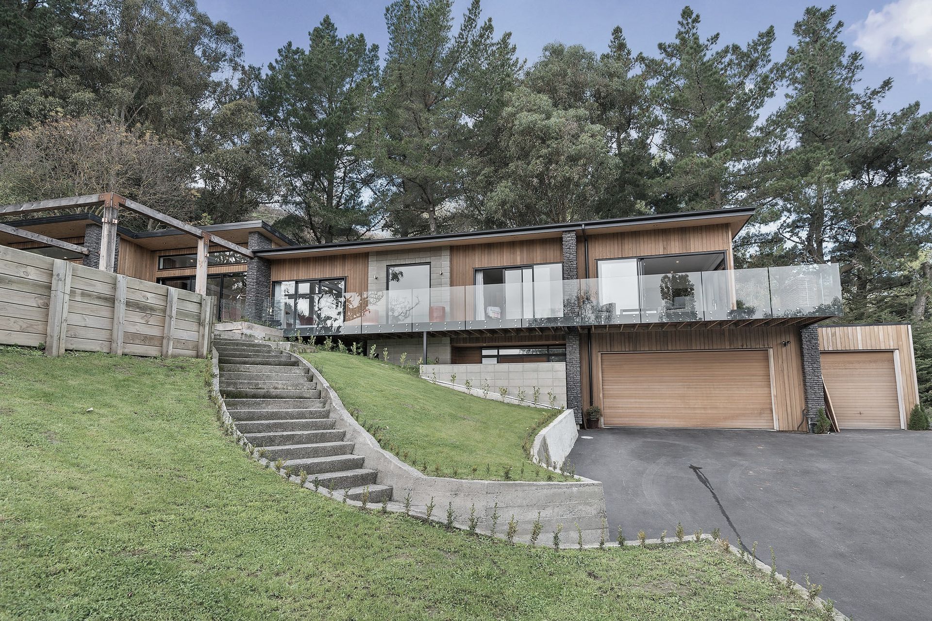 ArchiPro Project Summary - A thoughtfully designed split-level home in Hoon Hay Valley, featuring expansive glass views, distinct living zones, and a harmonious blend of raw materials, all while respecting the site's natural contours and providing ample outdoor entertaining spaces.