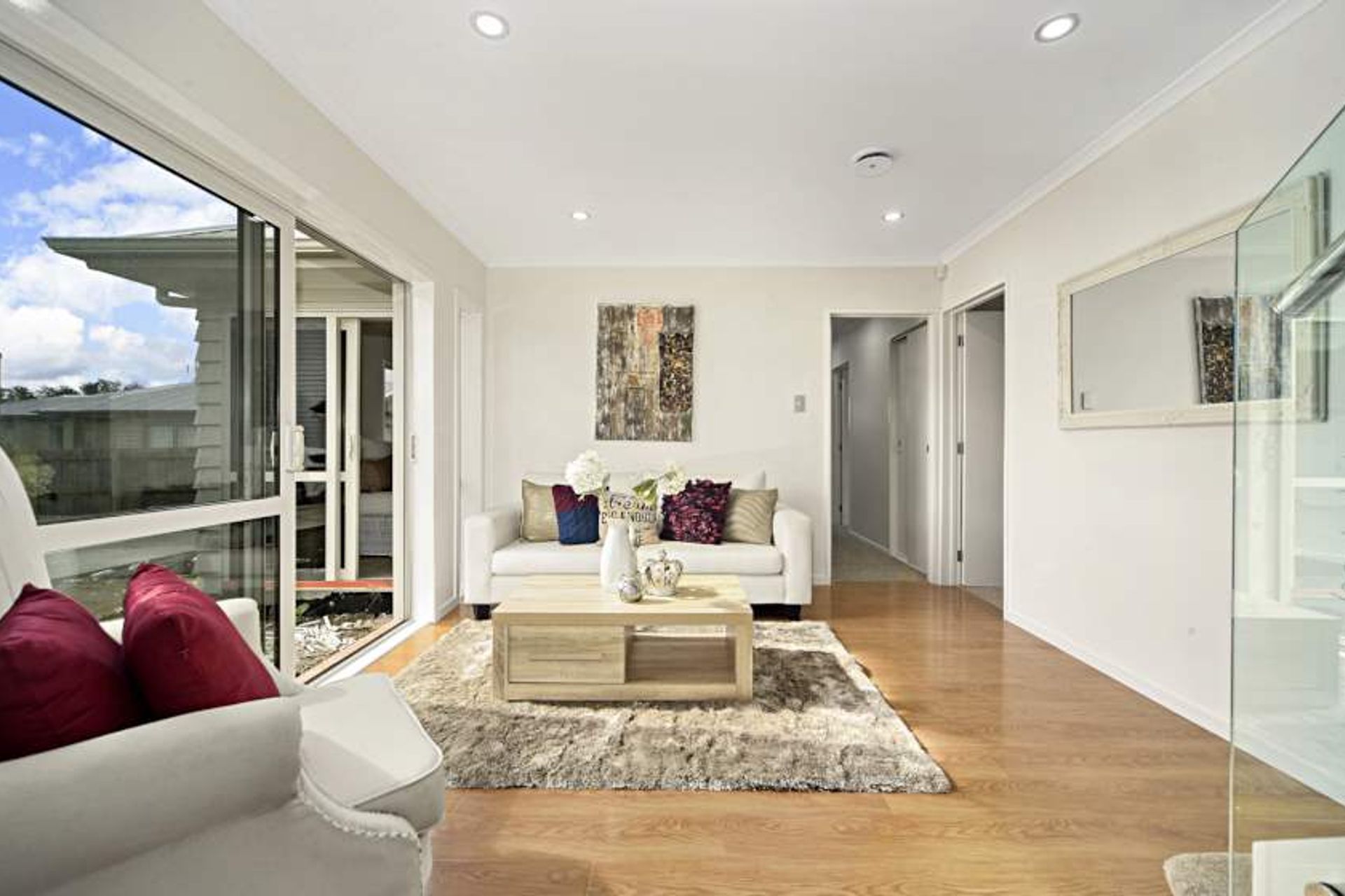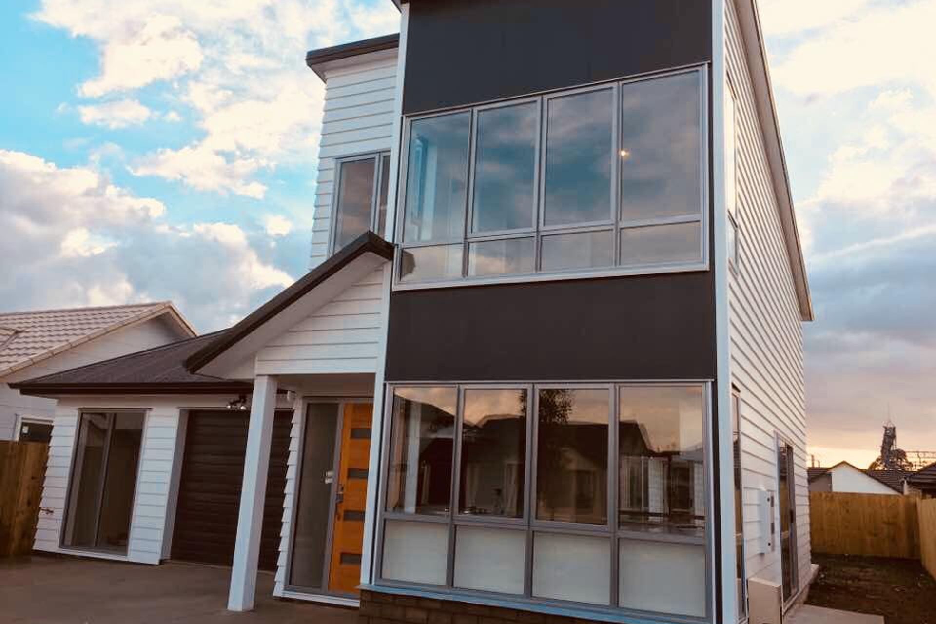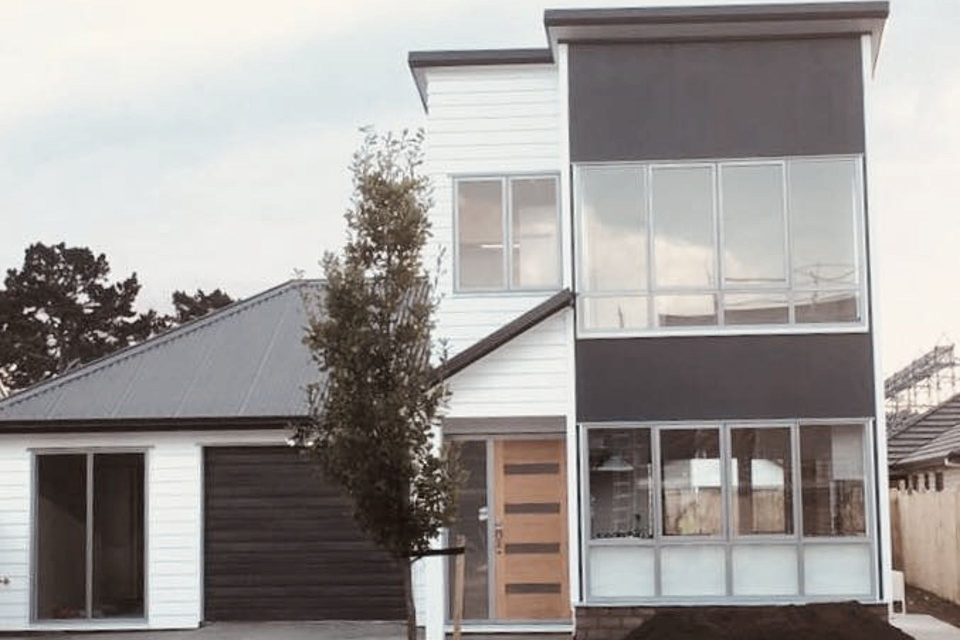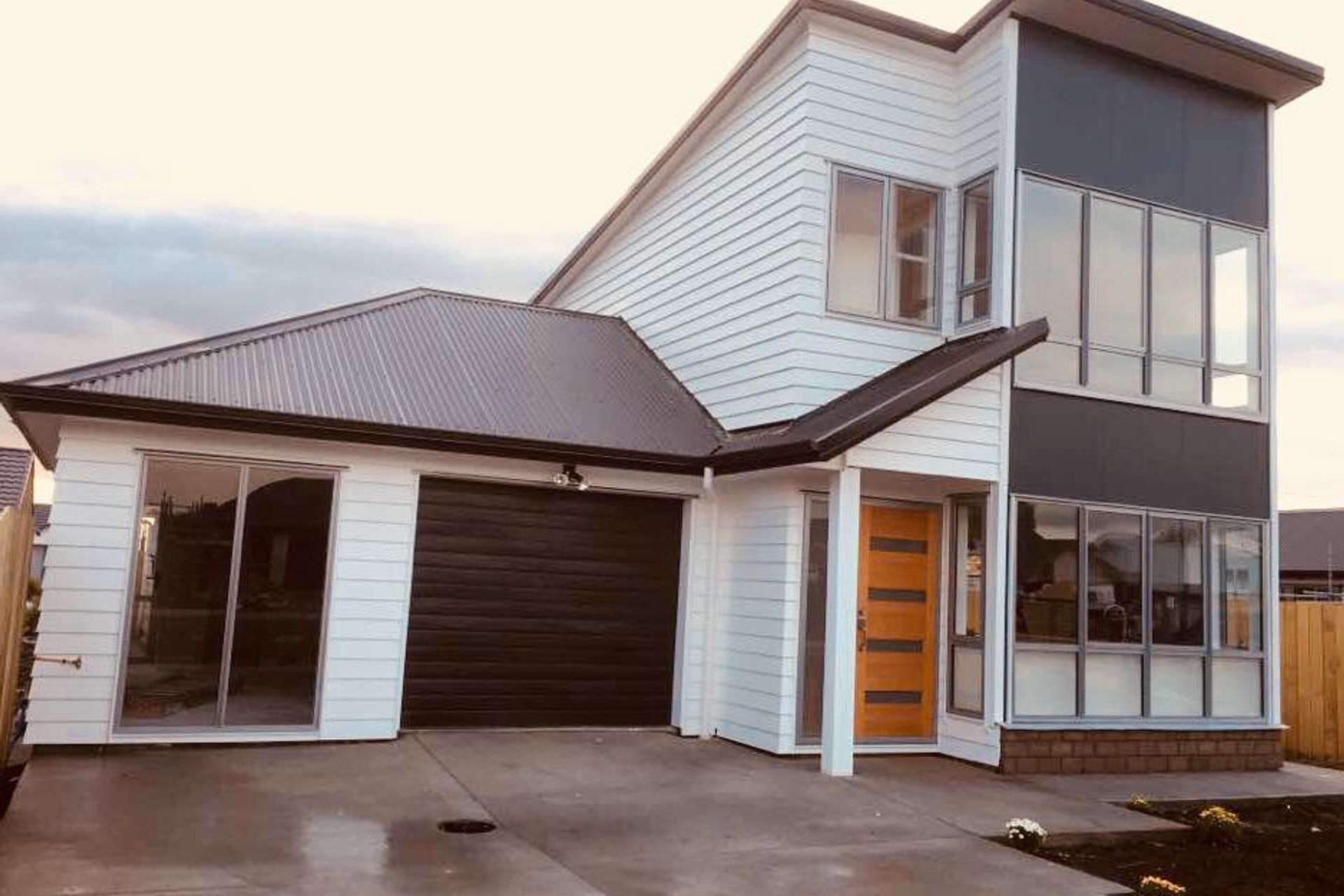 ArchiPro Project Summary - Contemporary two-level houses in Takanini featuring four bedrooms, a single garage, and a stylish mezzanine, all designed with timber weatherboard cladding and long run roofing.