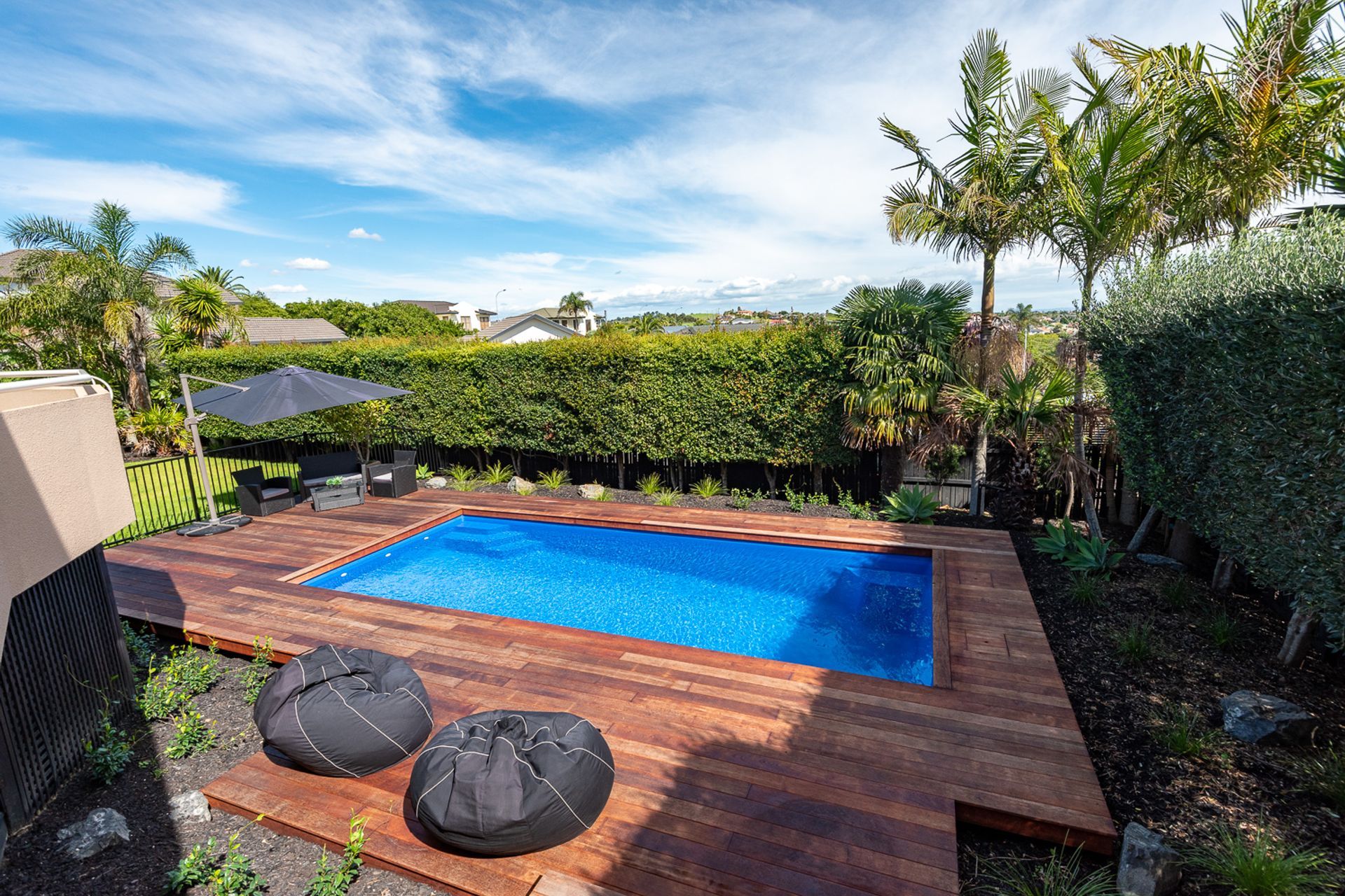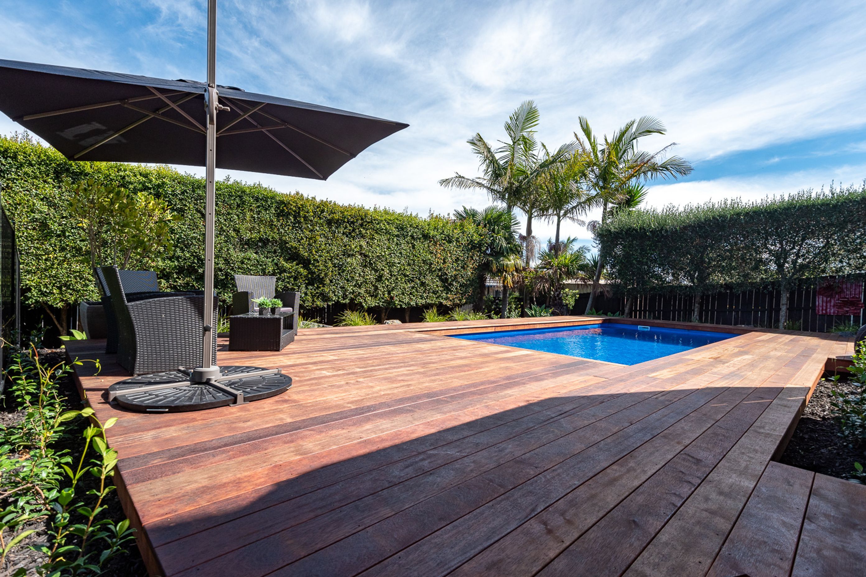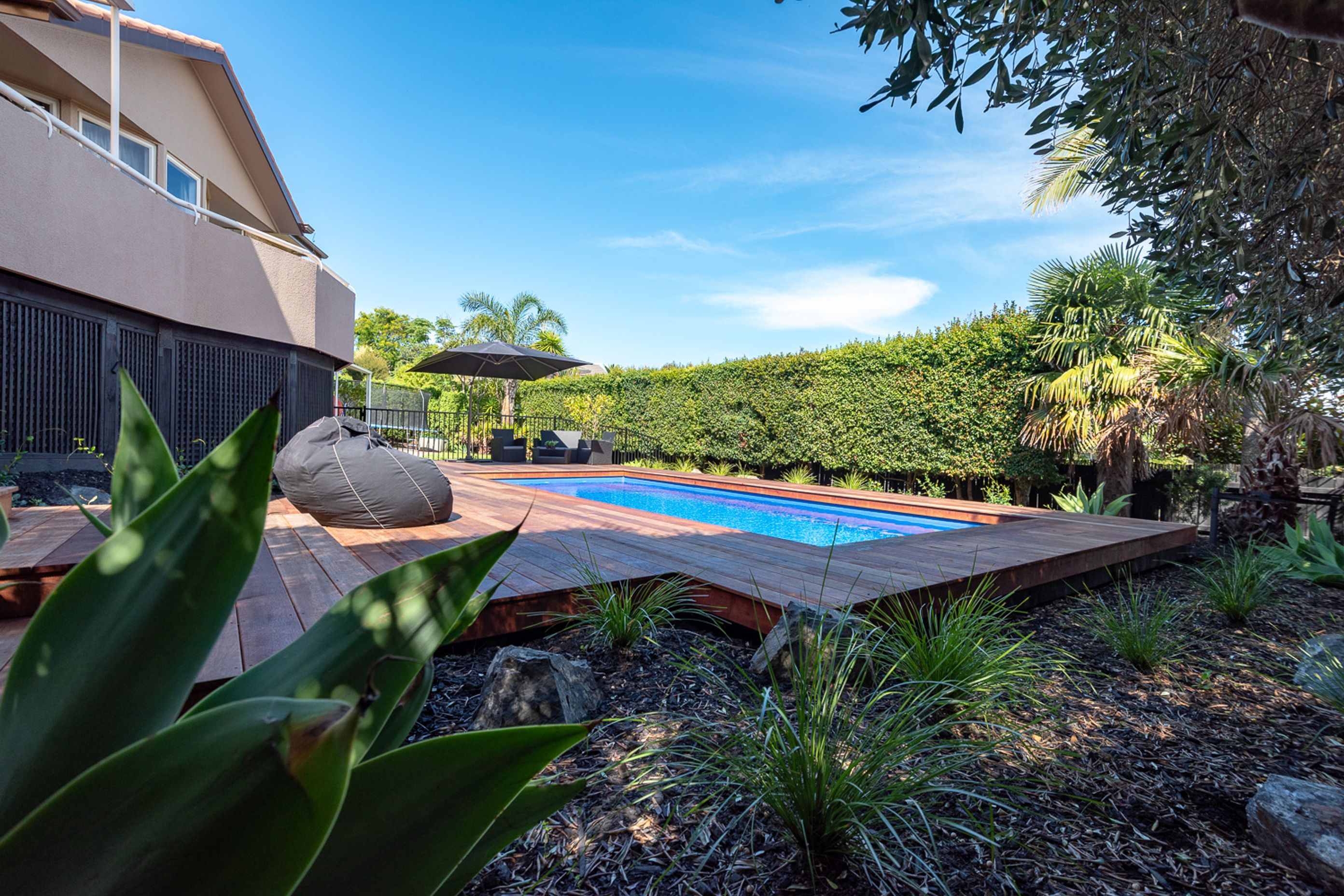 ArchiPro Project Summary - A harmonious blend of natural materials and modern design, featuring a timber deck and luxurious swimming pool.