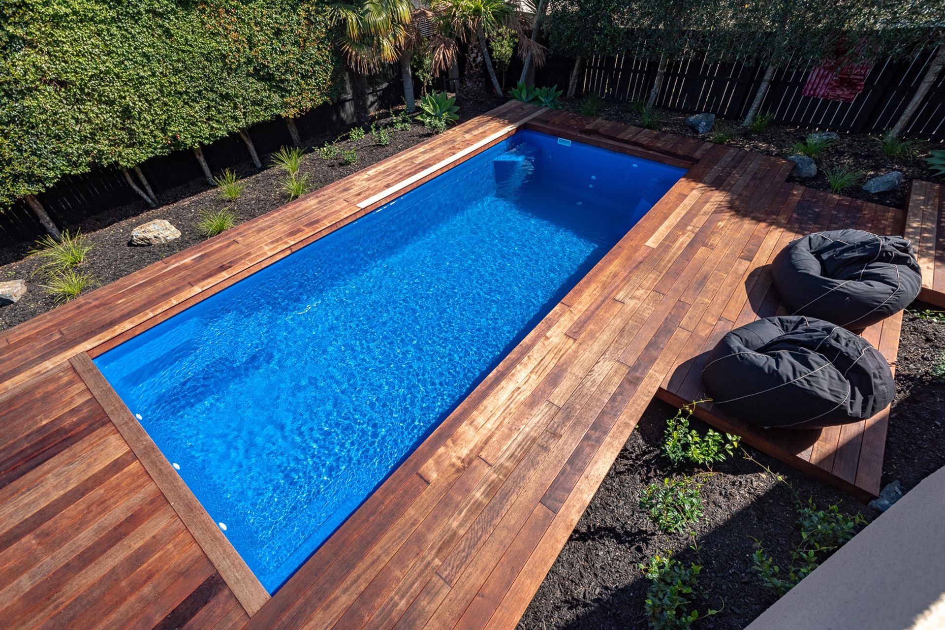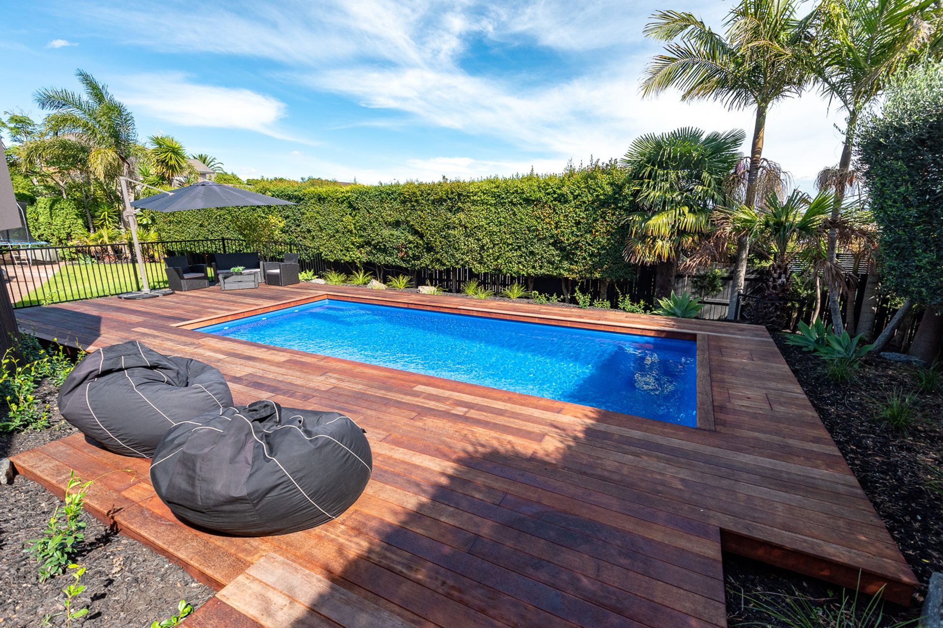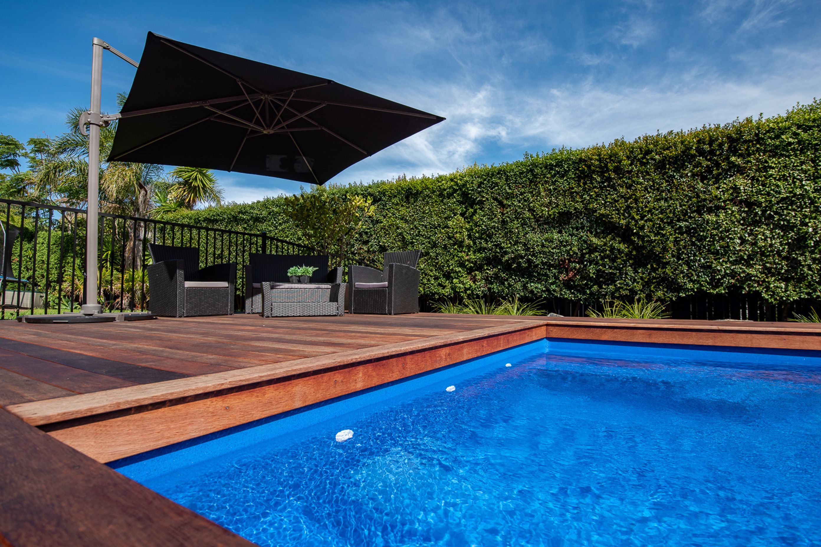 ArchiPro Project Summary - A harmonious blend of natural materials and modern design, featuring a timber deck and luxurious swimming pool.