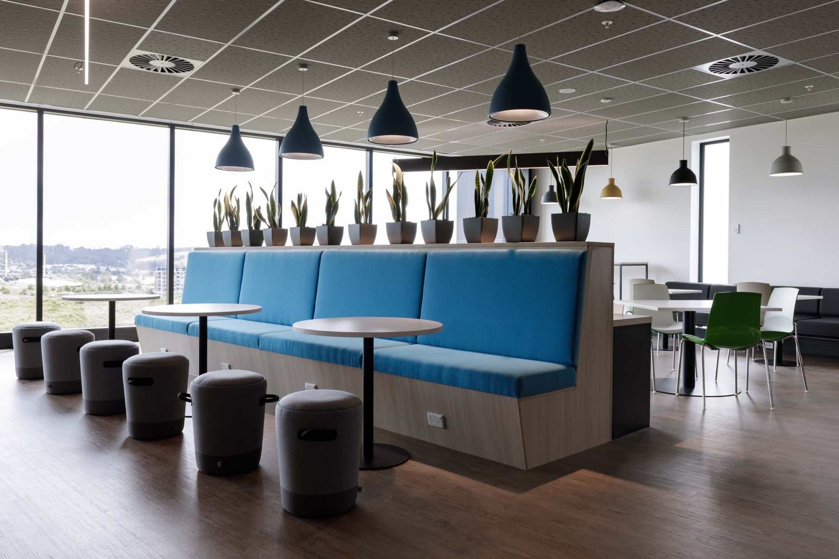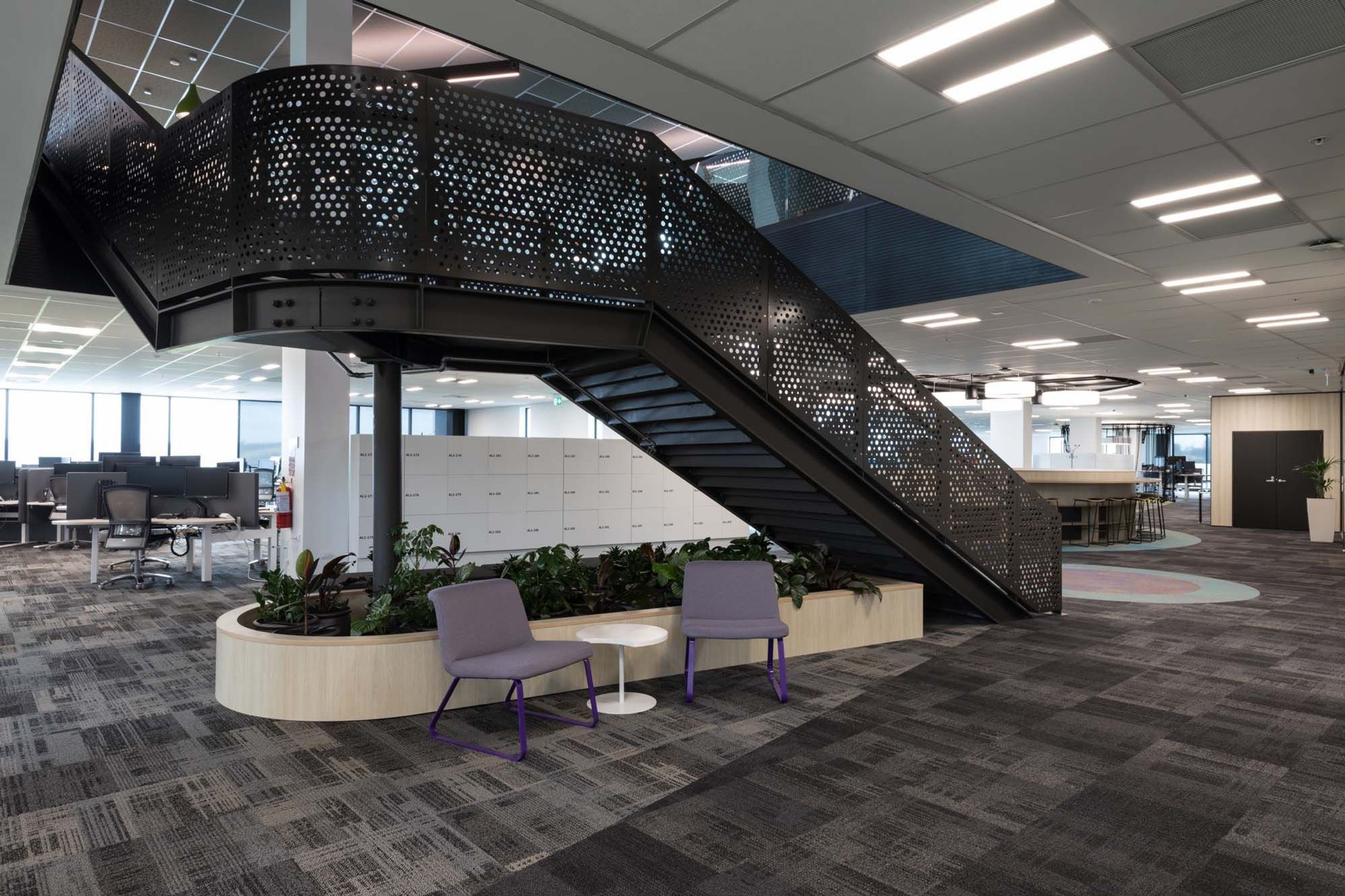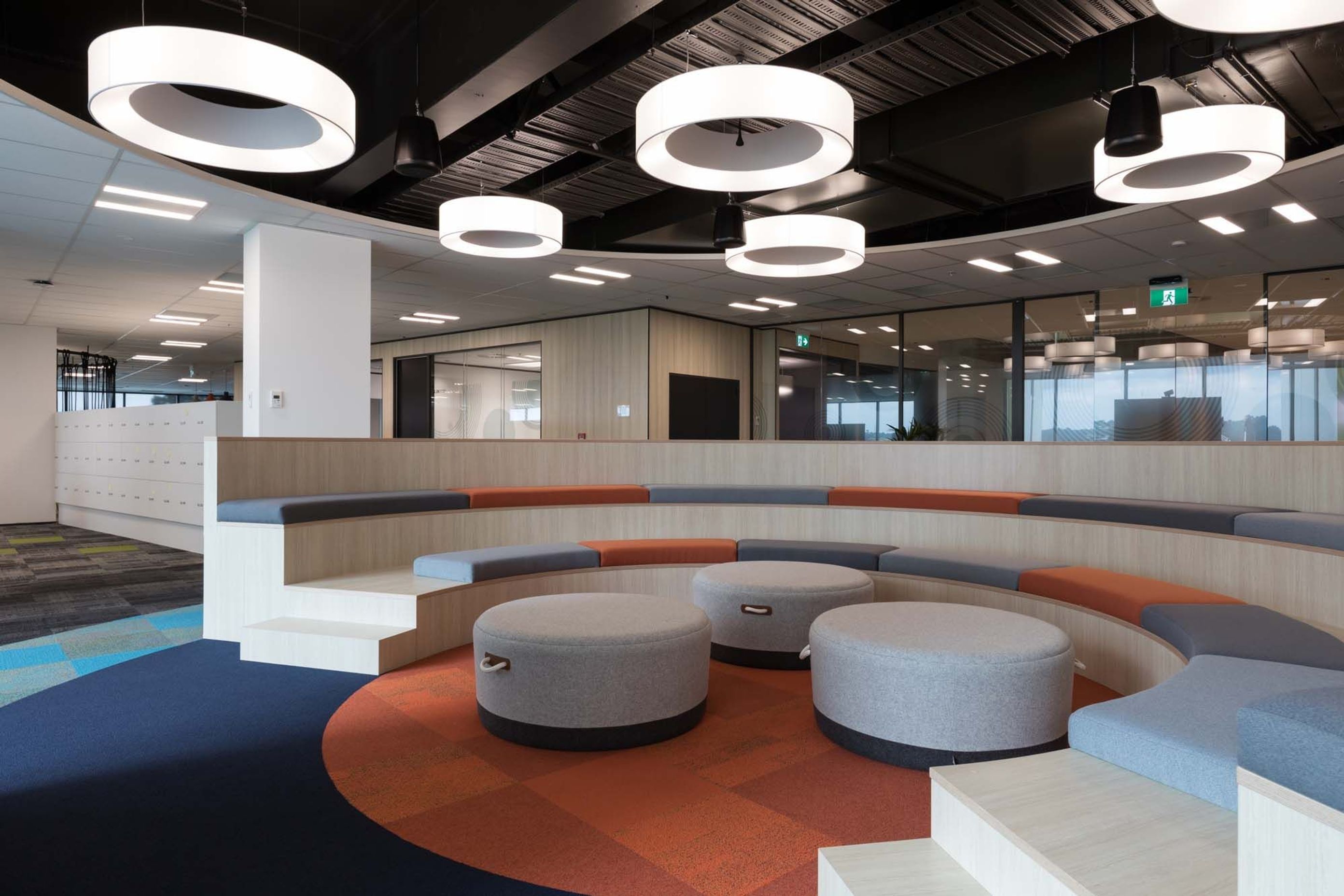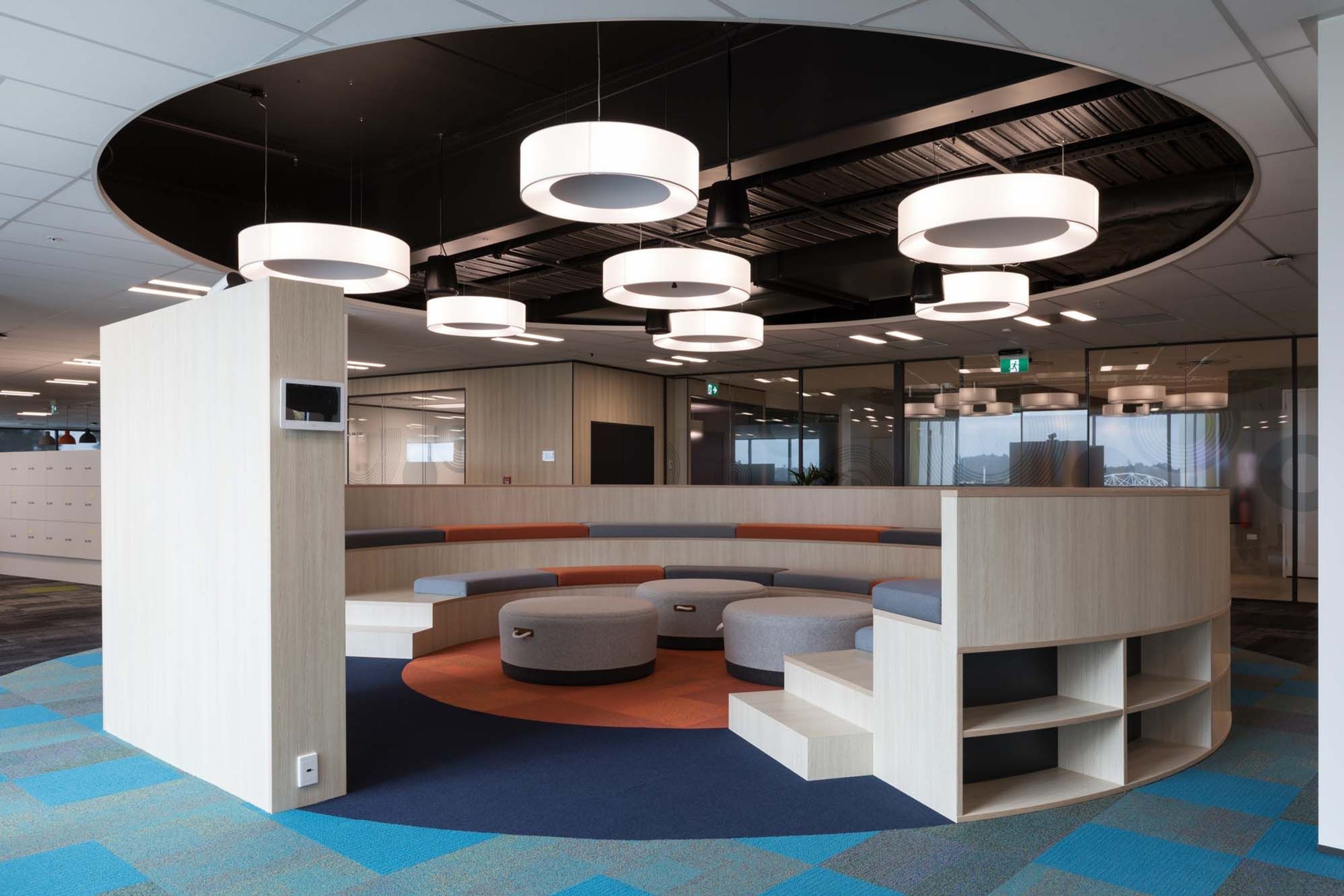 ArchiPro Project Summary - IAG Albany: A sophisticated office fitout featuring bespoke joinery, including oak veneer cladding, custom kitchenette, and an amphitheatre-like meeting area, showcasing exceptional craftsmanship and attention to detail by Haydn & Rollett Construction.