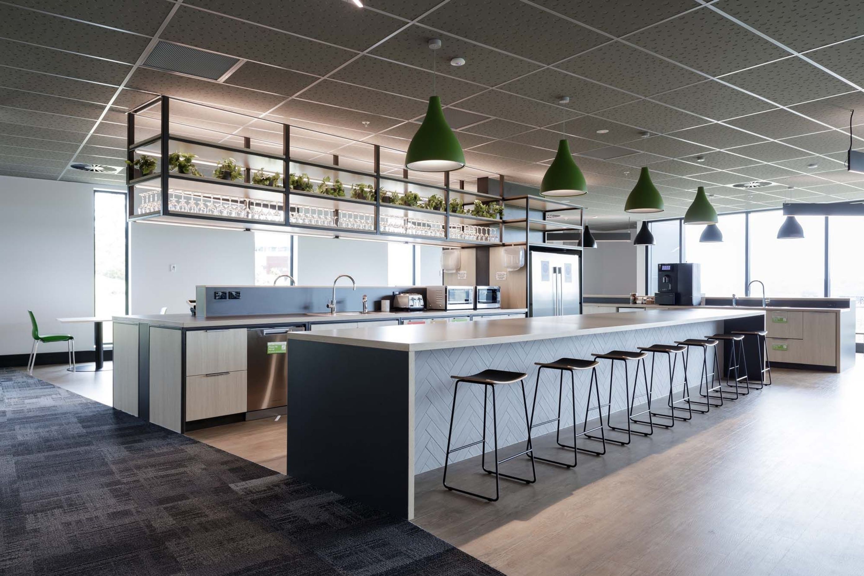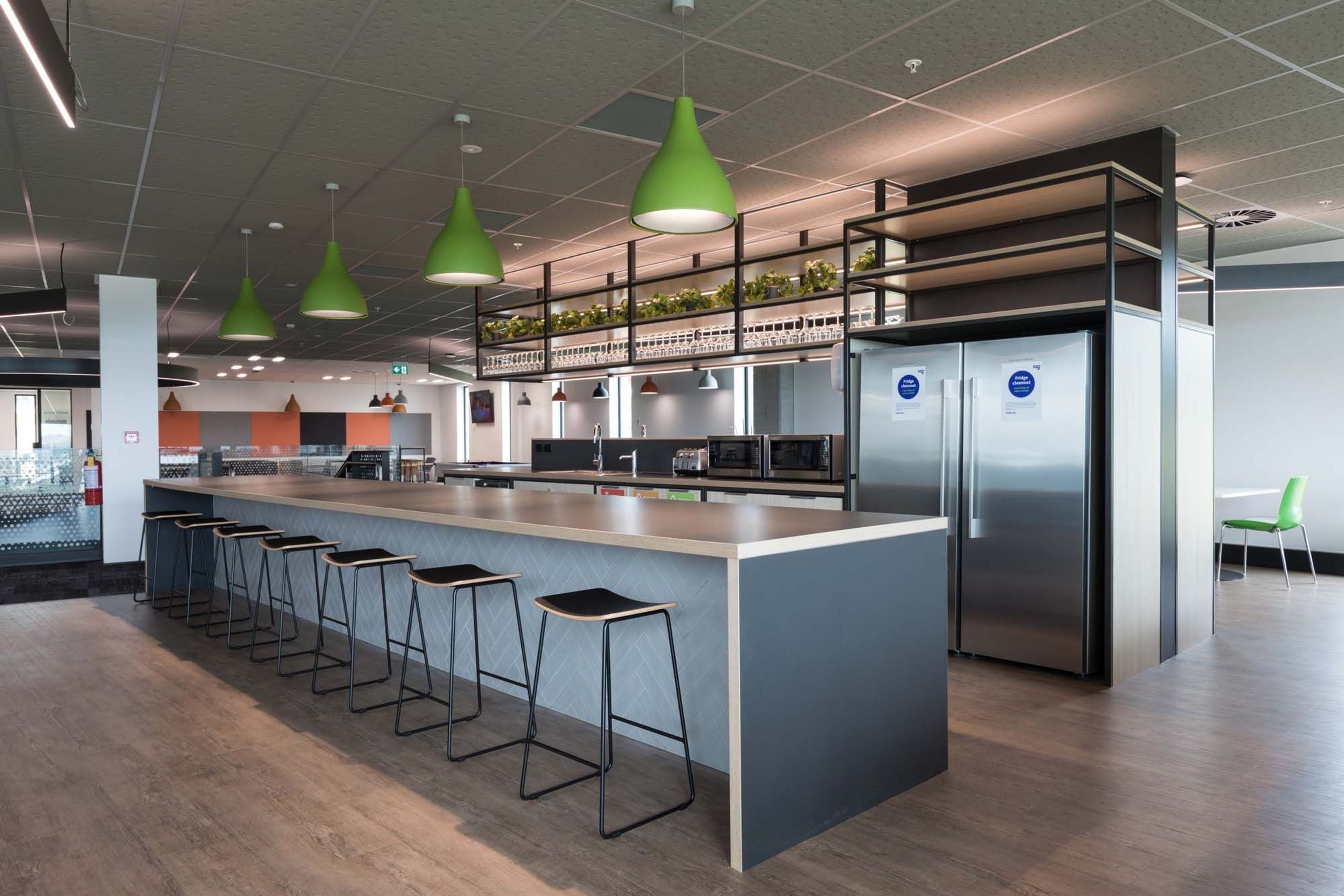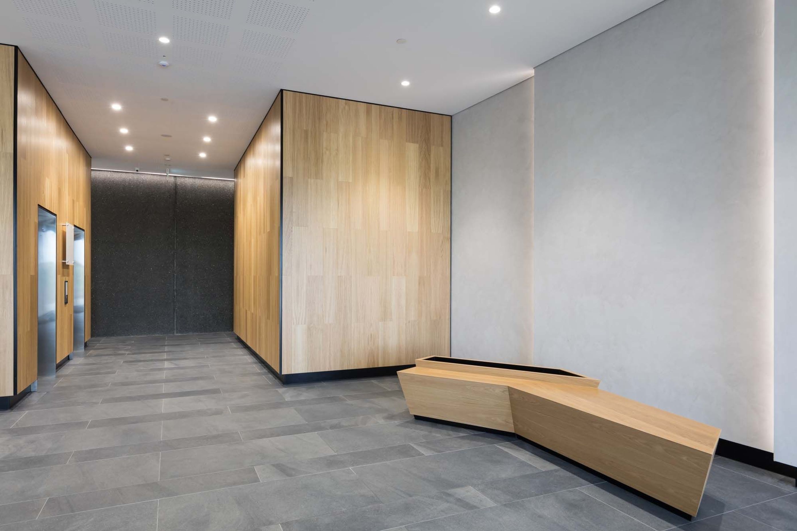 ArchiPro Project Summary - IAG Albany: A sophisticated office fitout featuring bespoke joinery, including oak veneer cladding, custom kitchenette, and an amphitheatre-like meeting area, showcasing exceptional craftsmanship and attention to detail by Haydn & Rollett Construction.