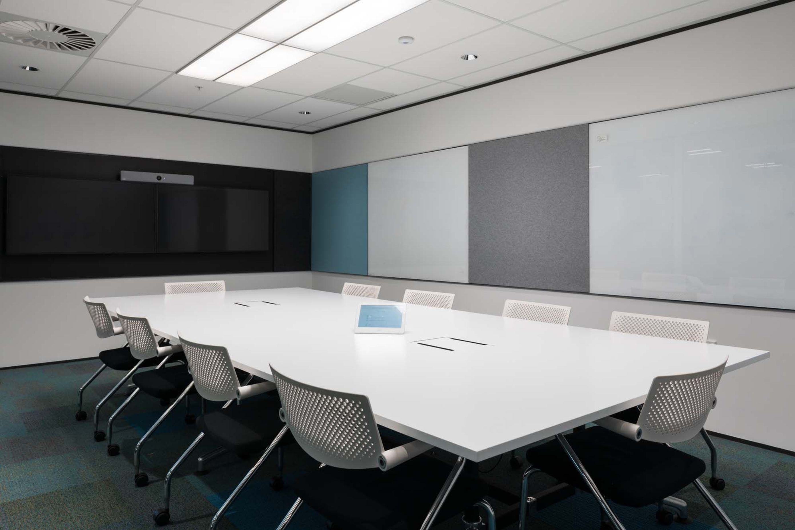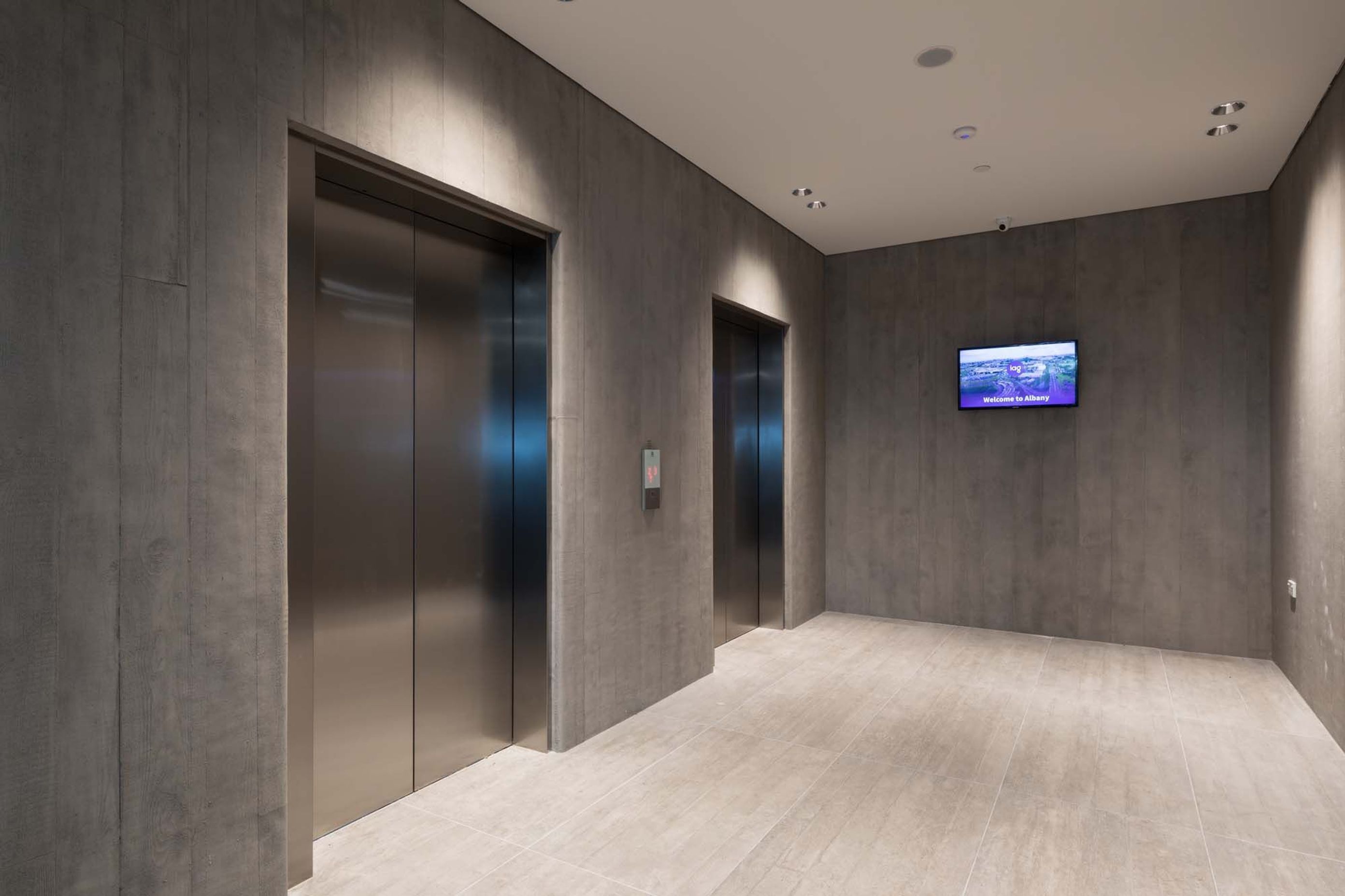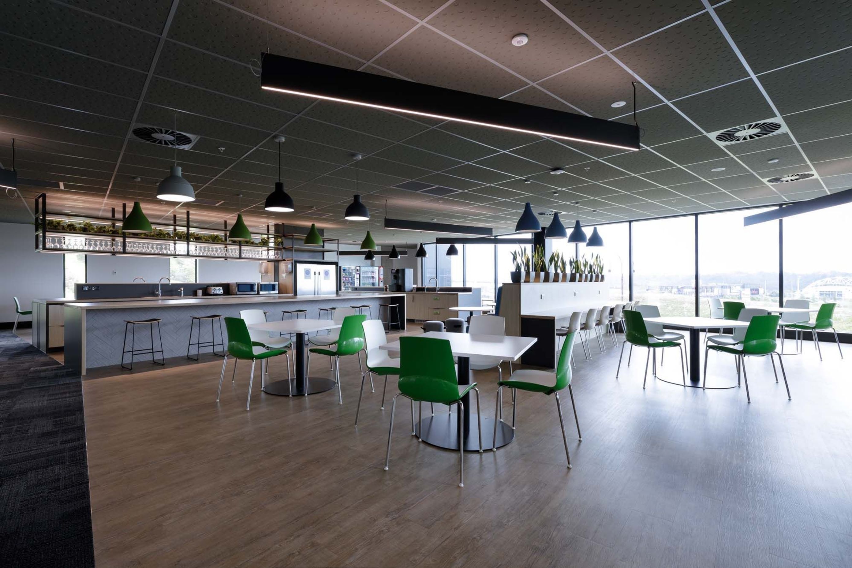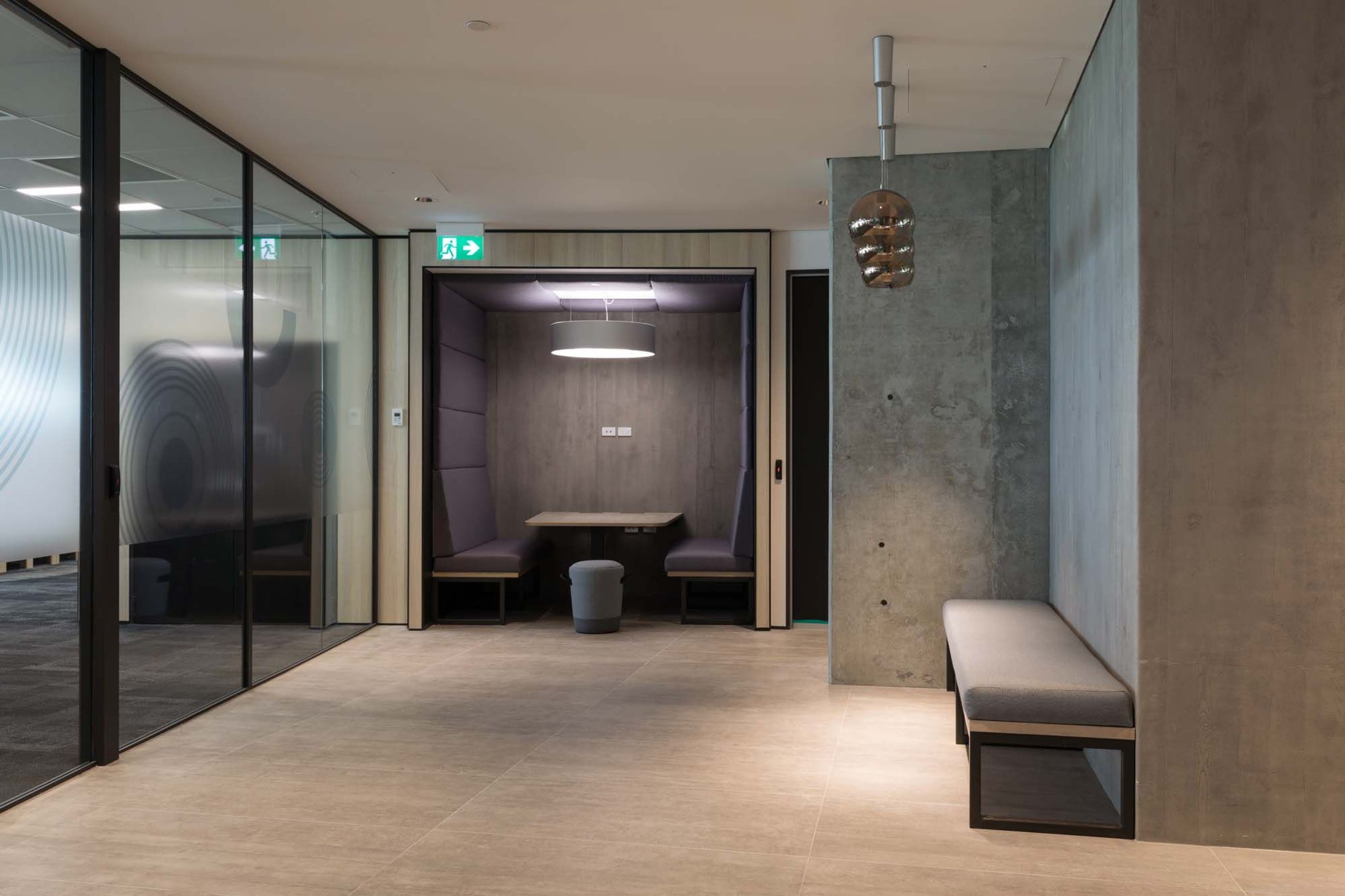 ArchiPro Project Summary - IAG Albany: A sophisticated office fitout featuring bespoke joinery, including oak veneer cladding, custom kitchenette, and an amphitheatre-like meeting area, showcasing exceptional craftsmanship and attention to detail by Haydn & Rollett Construction.
