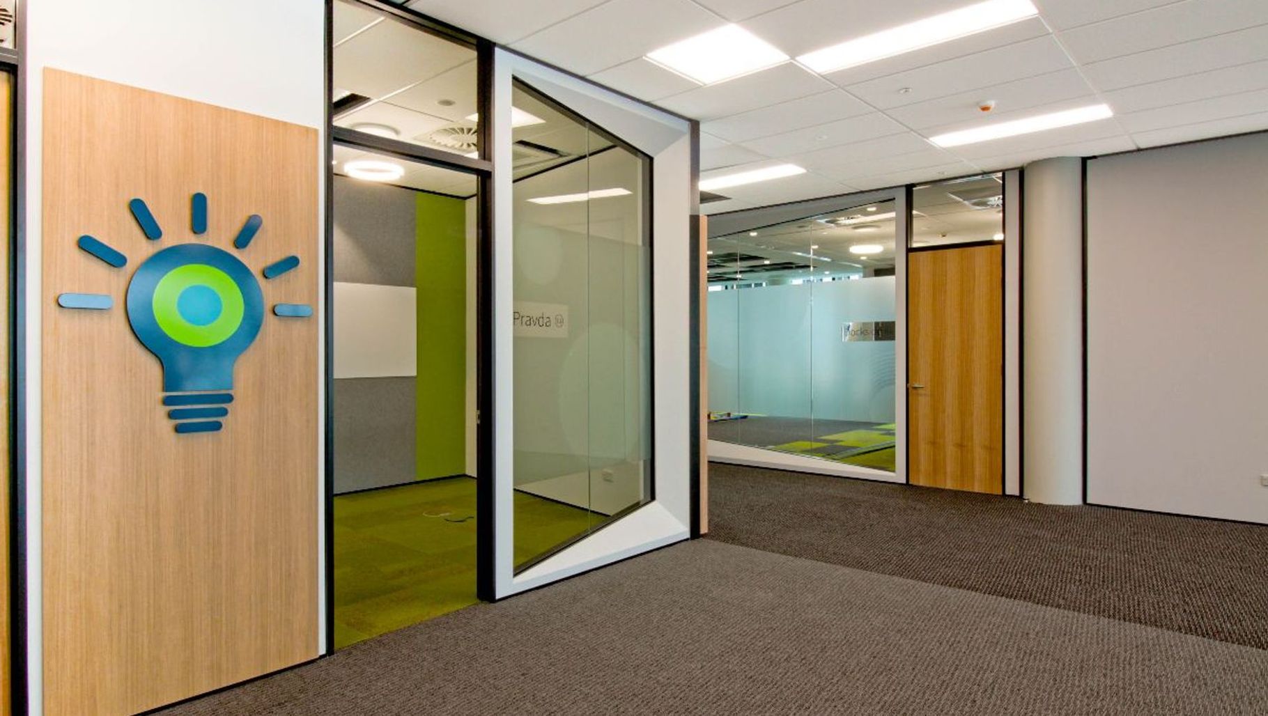 ArchiPro Project Summary - IAG Offices featuring Eclipse aluminium partitioning across three floors, providing breakout spaces and office partitions with stunning views over Wellington Harbour.