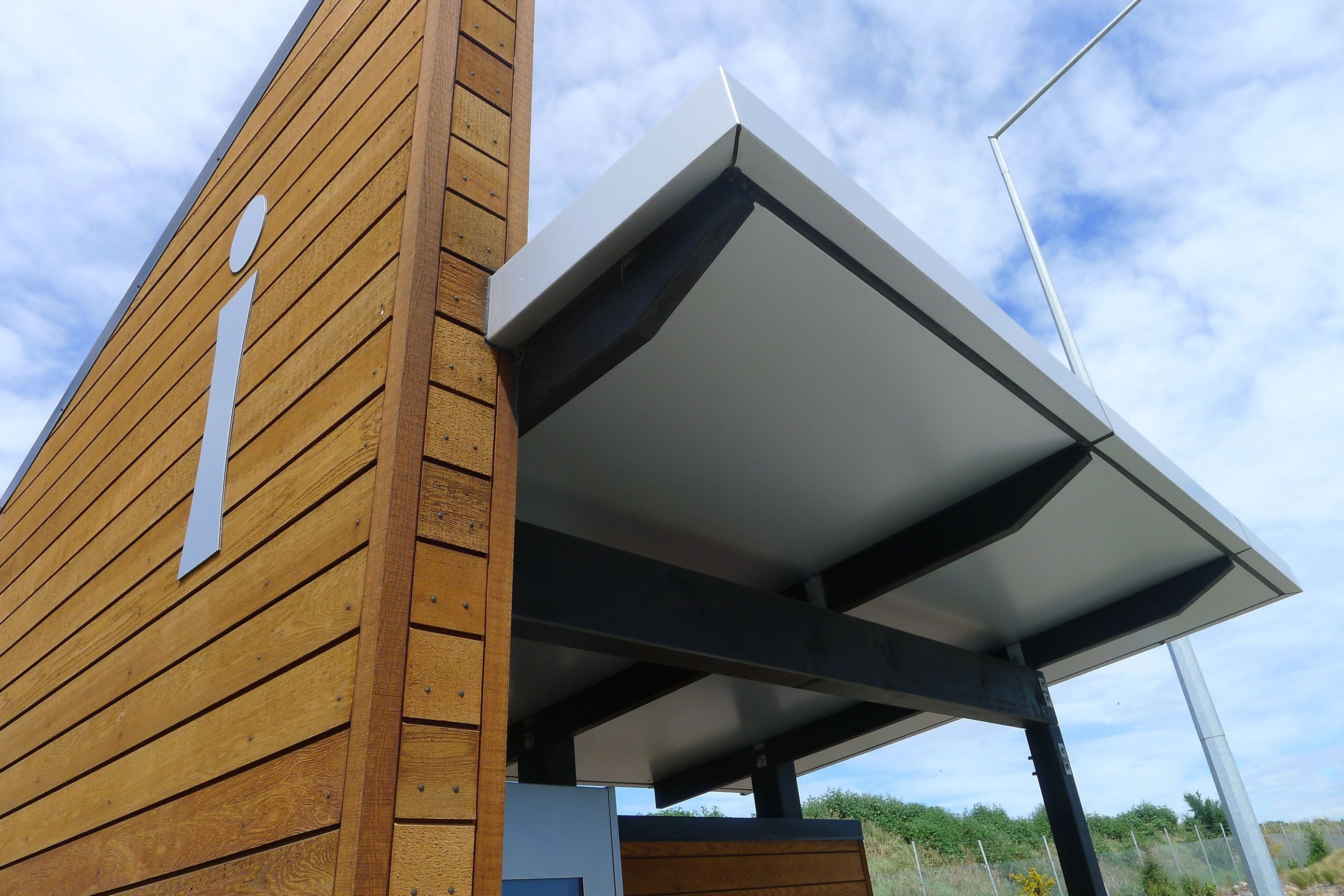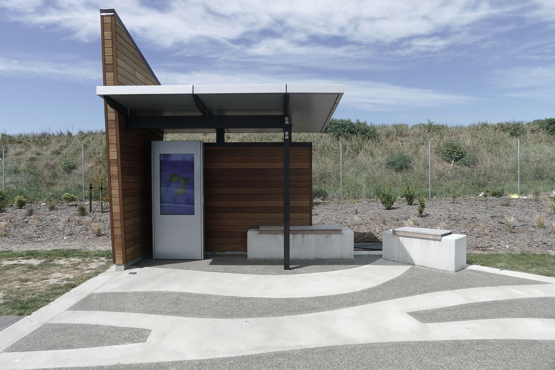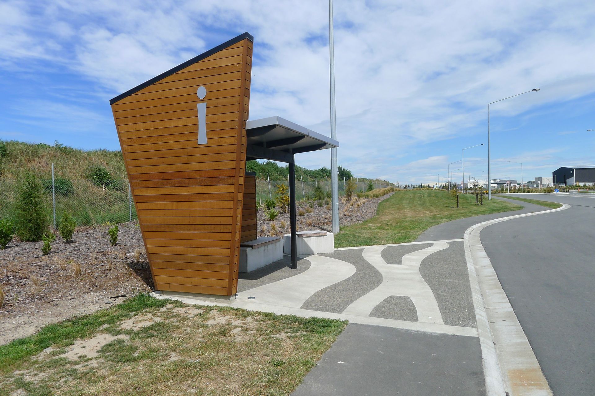 ArchiPro Project Summary - A sculptural info kiosk designed to guide and inform visitors at IZONE Southern Business Hub, reflecting the themes and materiality of the surrounding urban landscape.