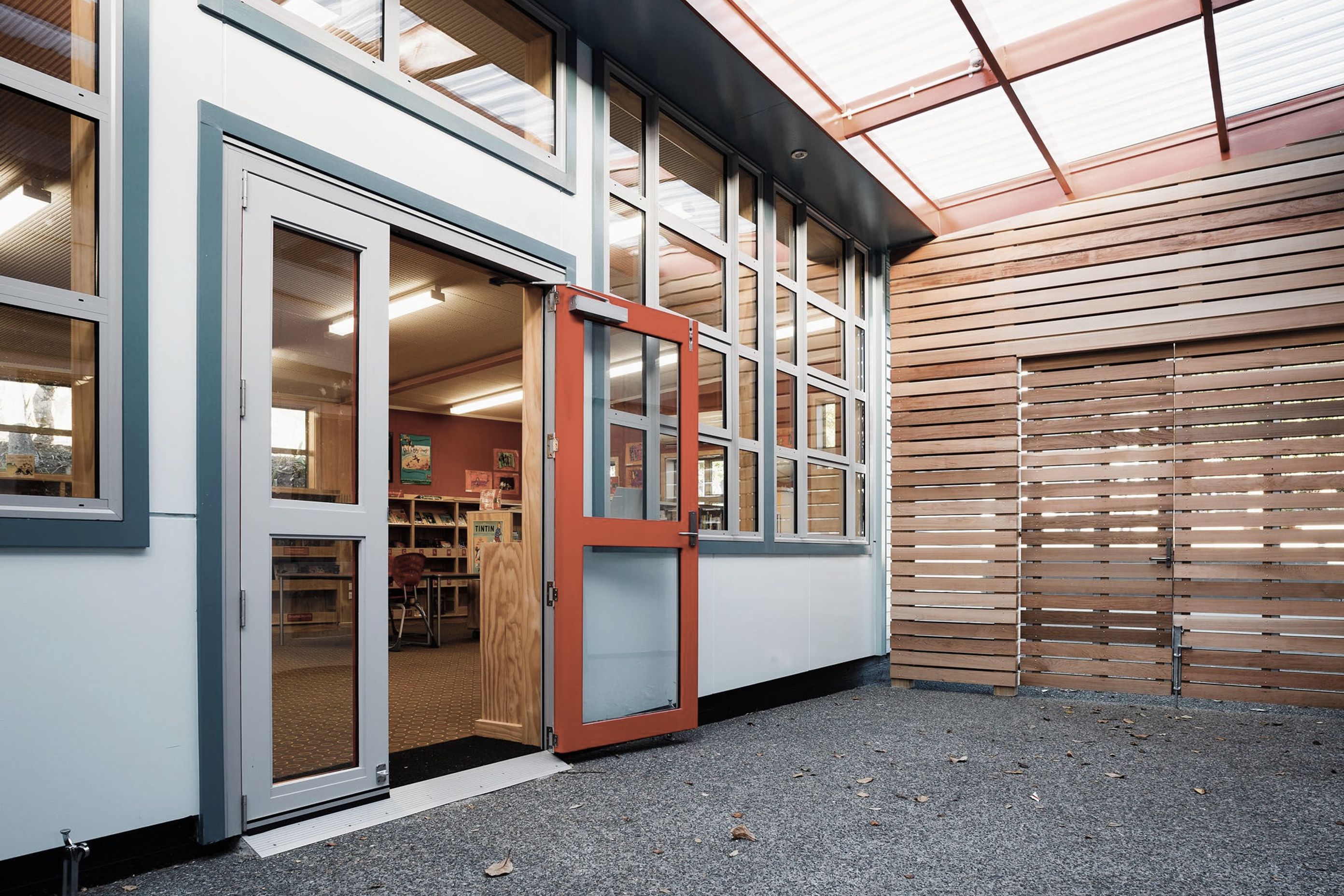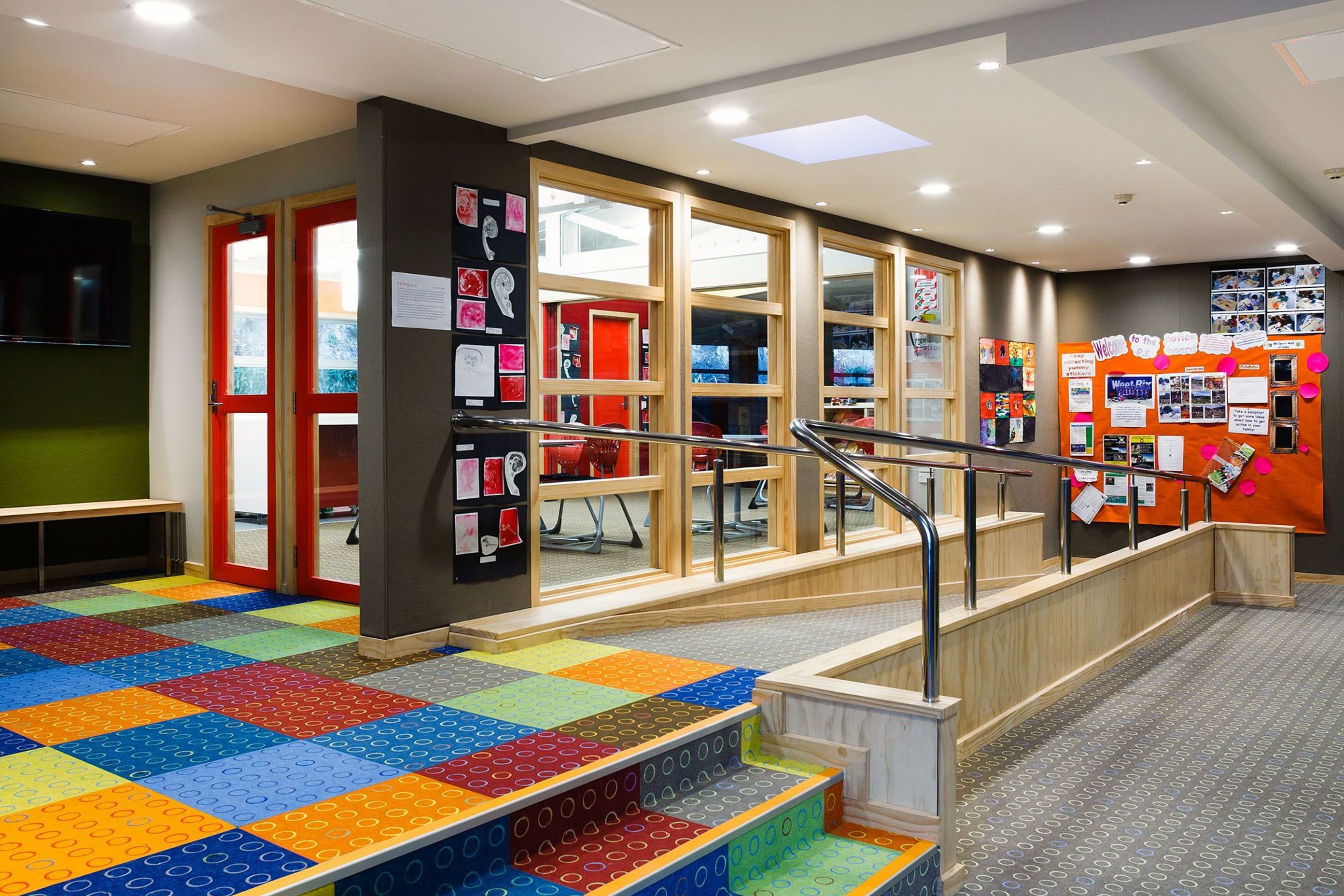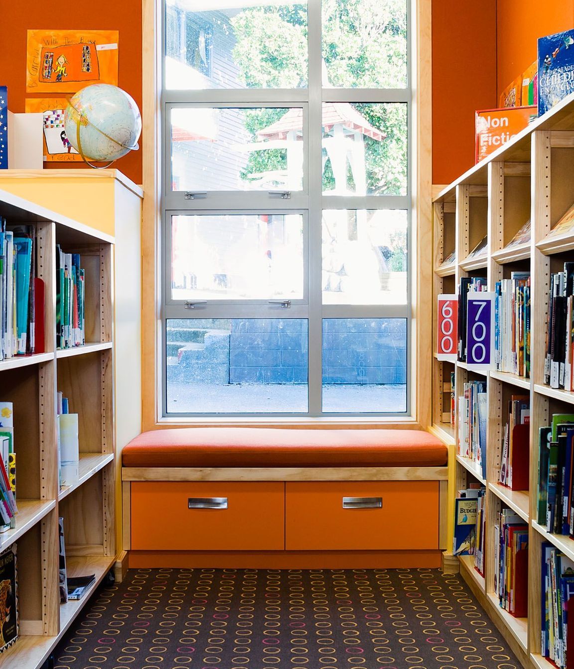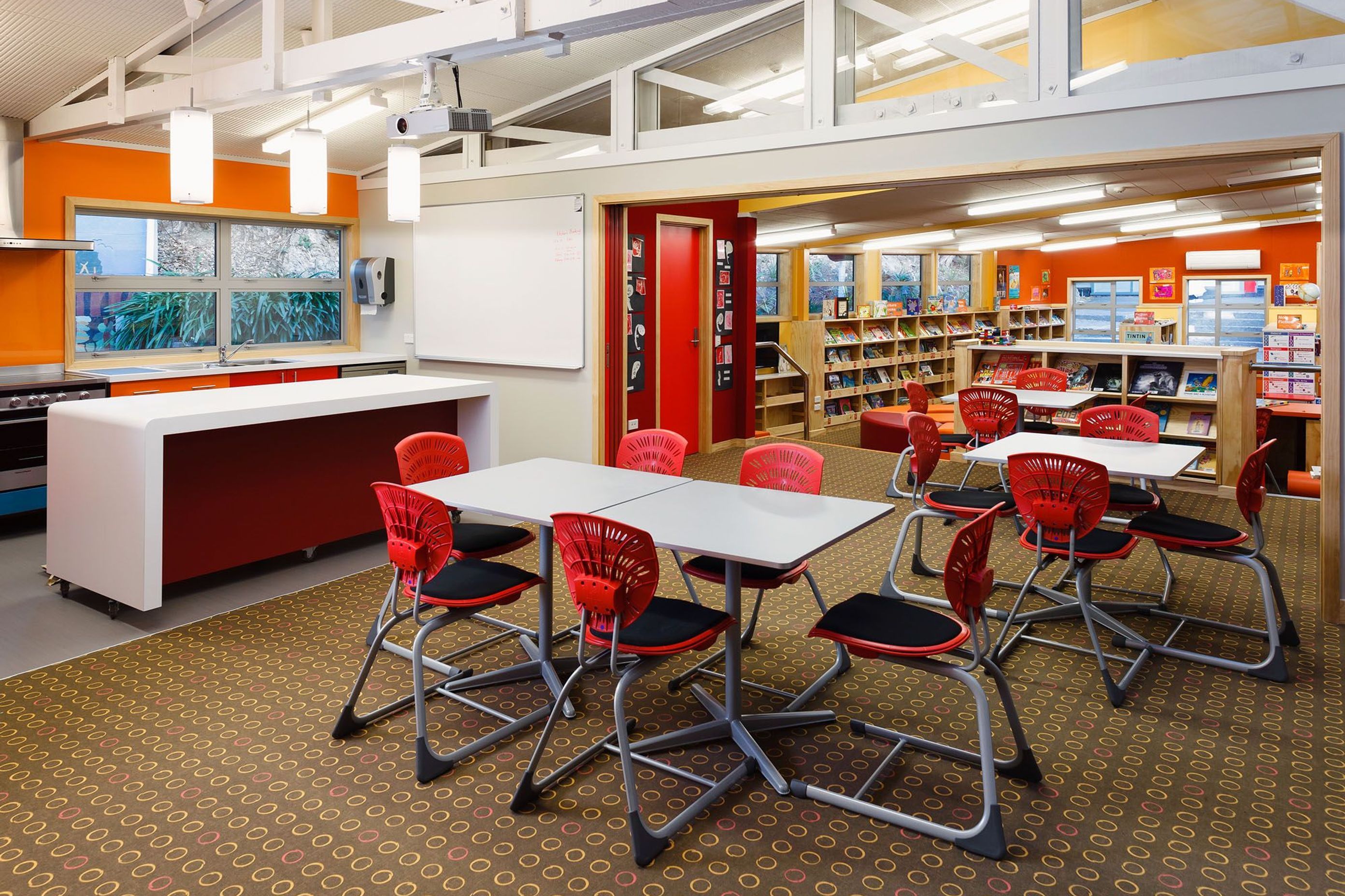 ArchiPro Project Summary - Island Bay School's new Learning Hub features a vibrant Community Space and Library, fostering collaboration and learning among students, parents, and educators, while showcasing significant community contributions and a strong connection to the environment.