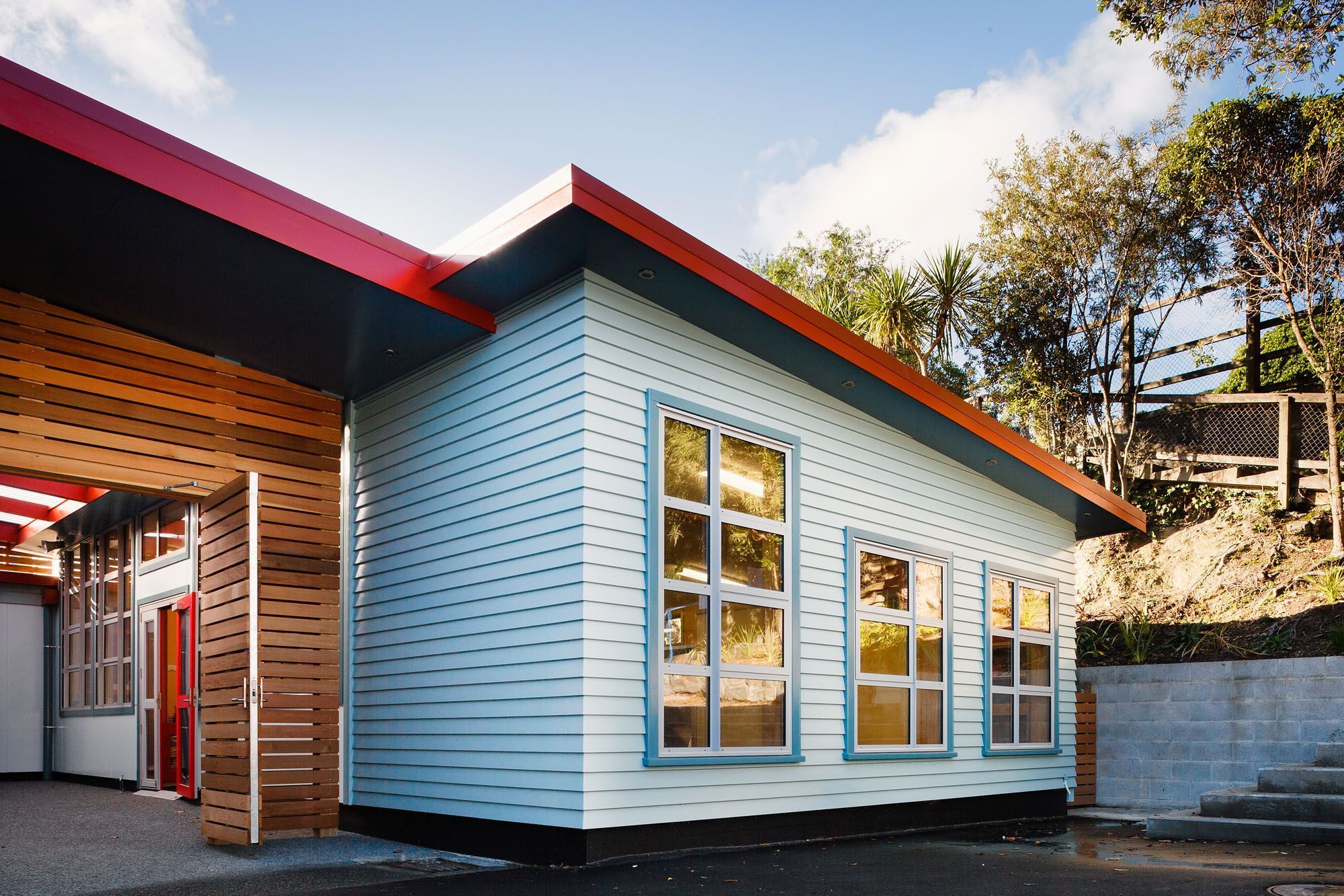 ArchiPro Project Summary - Island Bay School's new Learning Hub features a vibrant Community Space and Library, fostering collaboration and learning among students, parents, and educators, while showcasing significant community contributions and a strong connection to the environment.