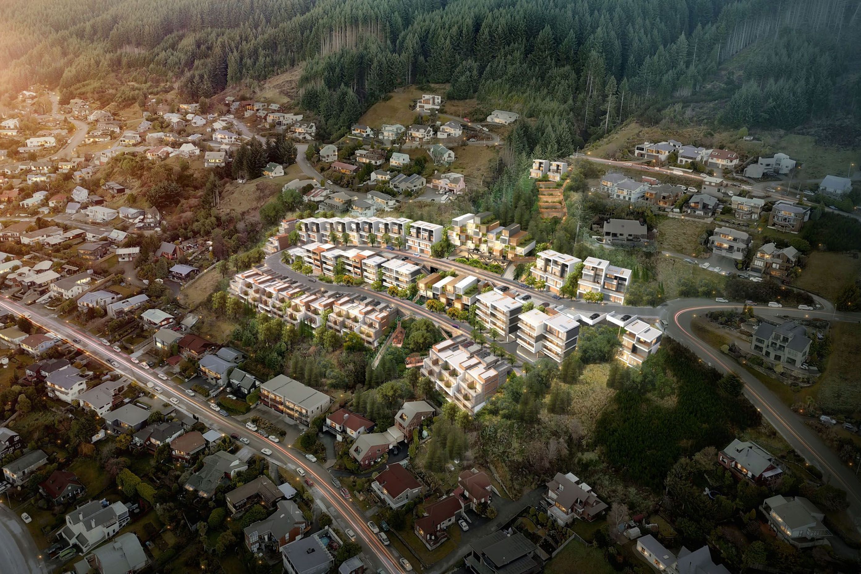 ArchiPro Project Summary - Comprehensive 120-unit residential development in Fernhill, Queenstown, featuring a mix of standalone houses, duplexes, terrace houses, apartments, and visitor accommodations, with sizes ranging from 35 sqm to 300 sqm.