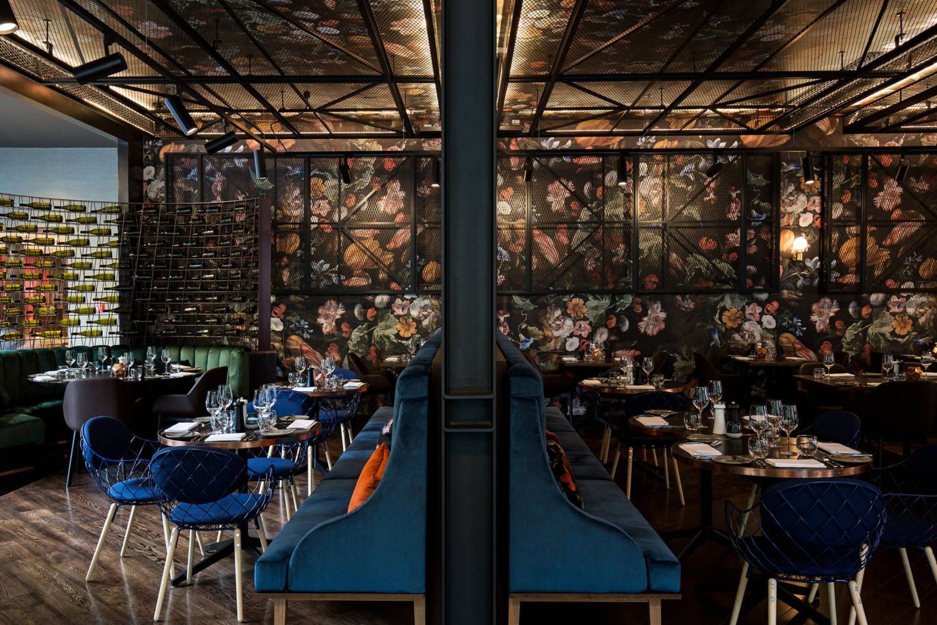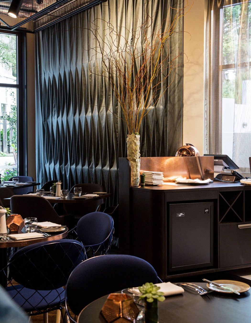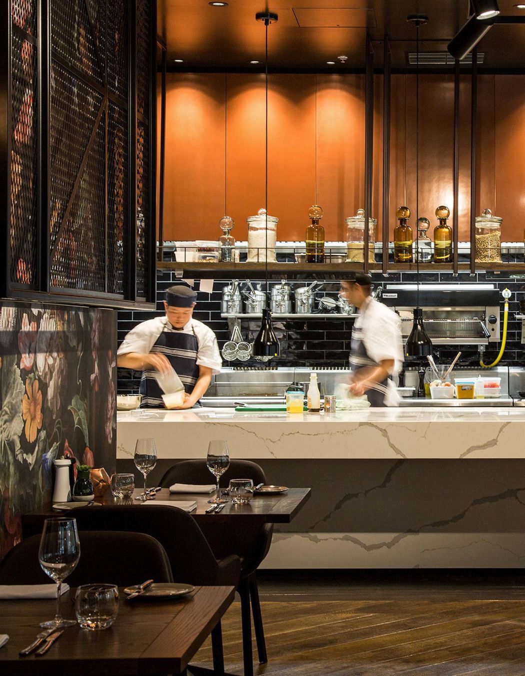 ArchiPro Project Summary - Jardin Restaurant features an open kitchen that enhances the dining experience, complemented by a thoughtfully designed interior rich in texture and sumptuous hues, creating a warm and inviting atmosphere.