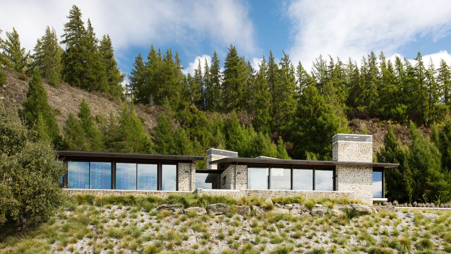 ArchiPro Project Summary - A stunning cottage by Johnston Architects, blending larch wood and natural landscaping with conifers and chaparral.