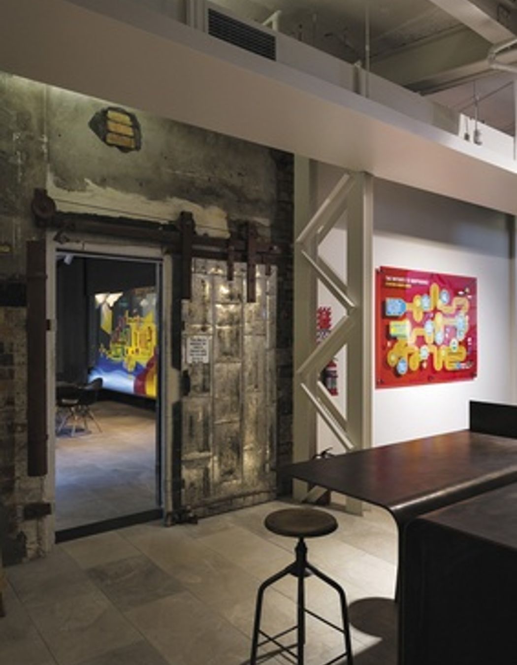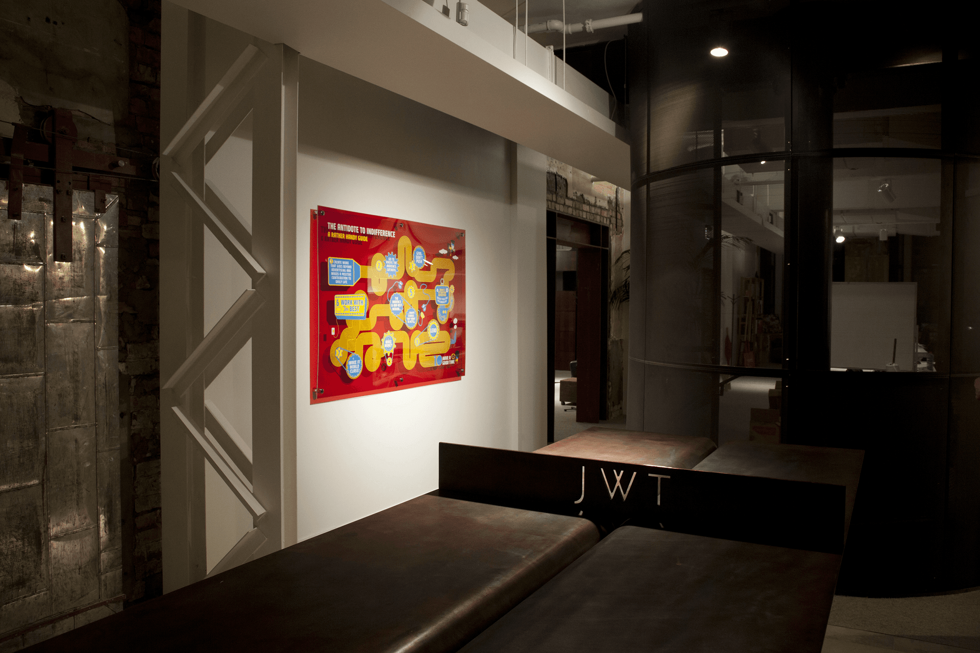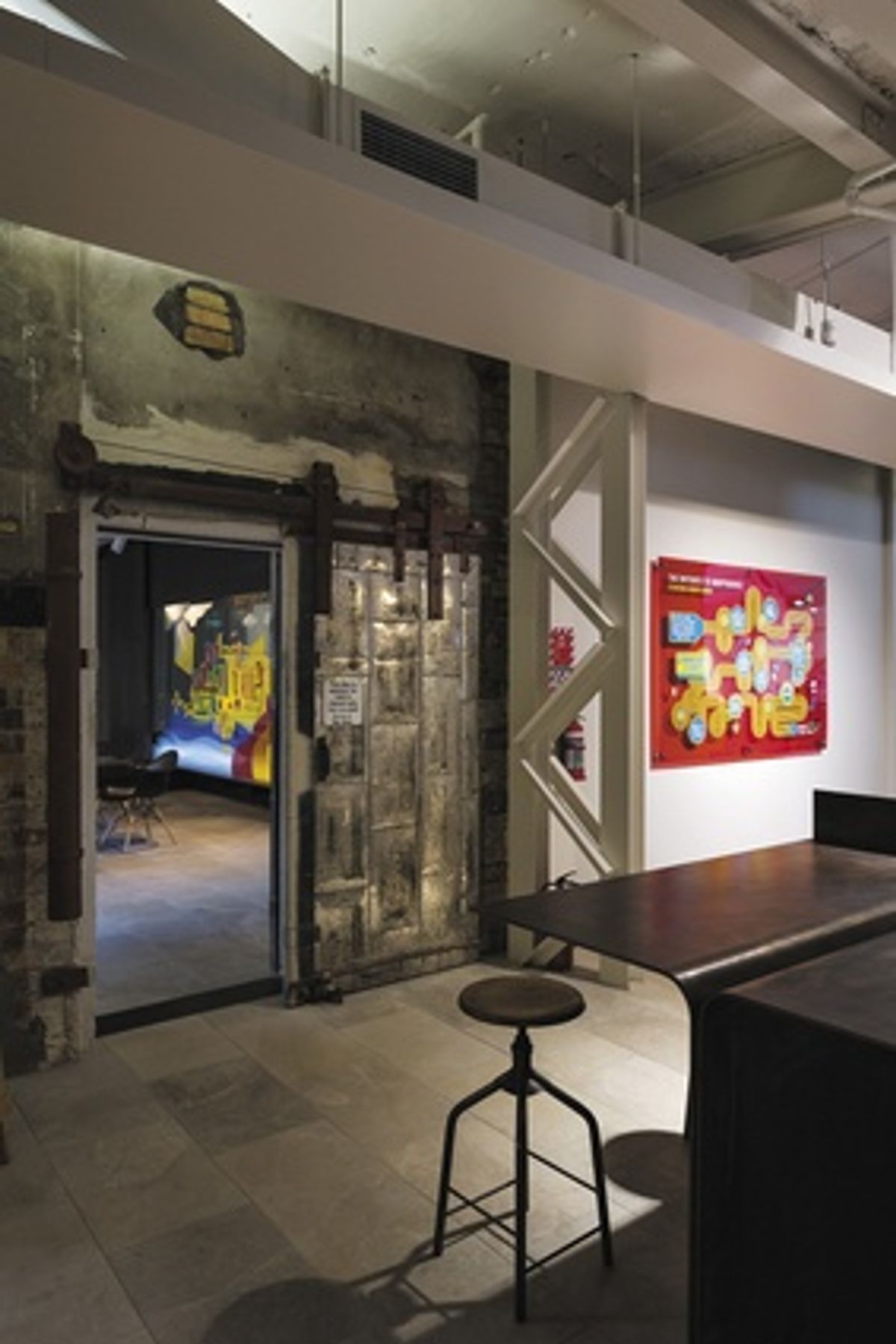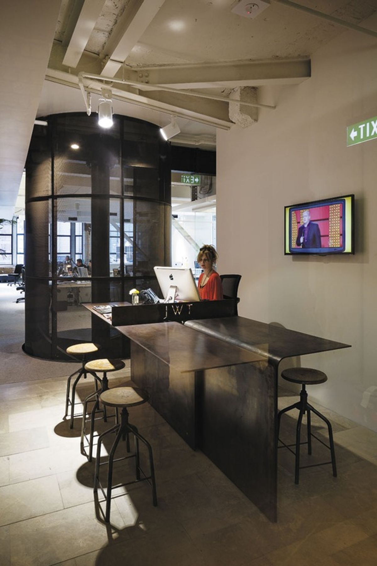 ArchiPro Project Summary - A harmonious blend of historic and contemporary design, the JWT fitout features an open plan layout with flexible collaboration zones, custom iron reception, and vibrant graphics, creating an industrial yet inviting workspace.