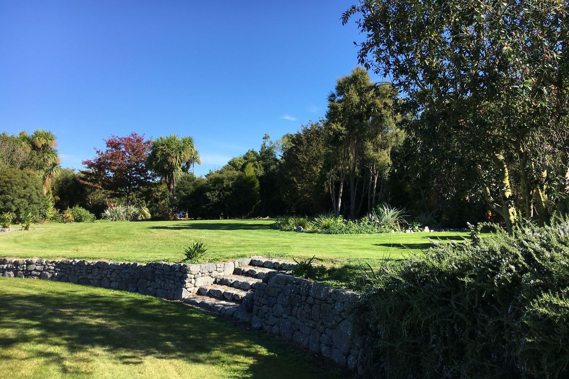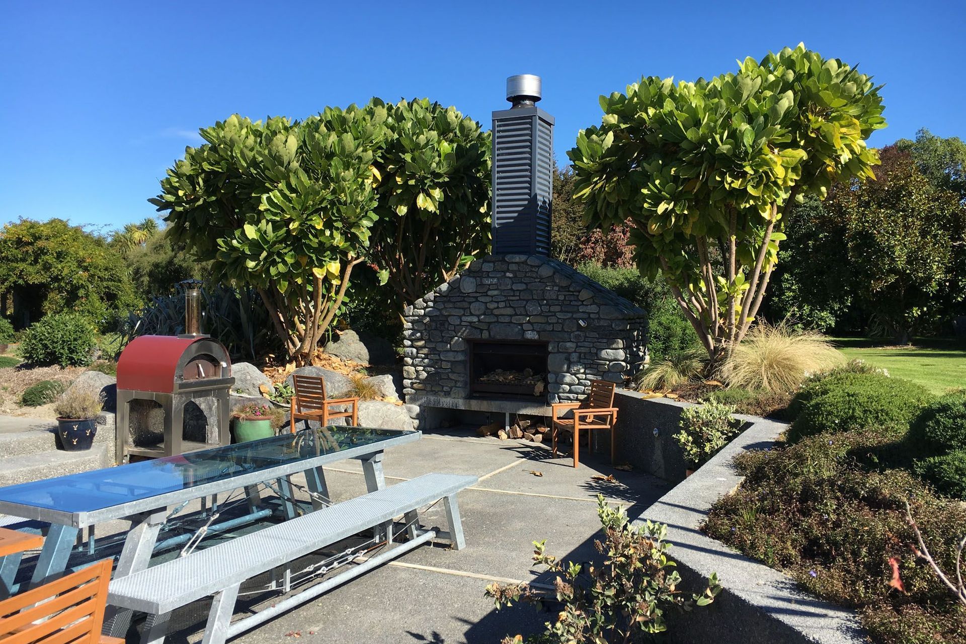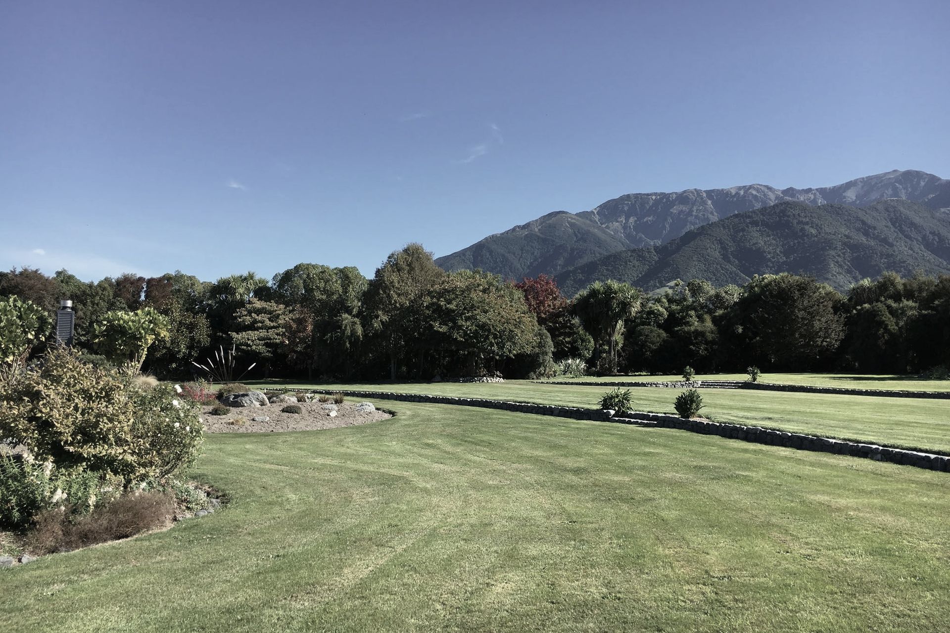ArchiPro Project Summary - A stunning lifestyle property in Kaikoura featuring minimal landscape design, sweeping lawns, and local stone walls, complemented by a sheltered courtyard with built-in seating and an outdoor fire, all set against the breathtaking backdrop of the Kaikoura ranges.
