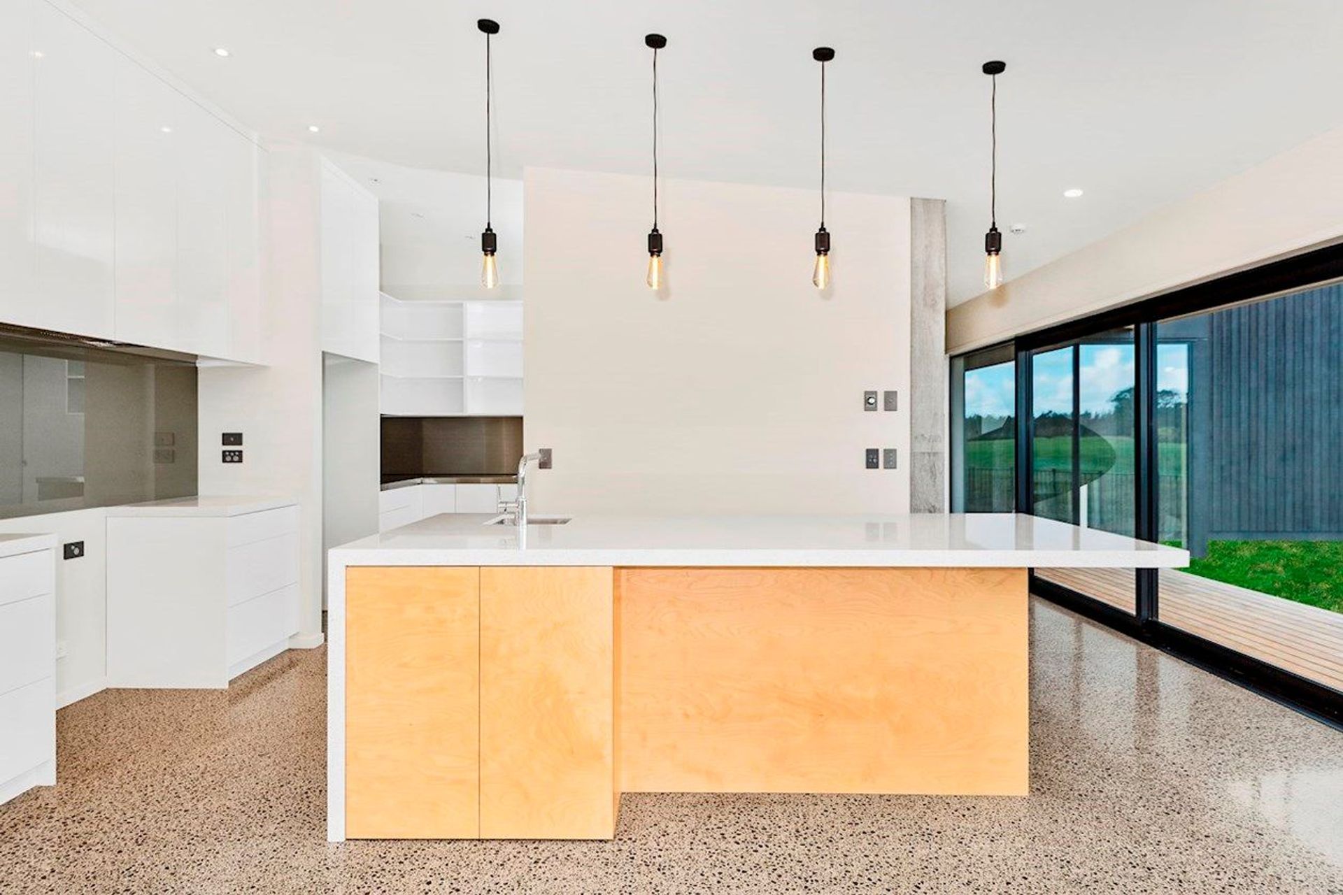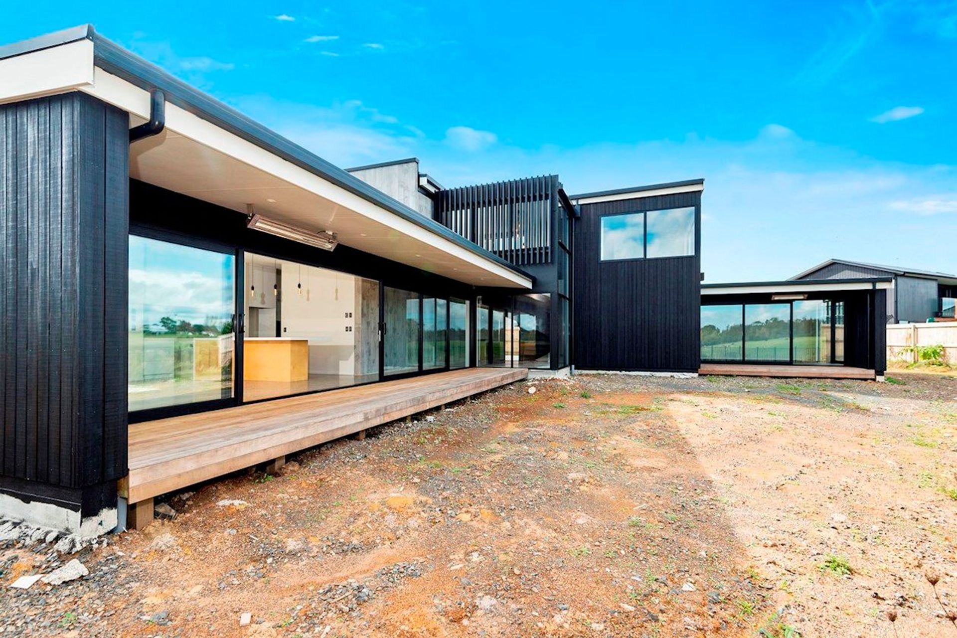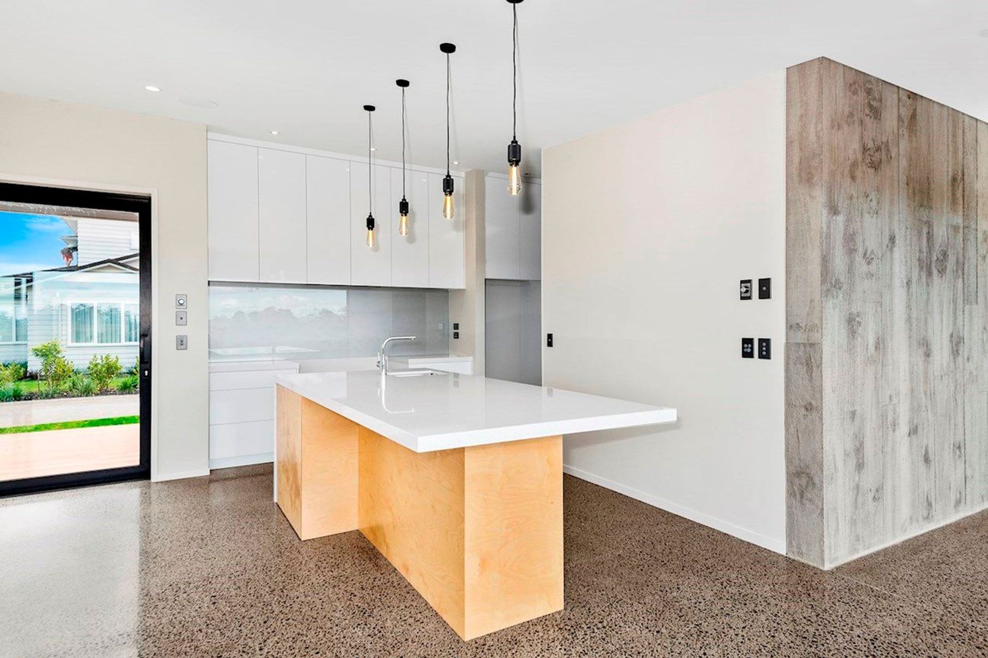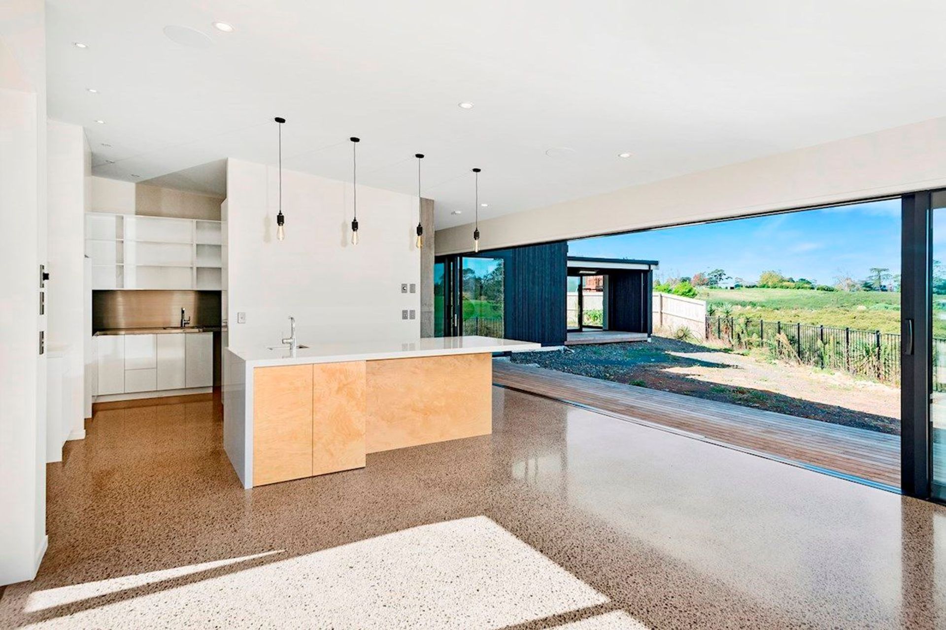 ArchiPro Project Summary - A stunning five-bedroom, three-bathroom family home in Karaka Lakes, Auckland, featuring polished concrete, a floating timber staircase, and expansive glass elements that create a seamless connection with the outdoors.