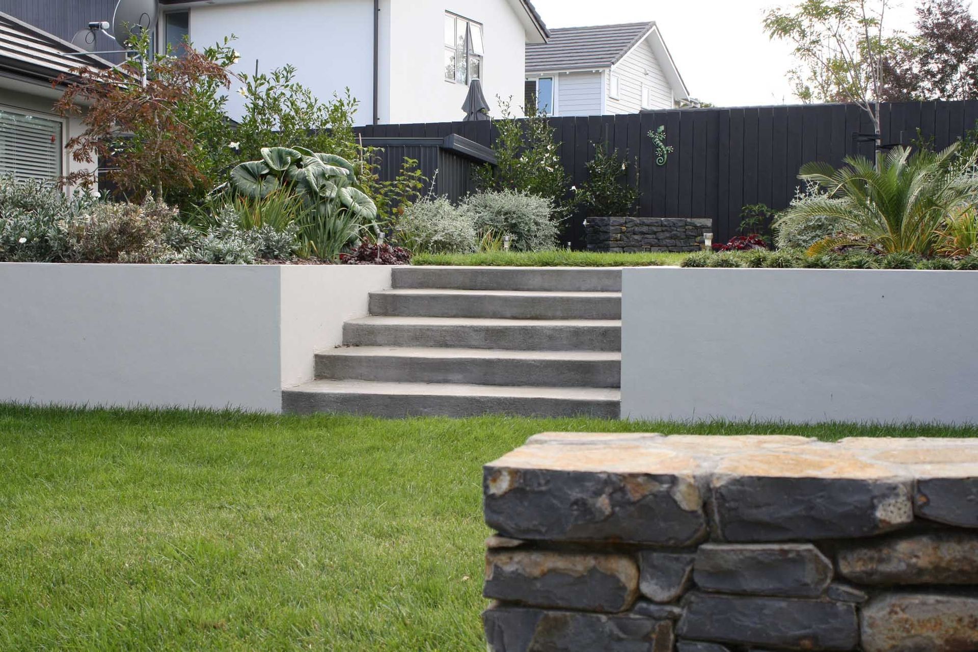 ArchiPro Project Summary - Transforming a typical square property into an inviting garden space with split-level landscaping, enhancing street appeal and creating functional outdoor areas for relaxation and enjoyment.