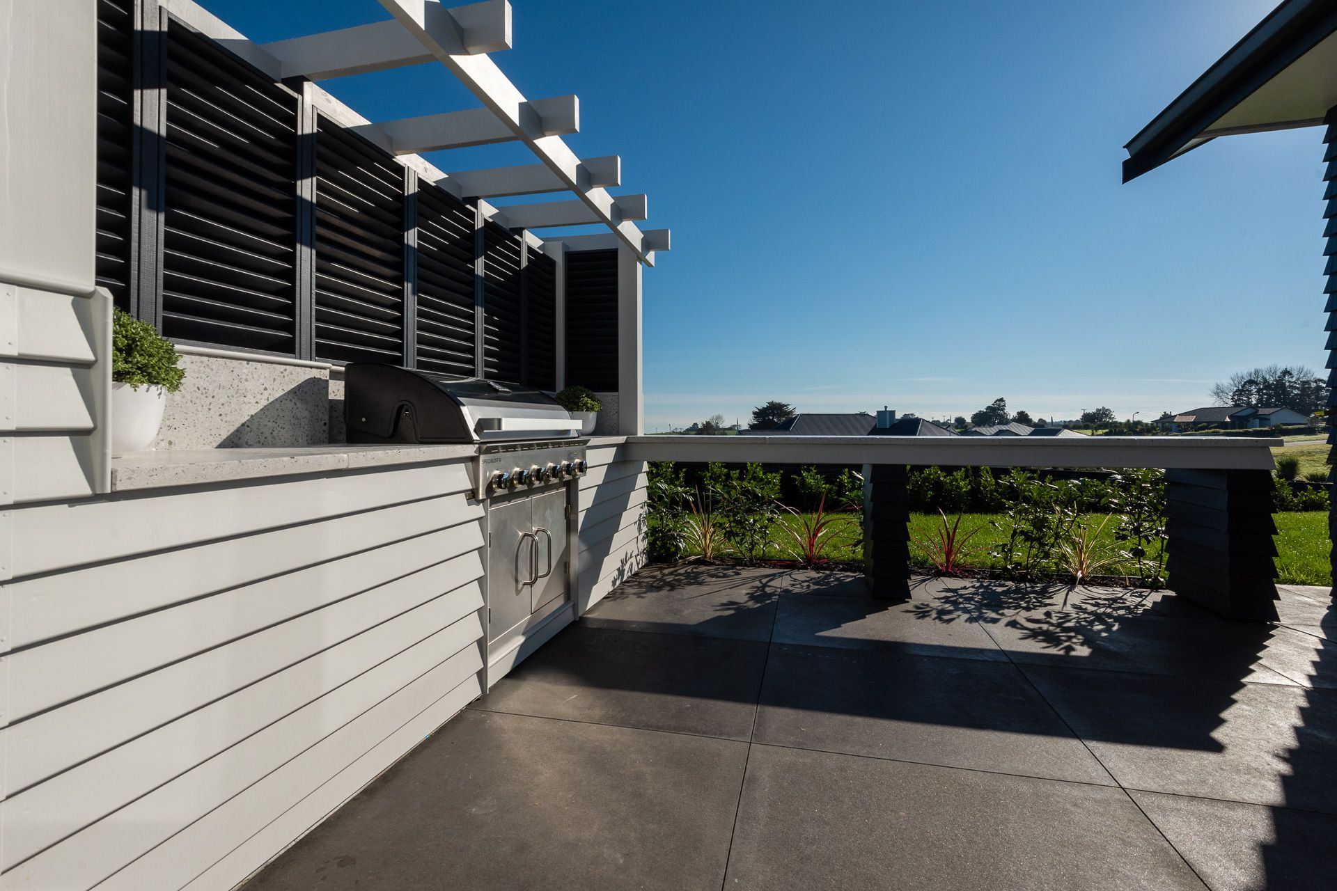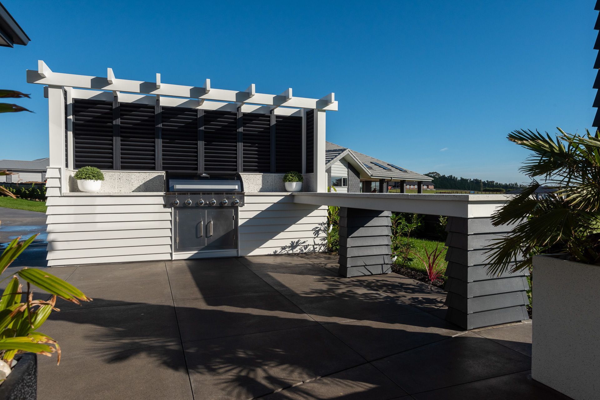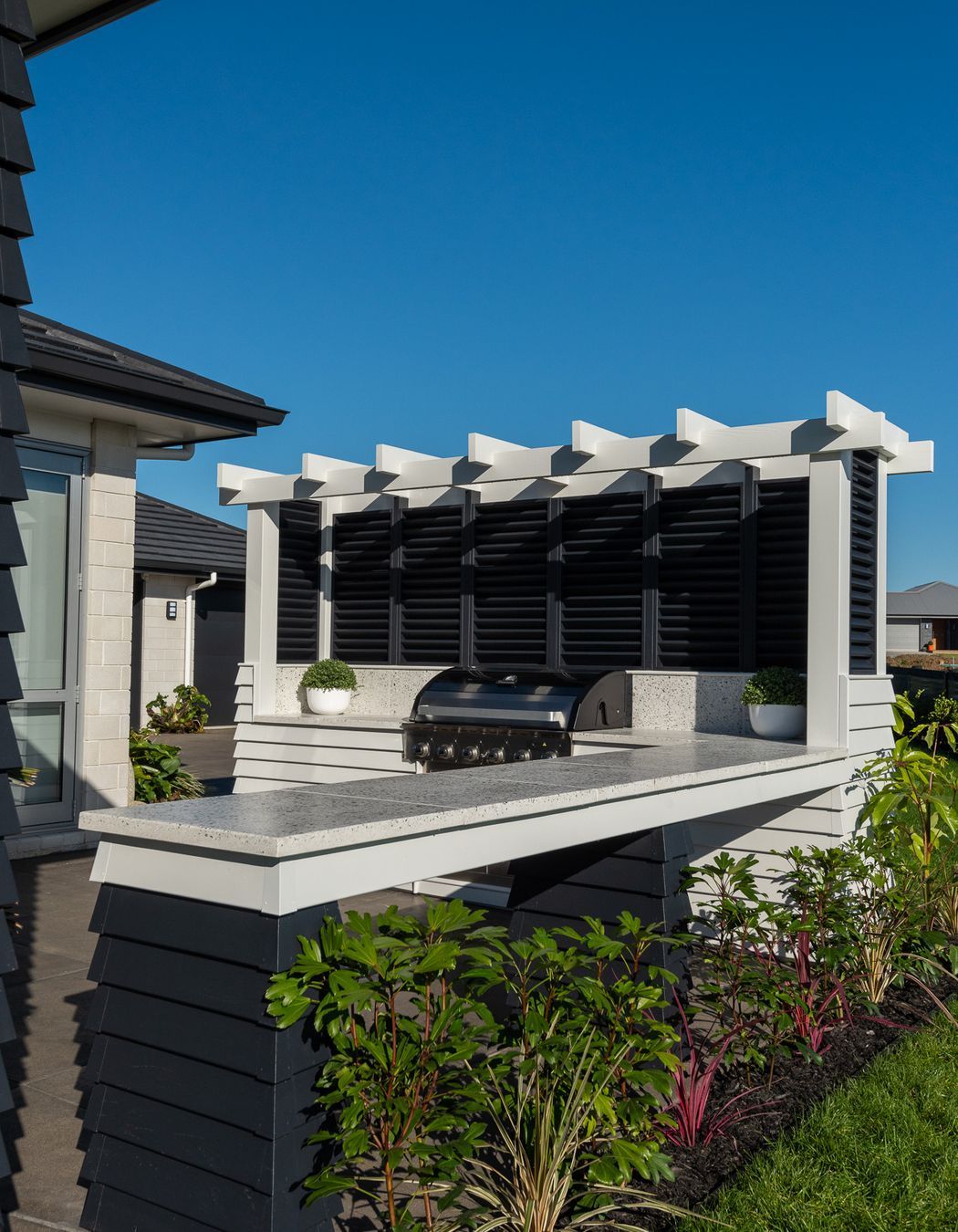 ArchiPro Project Summary - Custom outdoor entertainment area featuring a bespoke BBQ and sheltering shutters, designed to harmonize with the existing architecture for year-round enjoyment.