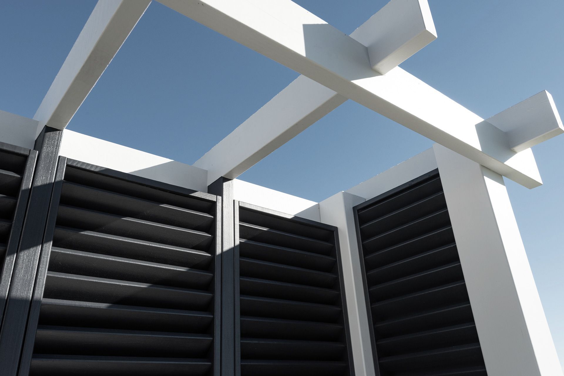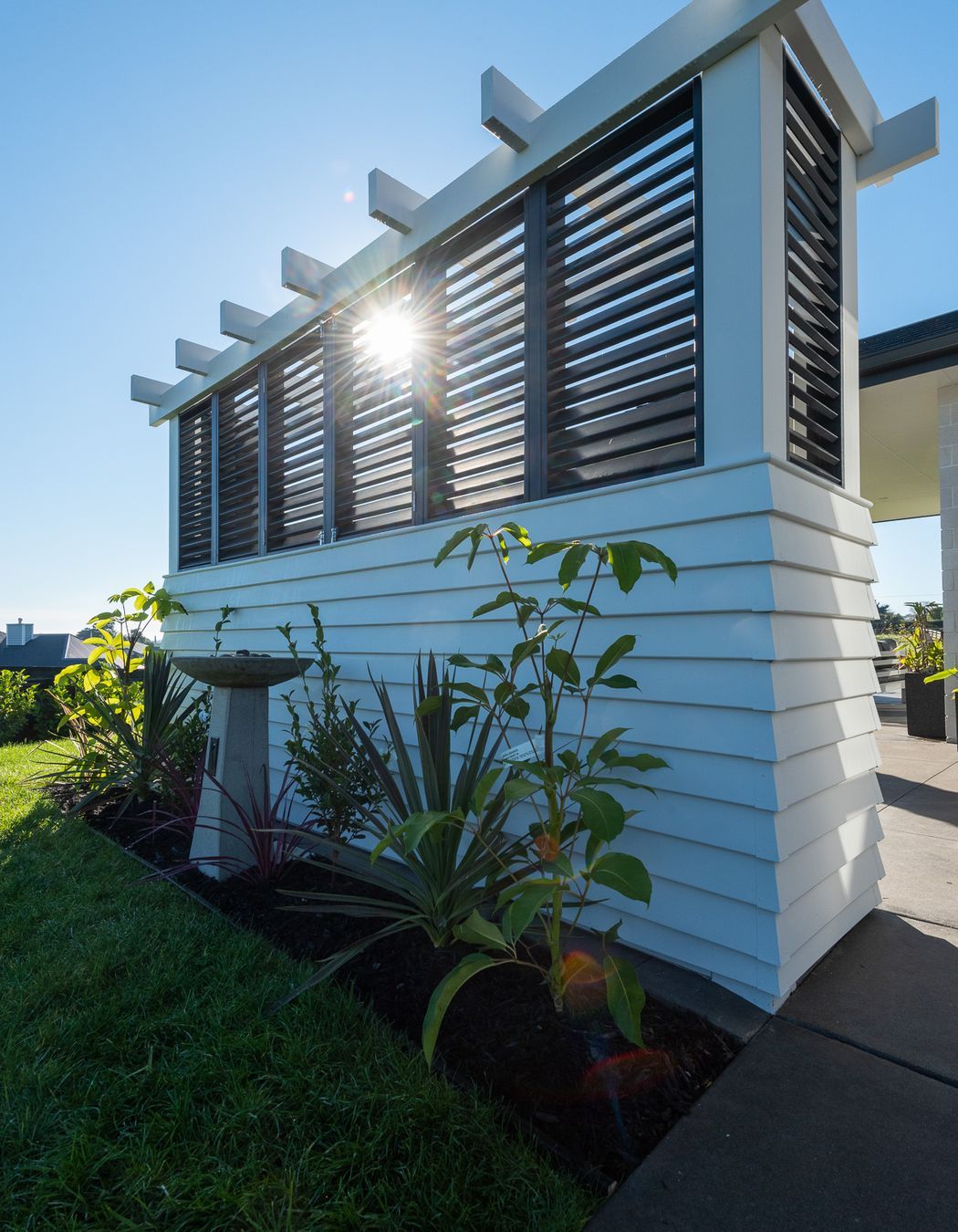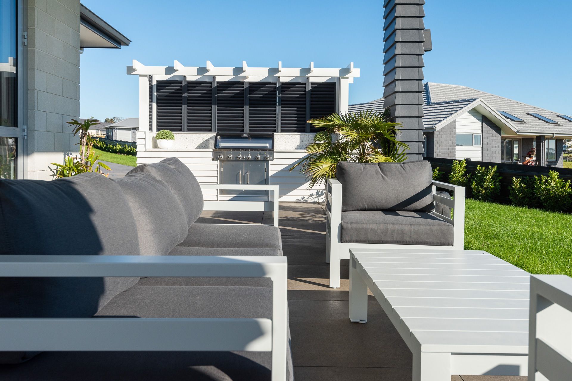 ArchiPro Project Summary - Custom outdoor entertainment area featuring a bespoke BBQ and sheltering shutters, designed to harmonize with the existing architecture for year-round enjoyment.