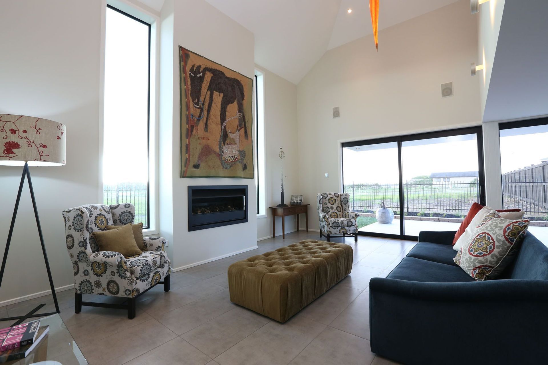 ArchiPro Project Summary - Energy-efficient Karaka Showhome featuring a Franz Kamermans design, utilizing solar gain, underfloor hydronic heating, and a 5kW PV solar power system, complemented by Monier Brick, Linea weatherboard, and stained cedar finishes.