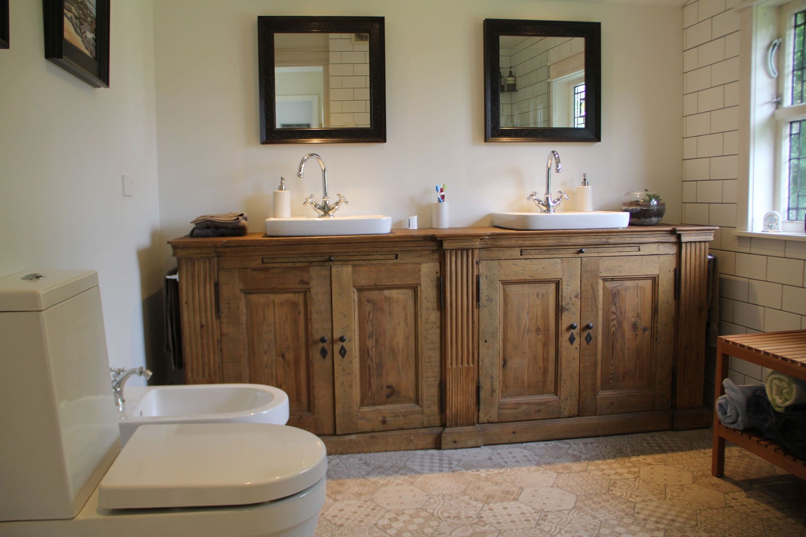 ArchiPro Project Summary - Renovation of two bathrooms and restoration of wooden features in Kaukapakapa, featuring customized vintage vanities and elegant wainscotting.