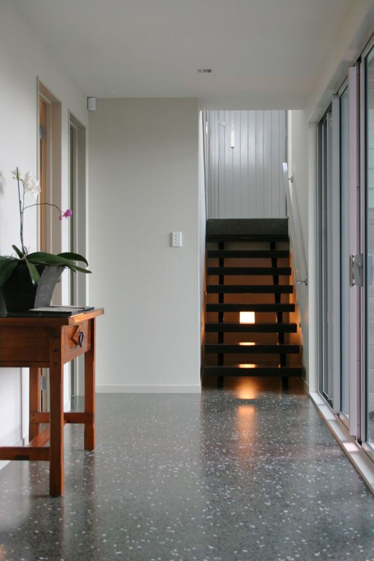 ArchiPro Project Summary - Thoughtfully designed home in Kensington Terrace, Gulf Harbour, featuring low pitched, stepping roofs that harmonize with the sloping terrain and maximize sunlight and views, complemented by stacked glazing and a striking stack bond block feature wall.
