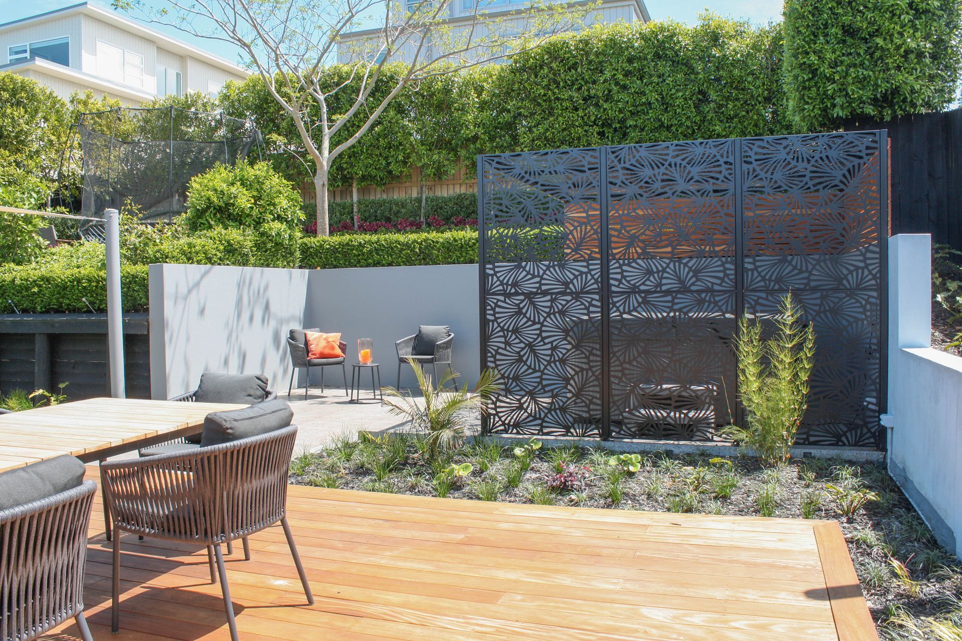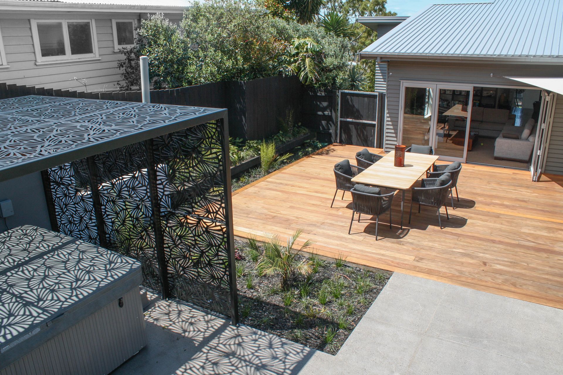 ArchiPro Project Summary - Thoughtful renovation transforming an unsightly block wall into a stylish outdoor living space with a bespoke shade structure over a new spa pool.