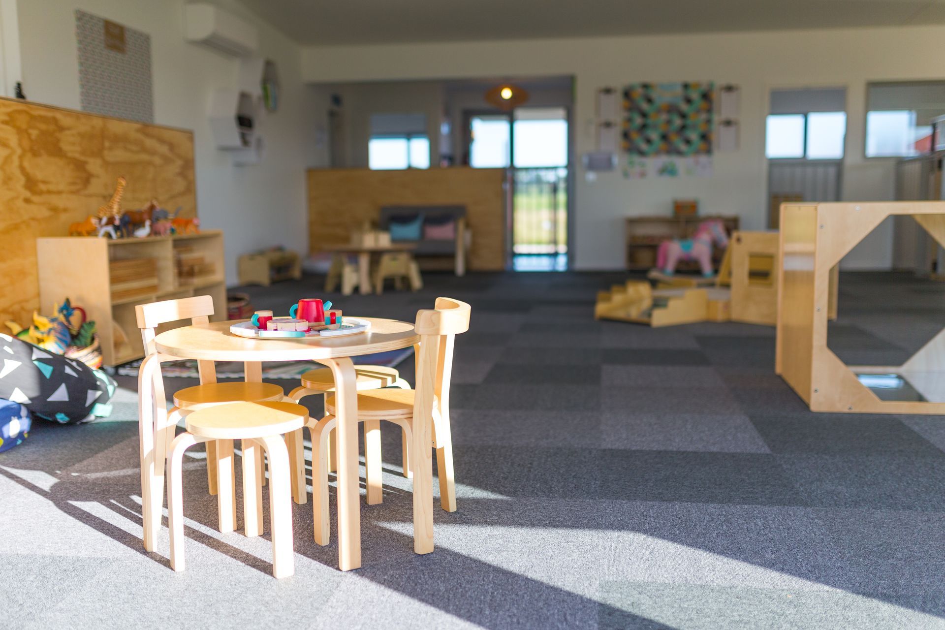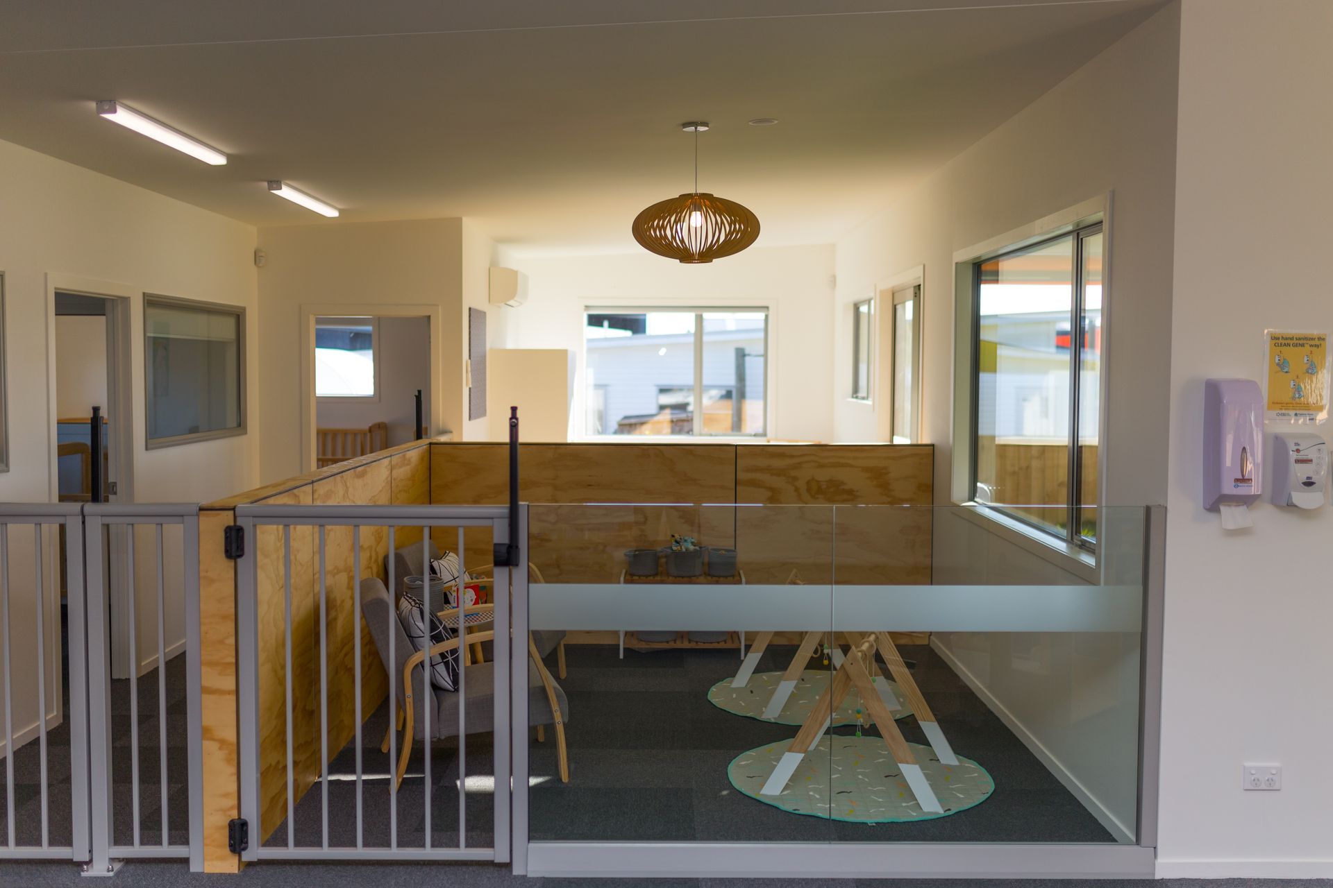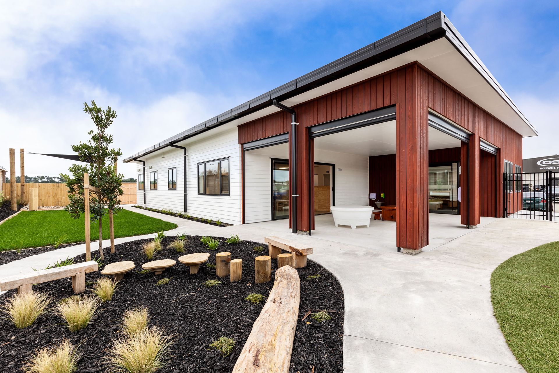 ArchiPro Project Summary - Purpose-built contemporary education facility designed for low maintenance, accommodating up to 50 children daily, featuring a newly added Junior Centre for 30 children aged 2 to 3.5 years, with a warm environment enhanced by timber elements.