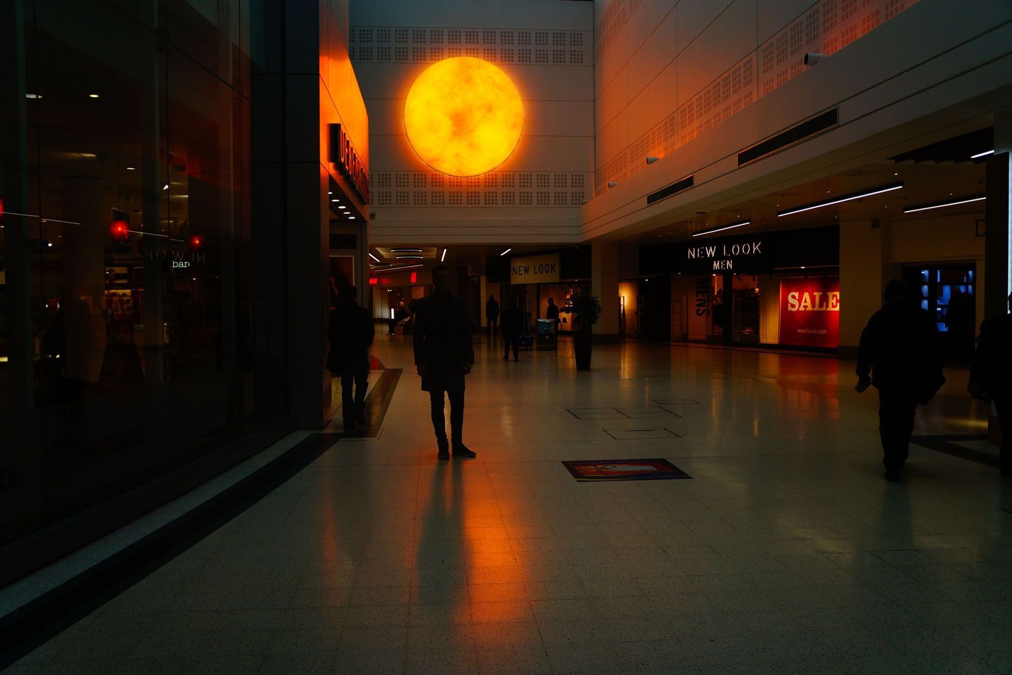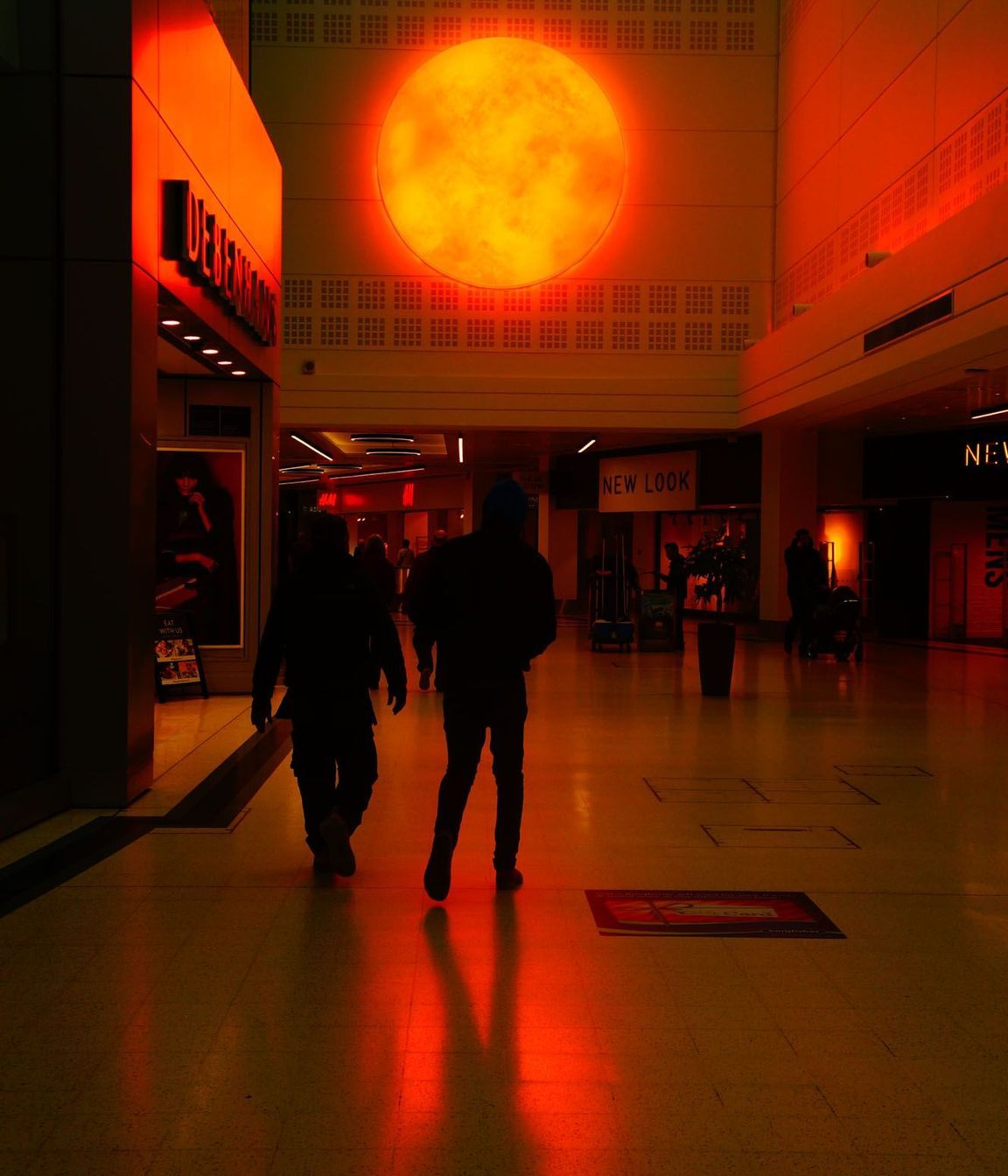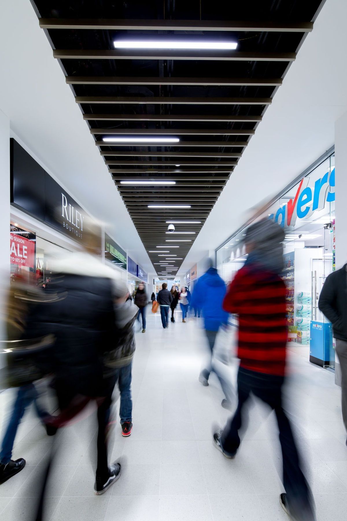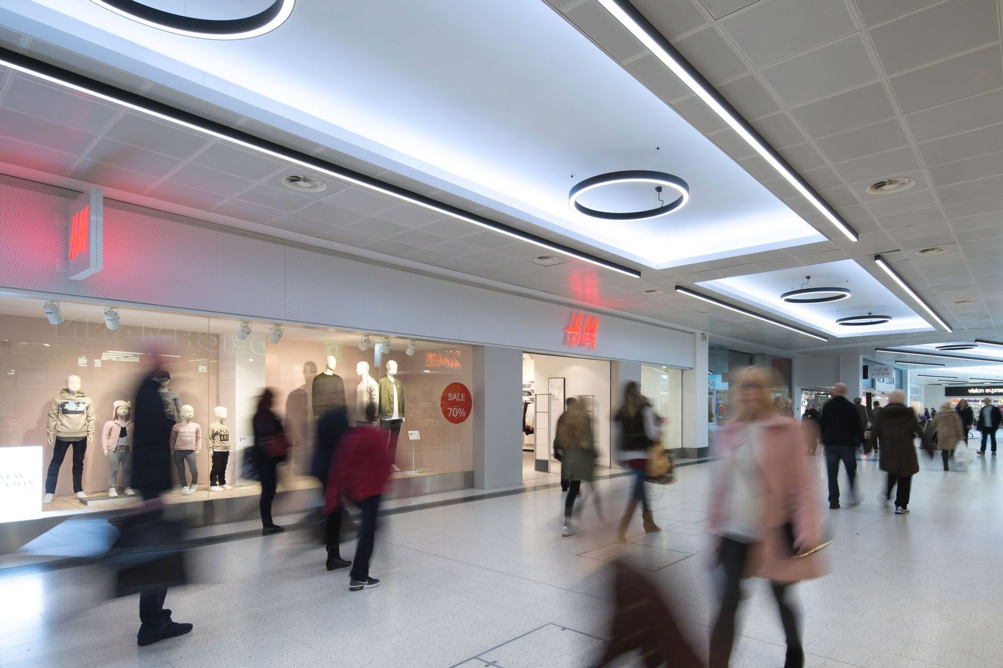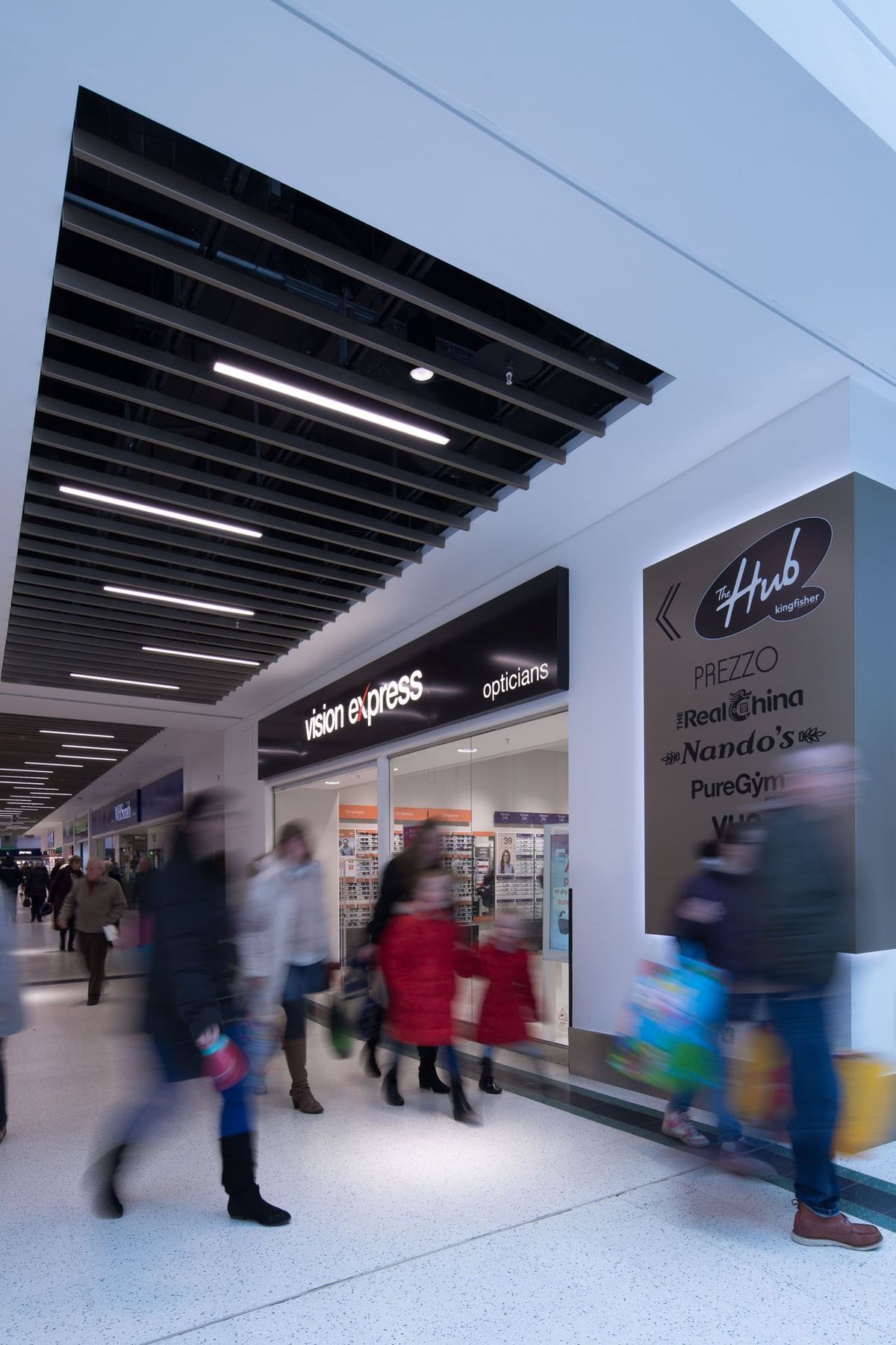 ArchiPro Project Summary - Kingfisher Redditch features a unique design inspired by the local needle manufacturing industry, with dynamic lighting that transitions from cool white to sunset hues, a striking blue nighttime aesthetic, and the largest mosaic by Eduardo Paolozzi, enhanced by an animated sun feature in the atrium.