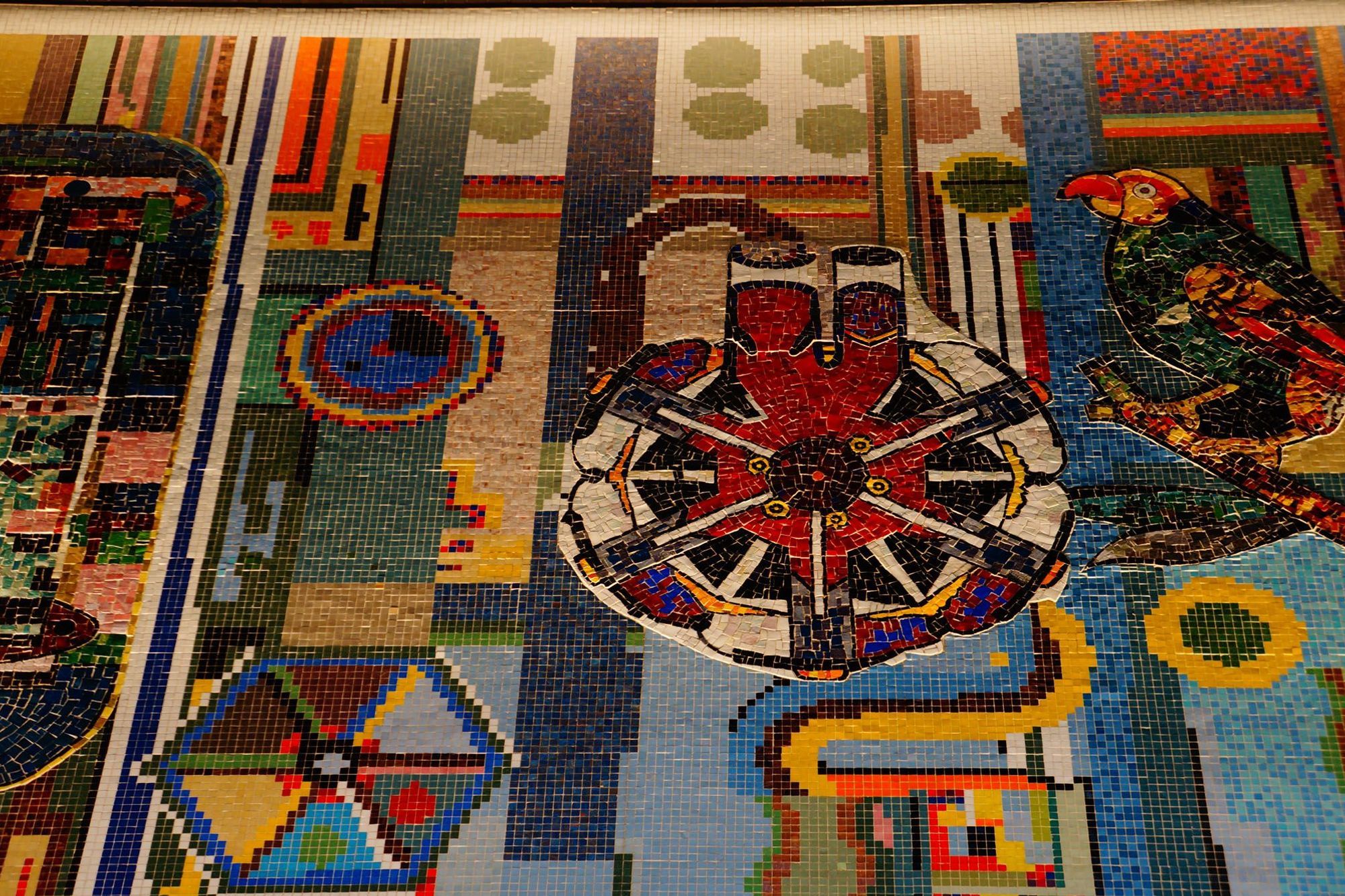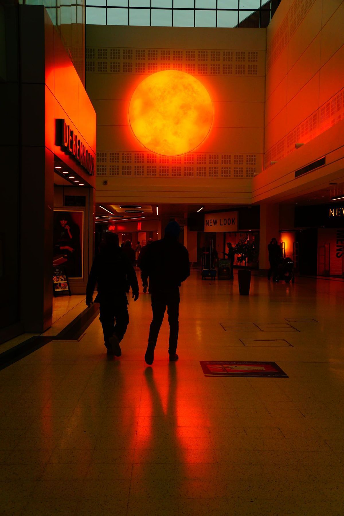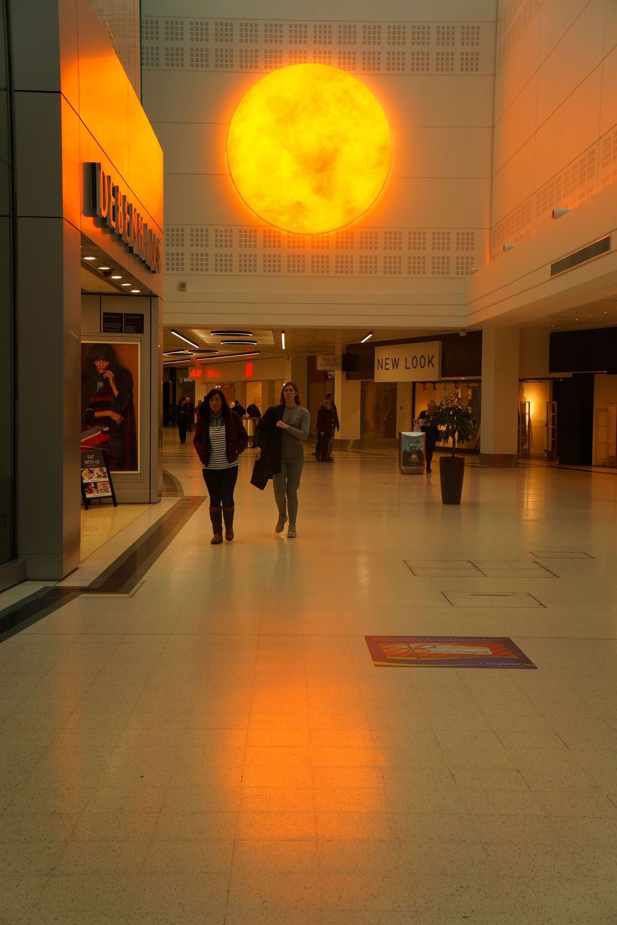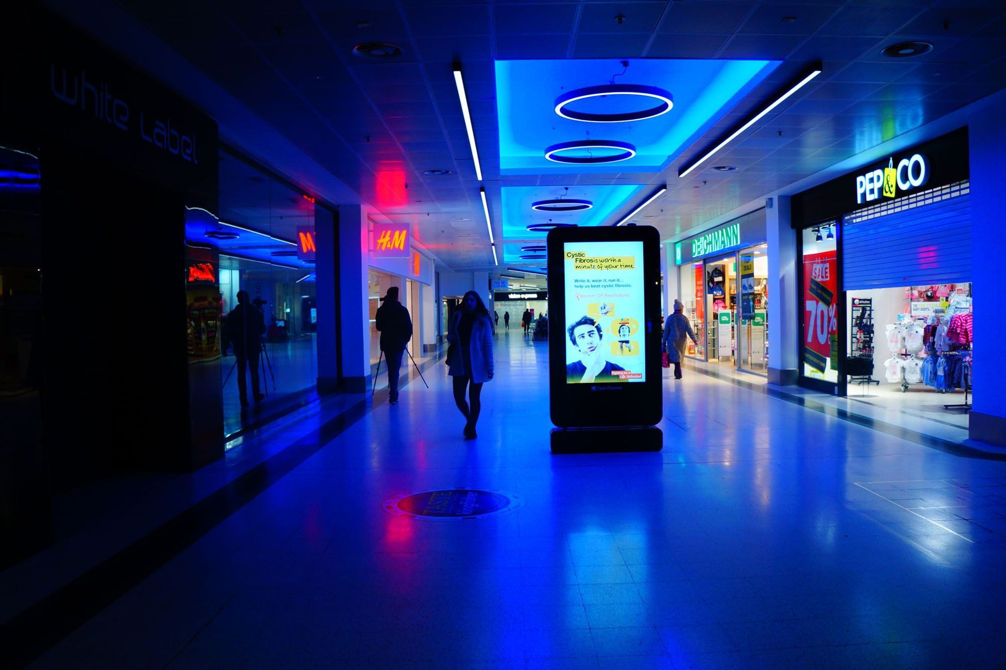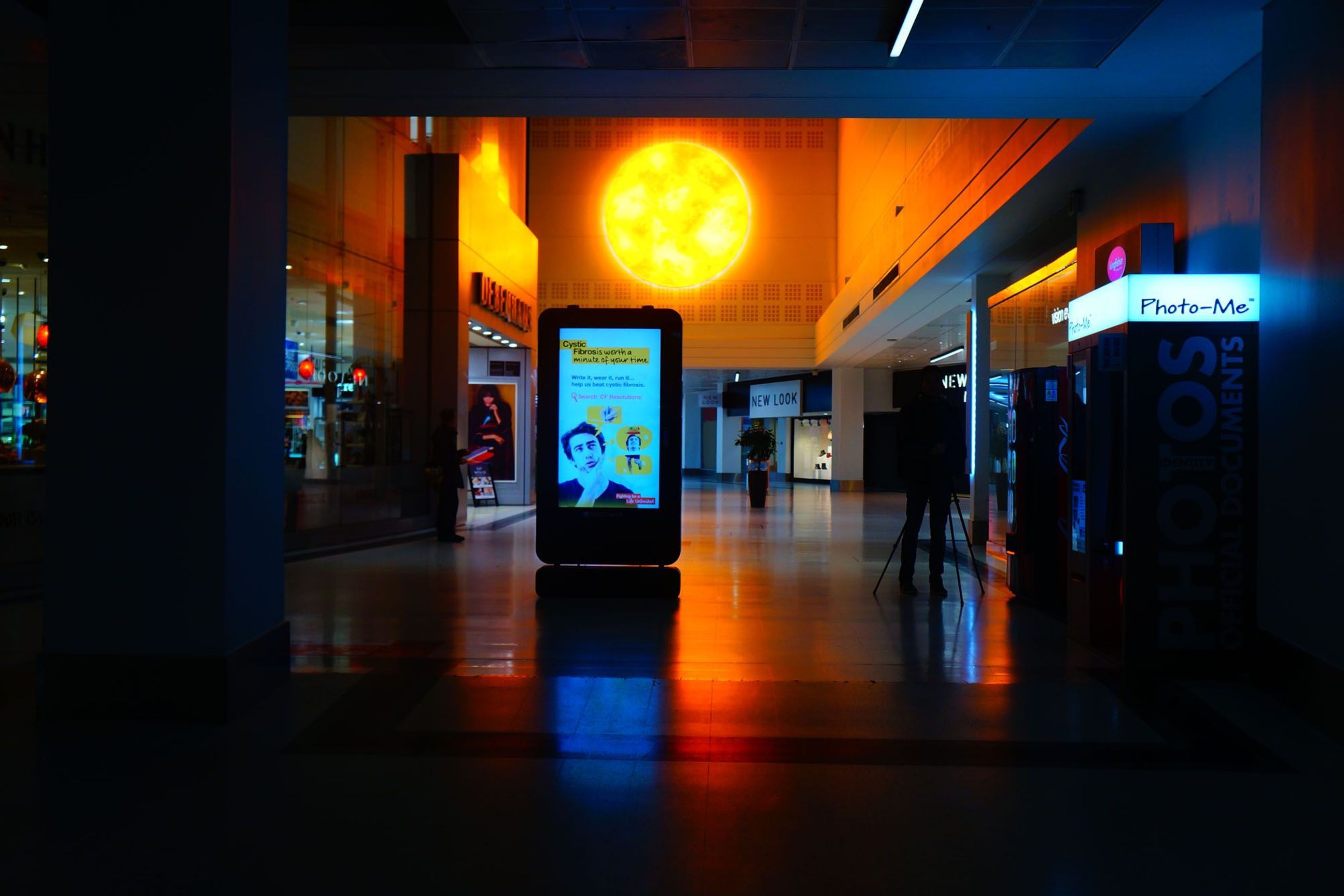 ArchiPro Project Summary - Kingfisher Redditch features a unique design inspired by the local needle manufacturing industry, with dynamic lighting that transitions from cool white to sunset hues, a striking blue nighttime aesthetic, and the largest mosaic by Eduardo Paolozzi, enhanced by an animated sun feature in the atrium.