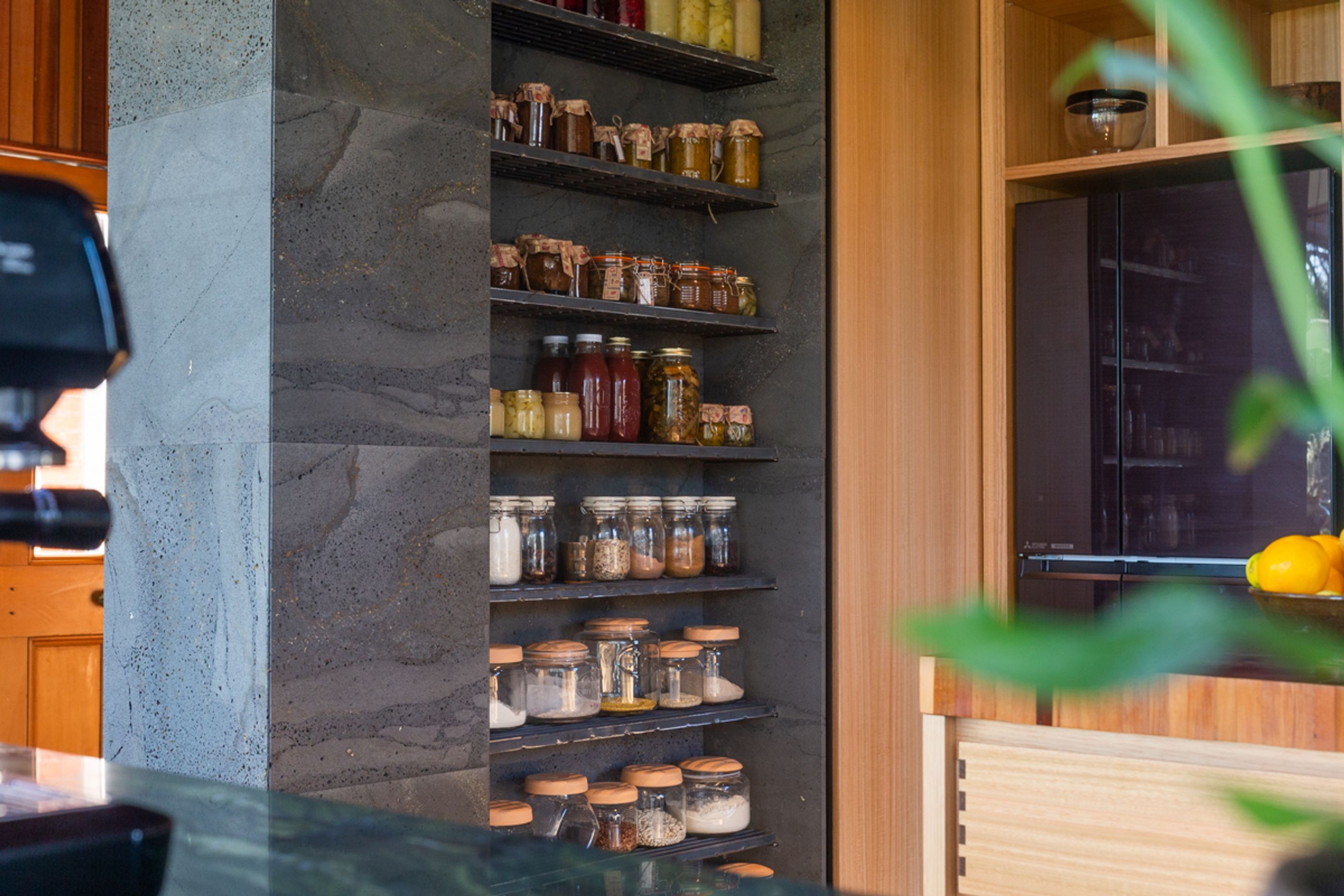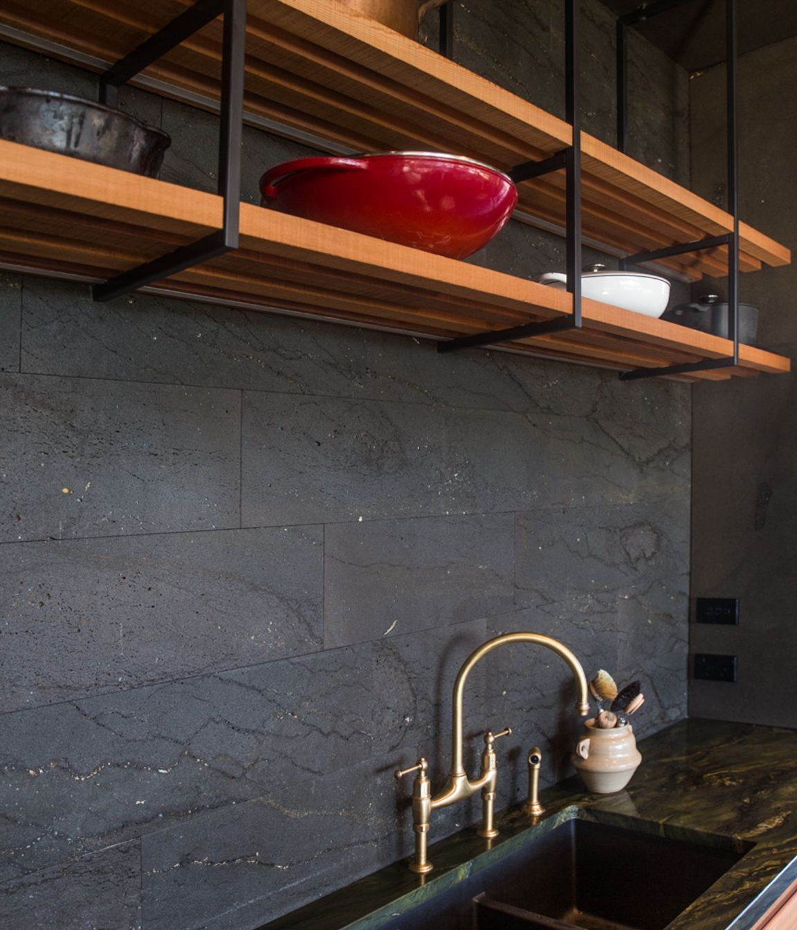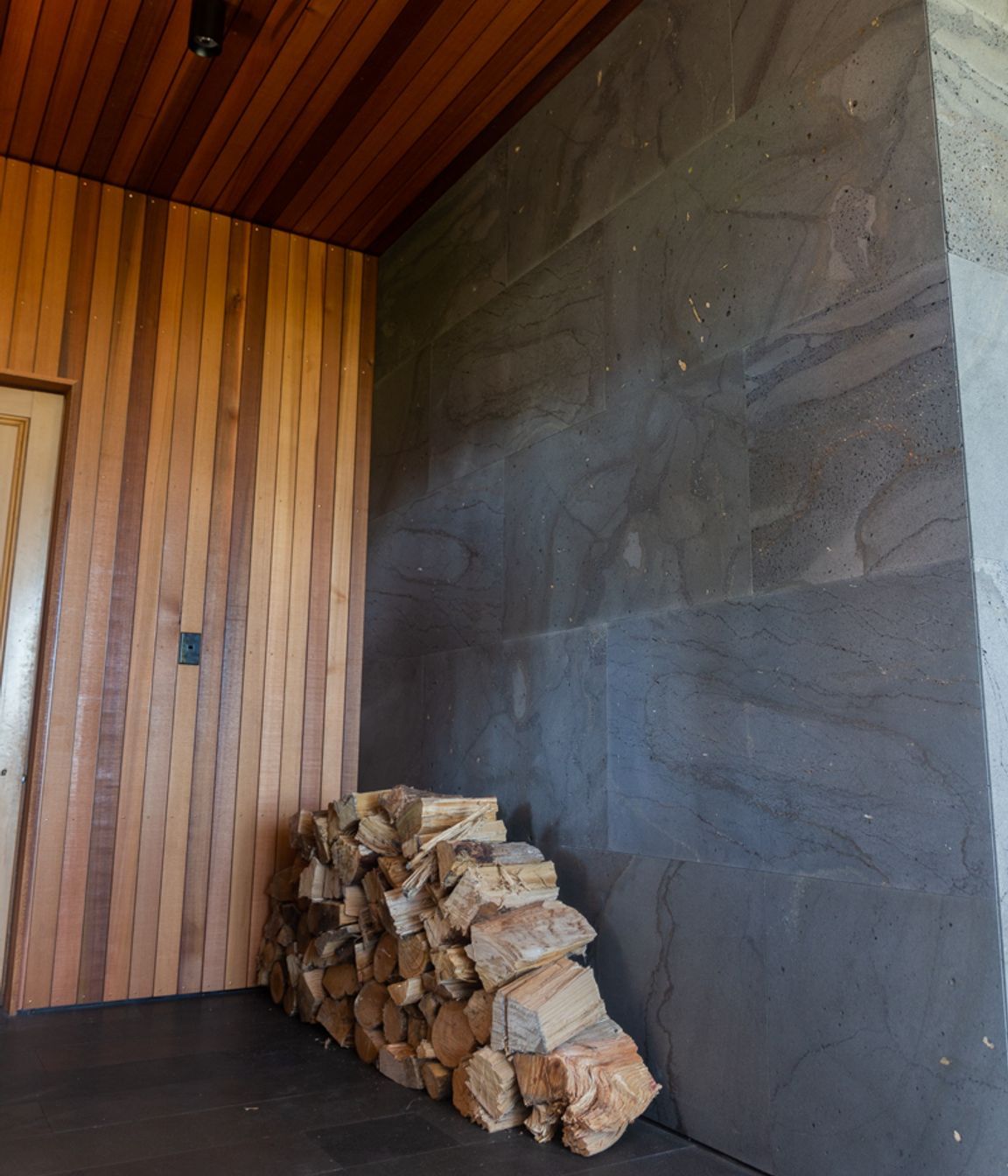 ArchiPro Project Summary - Kingsdown House showcases the versatility of Timaru Bluestone, featuring a blend of character stone walls and basalt flooring, complemented by warm wooden tones that enhance the natural beauty of the stone throughout the home.