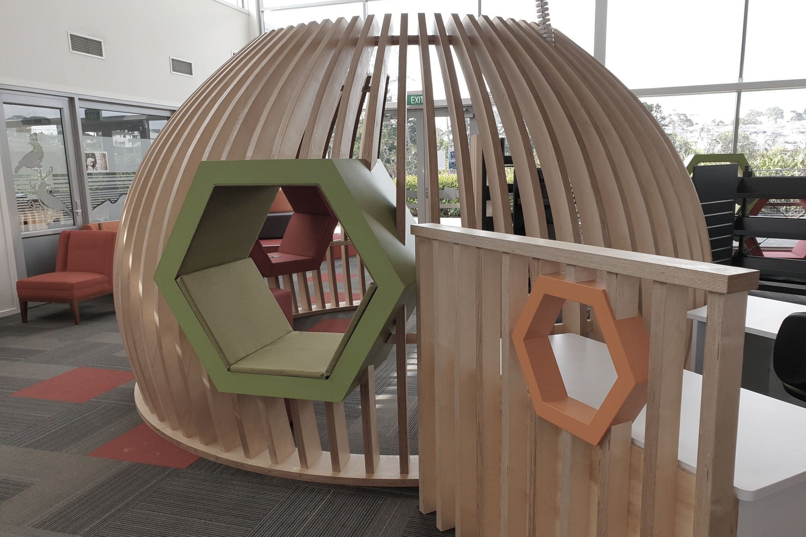 ArchiPro Project Summary - Kingsway School Fitout in Silverdale, designed by Office Interiors in Hastings and manufactured by Craftbuilt Industries in Levin, featuring 40mm Birch fins that create an inviting reading nook.
