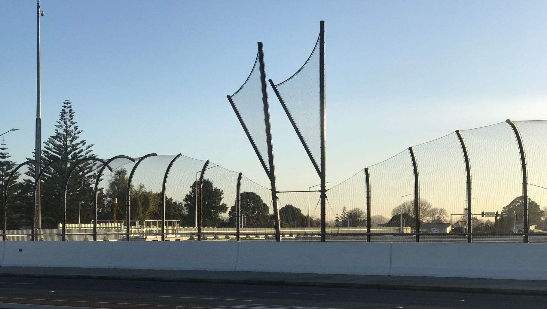 ArchiPro Project Summary - Anti-throw mesh screens for the Kirkbride Road / SH20A intersection over bridge, enhancing safety with tensile safety mesh panels in collaboration with Ronstan.