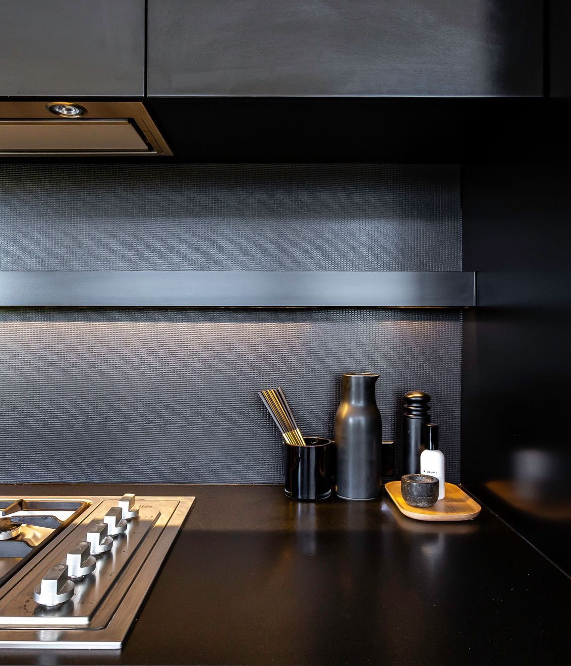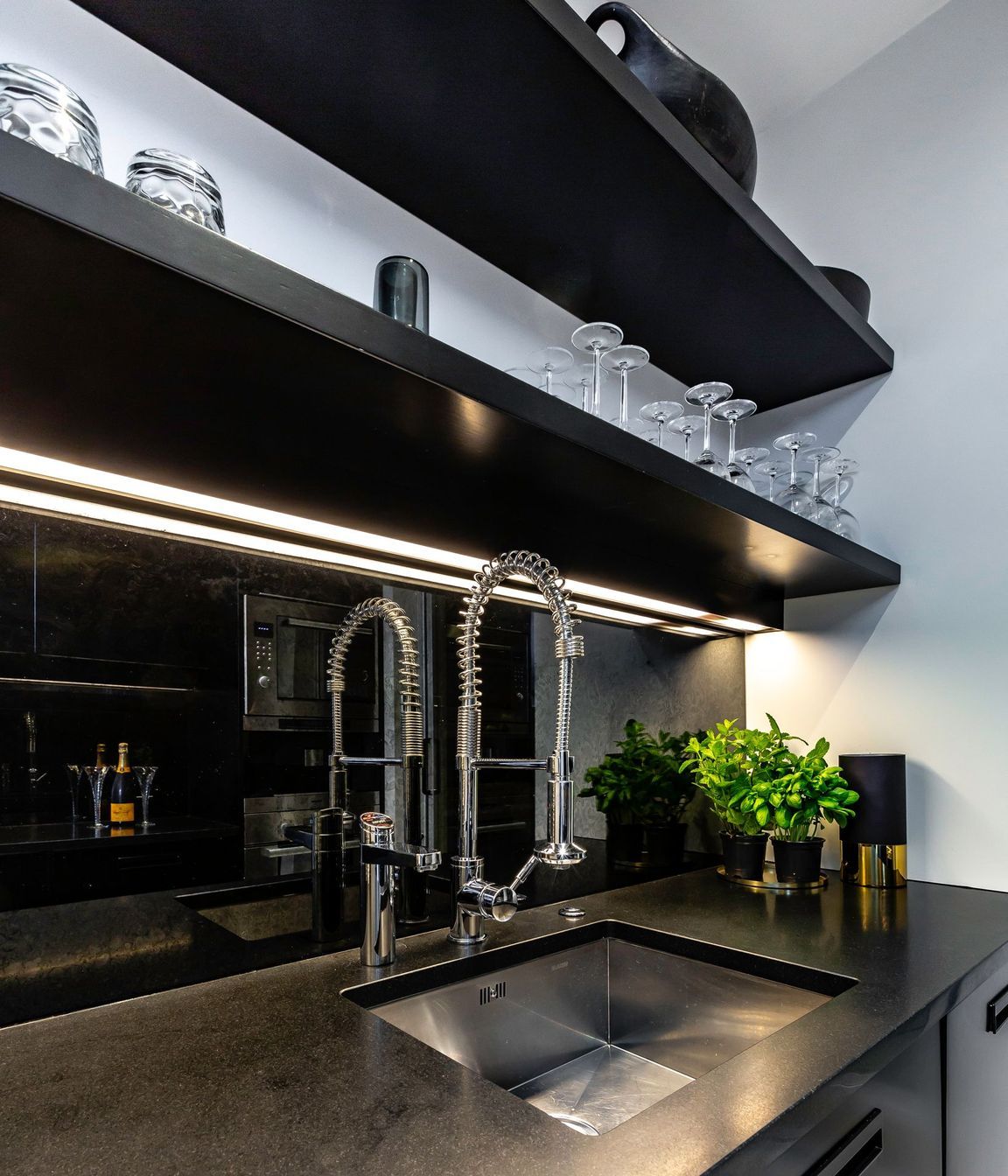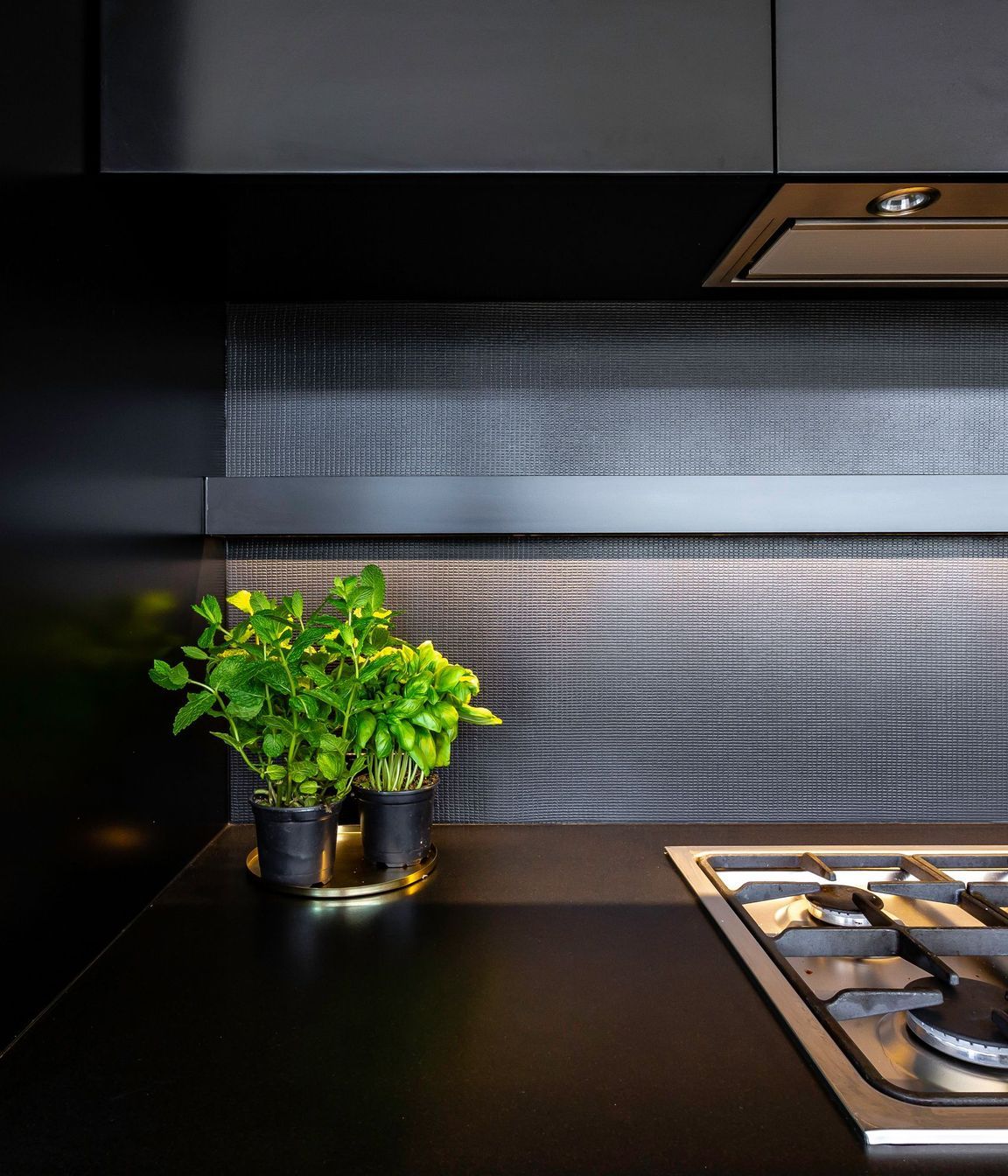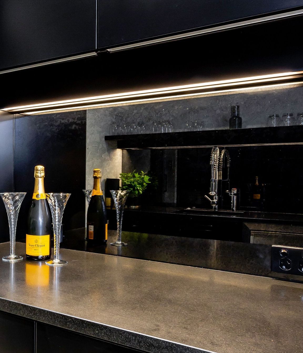 ArchiPro Project Summary - Innovative kitchen featuring metal coated glass splashbacks for a contemporary aesthetic and lasting durability.