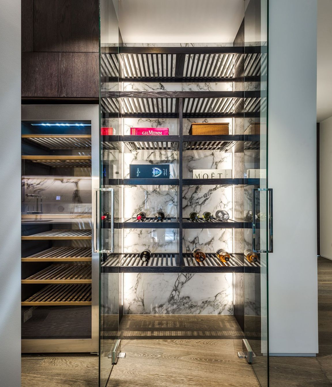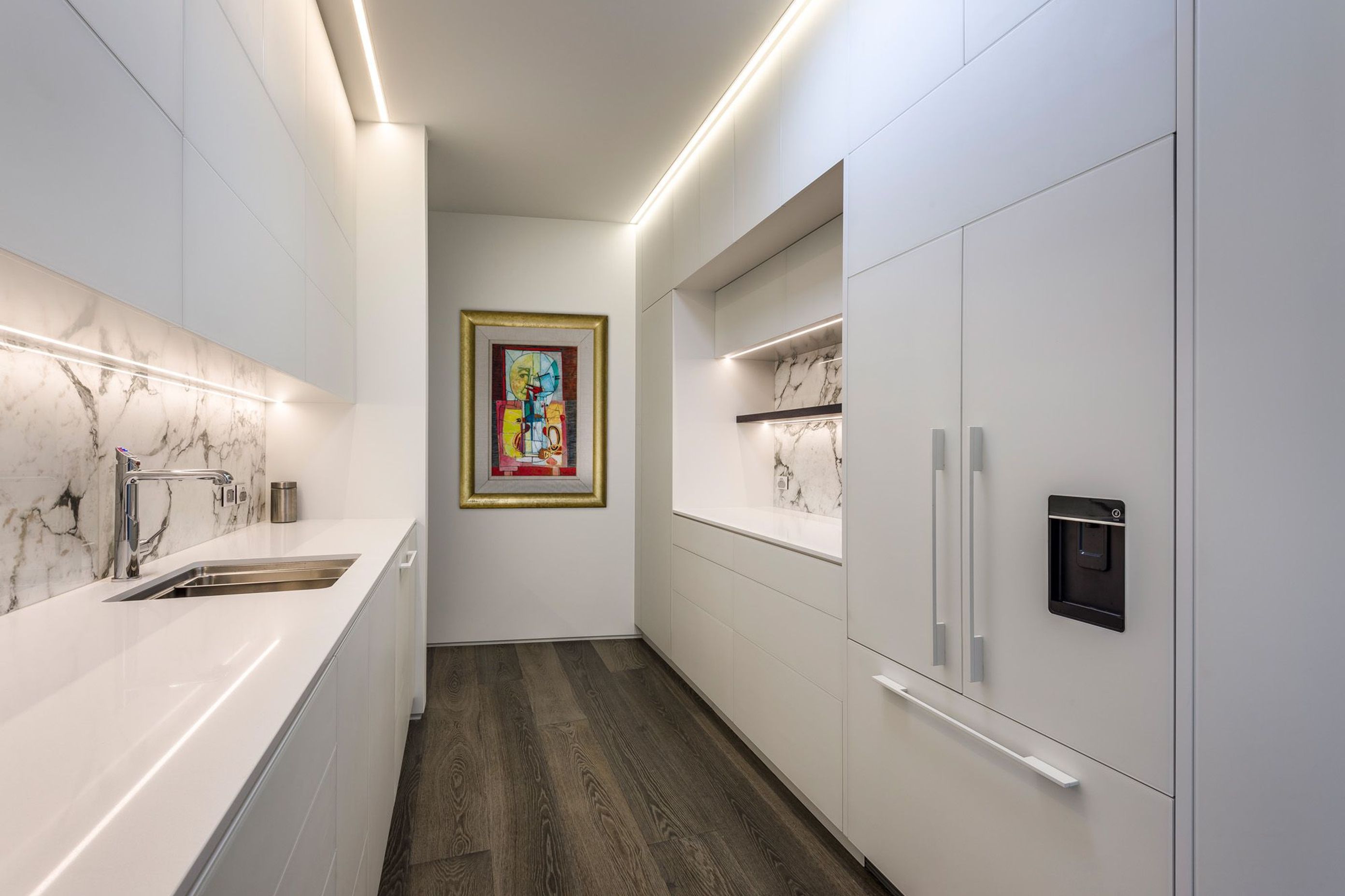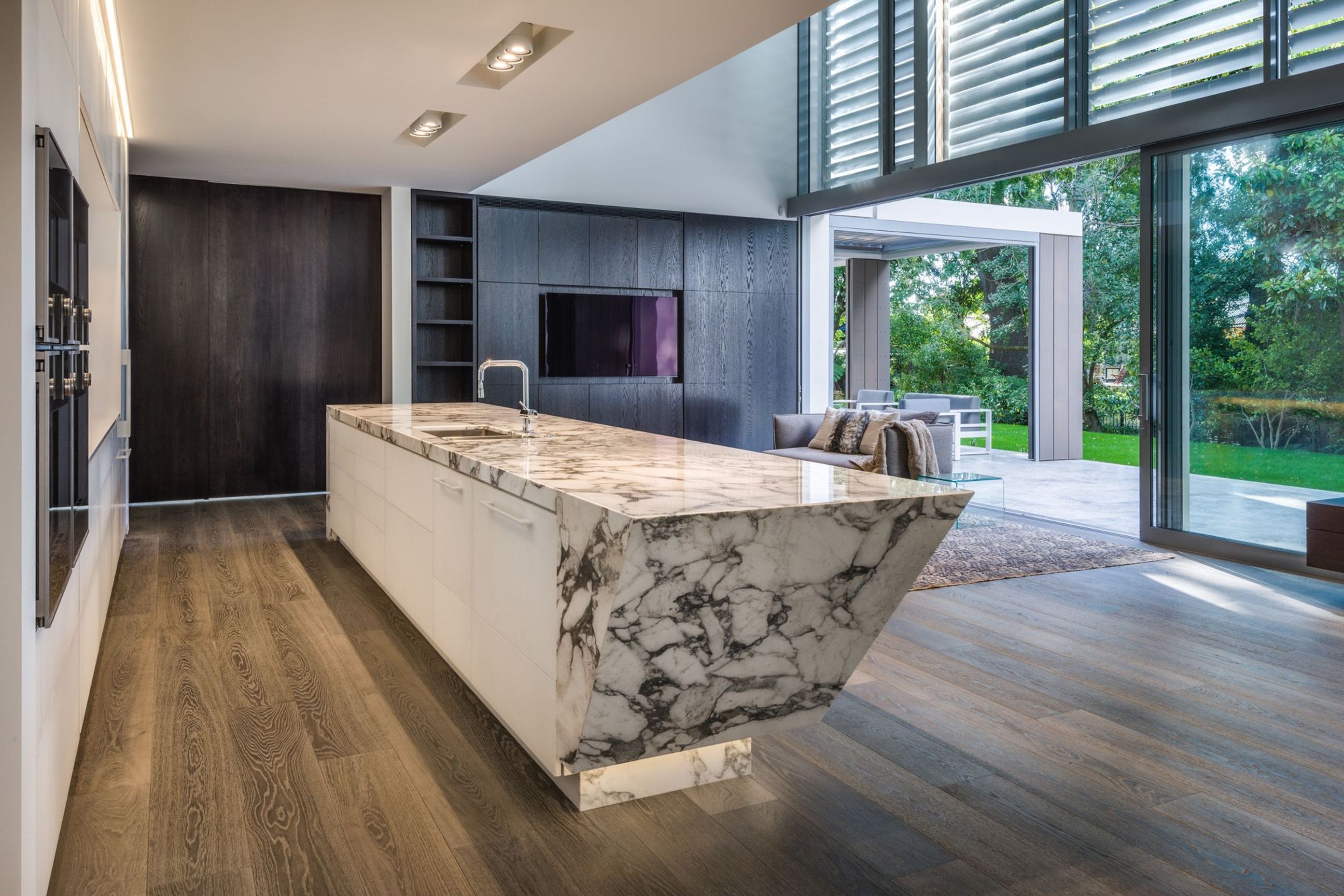 ArchiPro Project Summary - A luxurious kitchen designed by Vicki Andrews Design, featuring a stunning cantilevered island, sophisticated etched frosted glass fronts, and bold Arabescato marble, complemented by a spacious scullery and award-winning creative lighting.