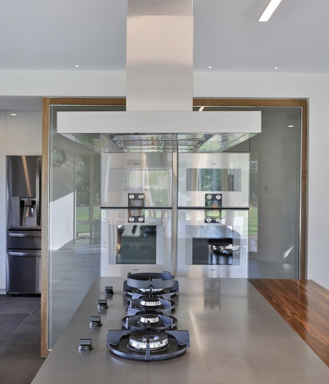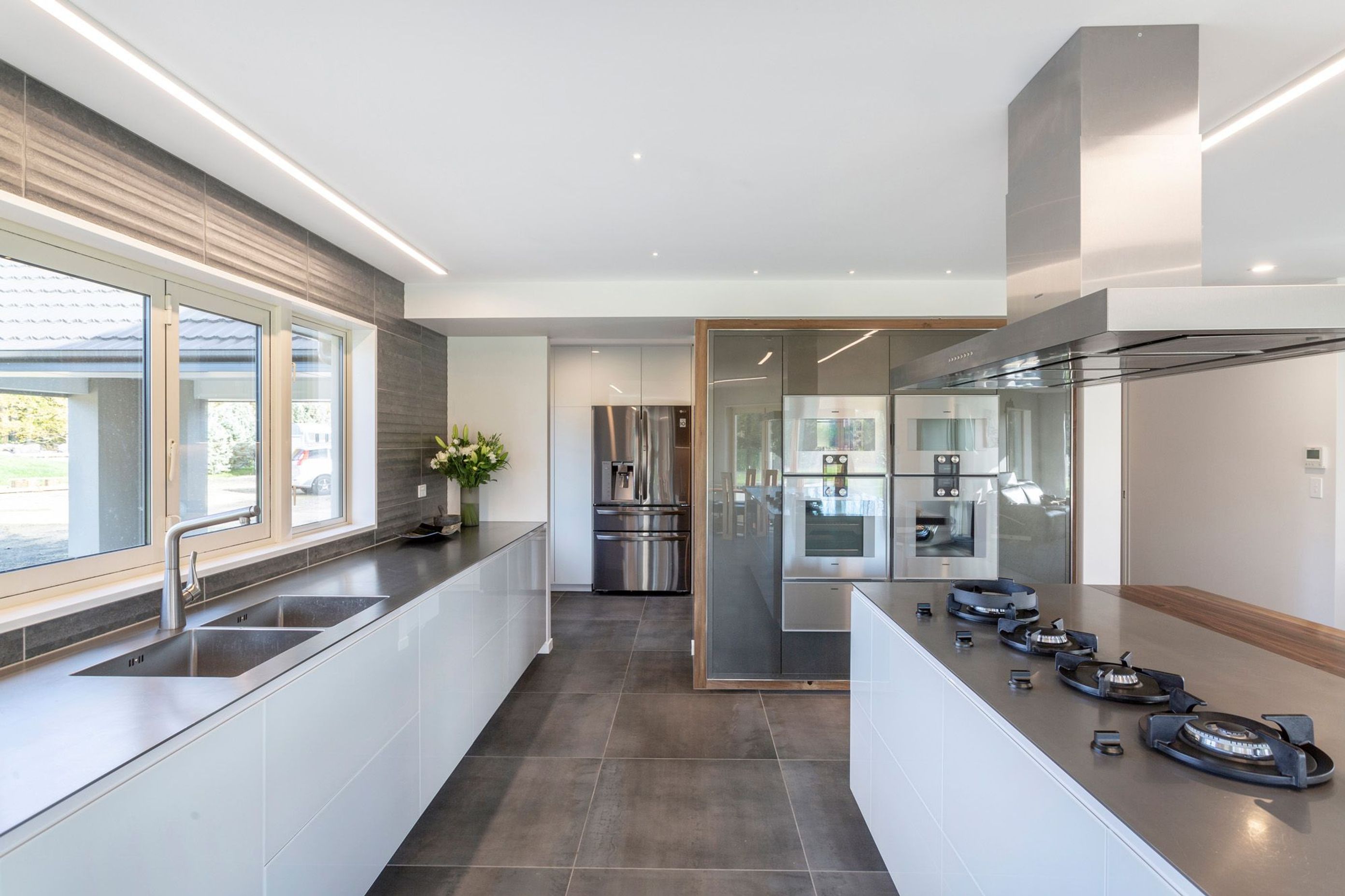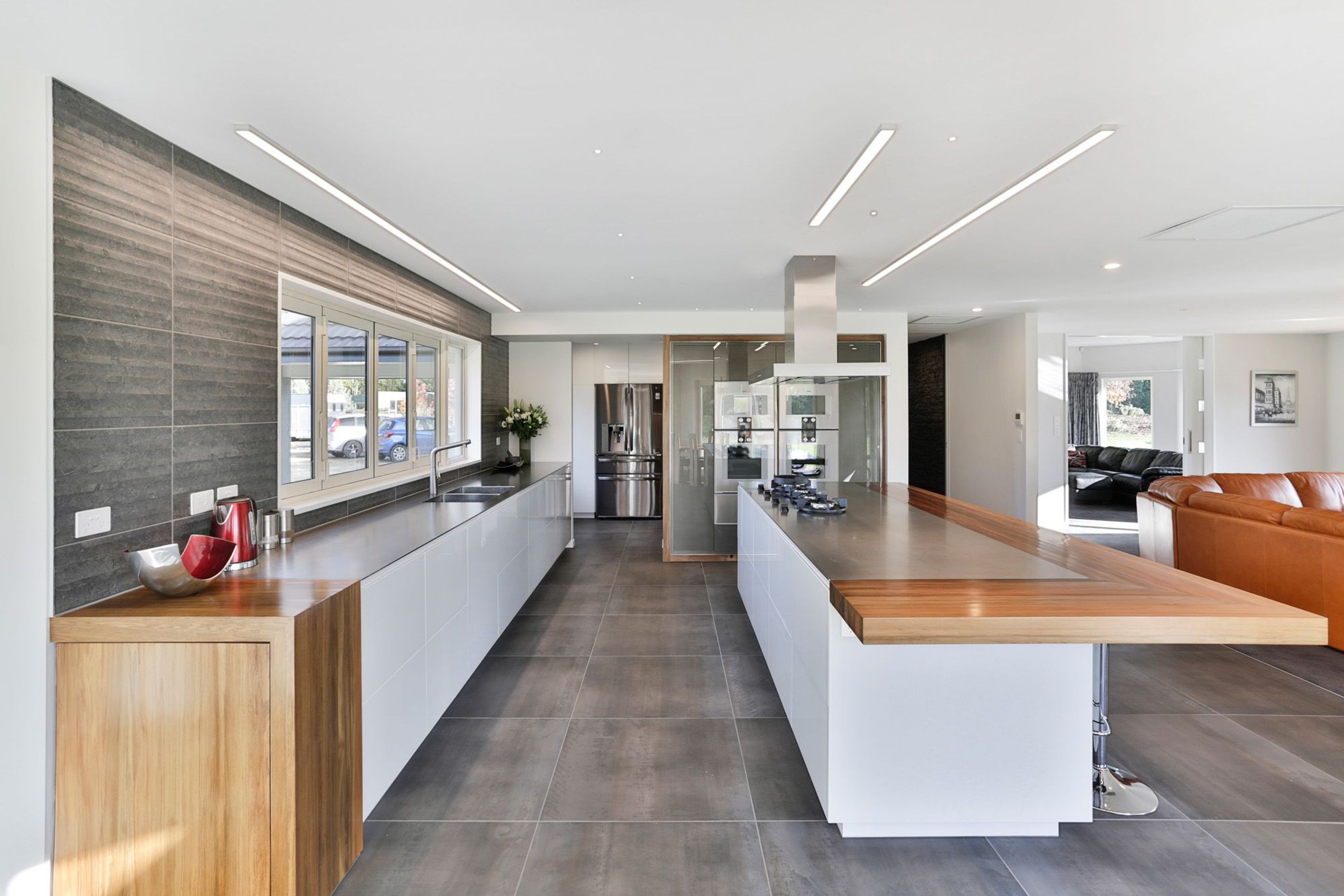 ArchiPro Project Summary - A contemporary kitchen and scullery renovation that transforms a 90's home into a functional family space, featuring a striking island with deconstructed gas burners, reflective back-painted glass, and elegant swamp Rimu accents.