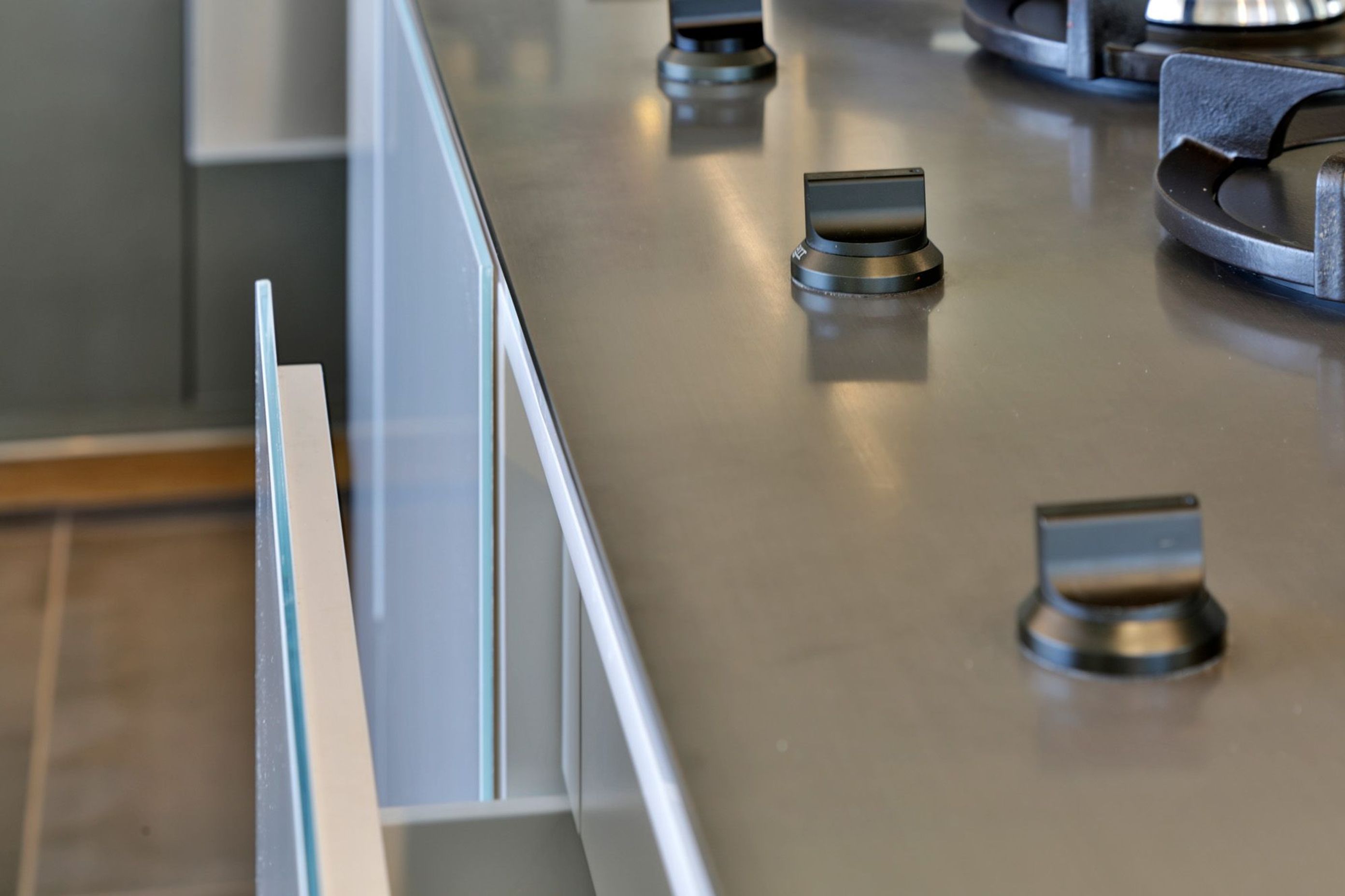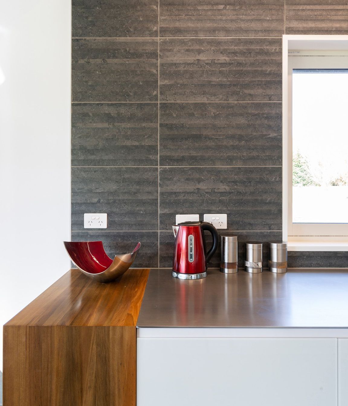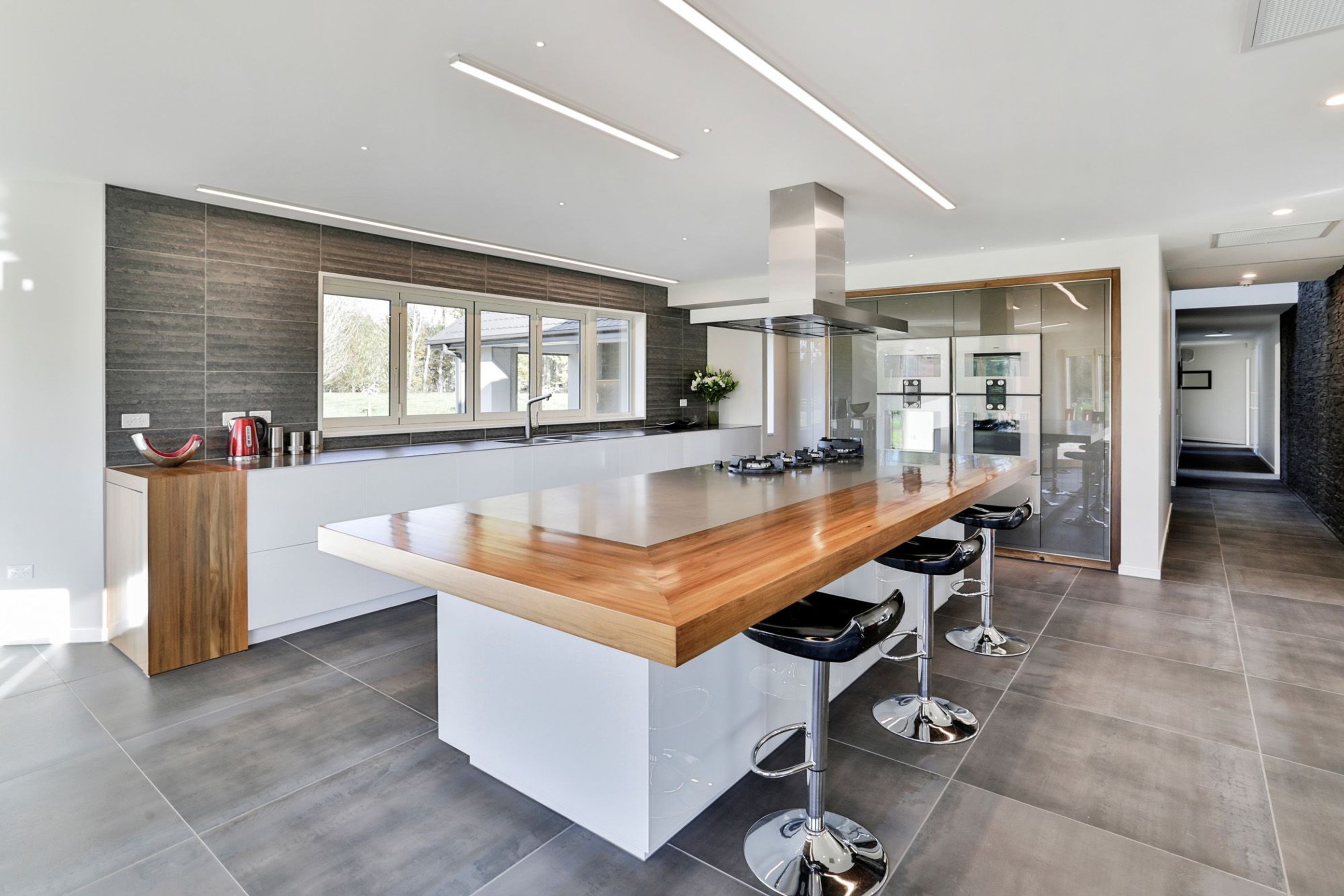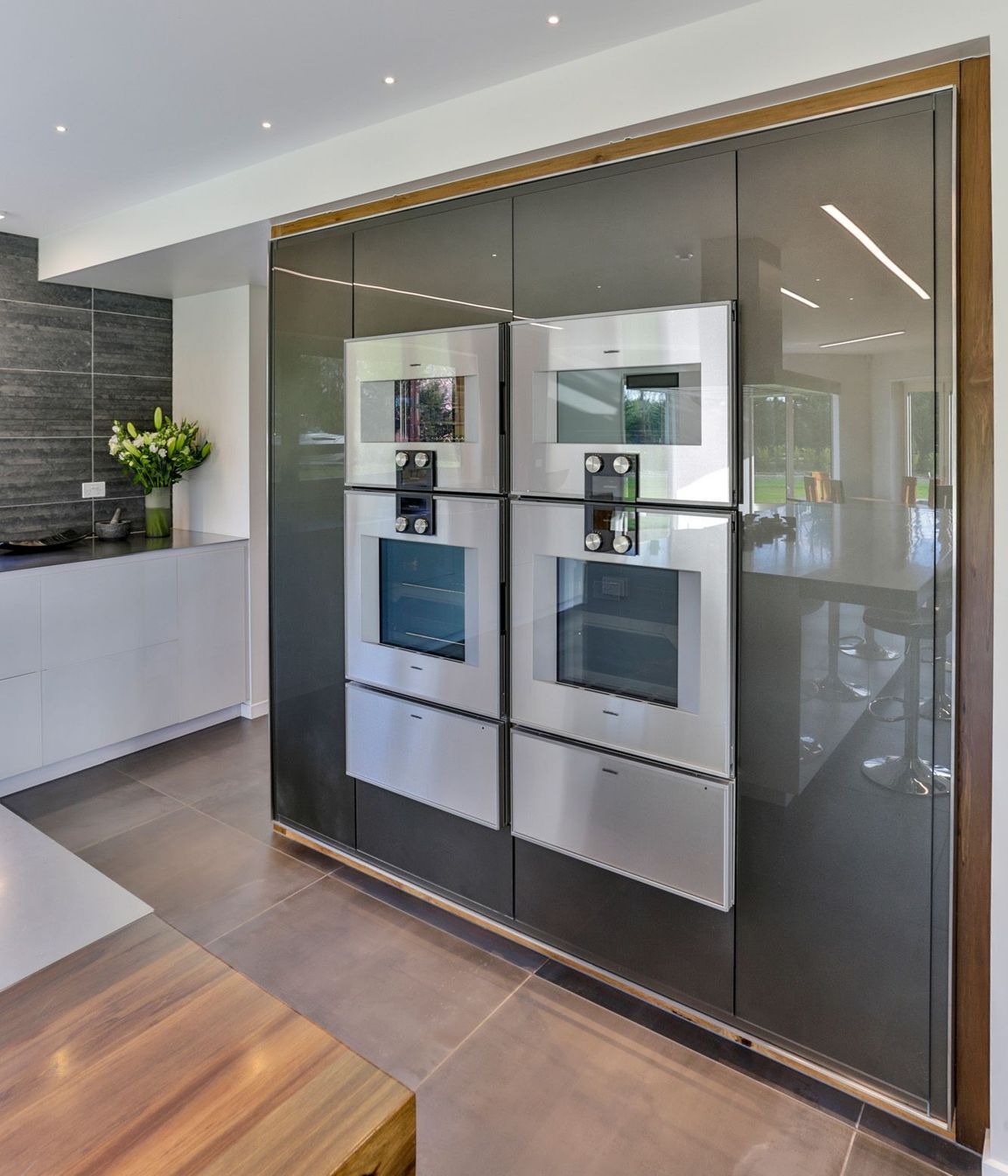 ArchiPro Project Summary - A contemporary kitchen and scullery renovation that transforms a 90's home into a functional family space, featuring a striking island with deconstructed gas burners, reflective back-painted glass, and elegant swamp Rimu accents.