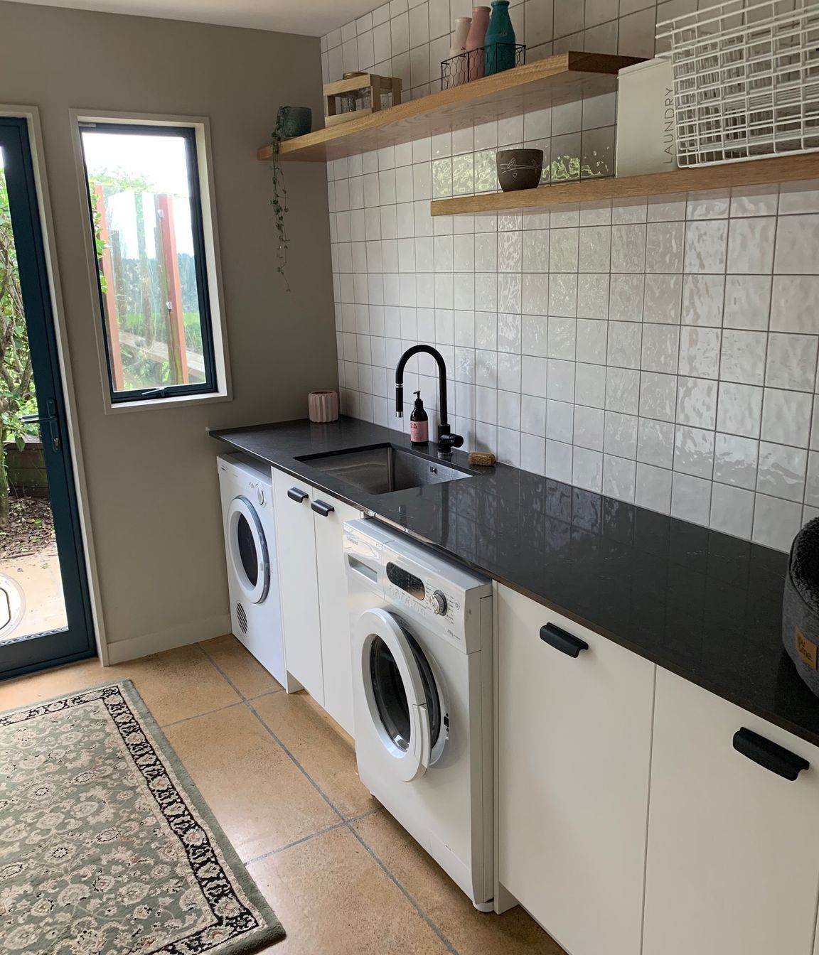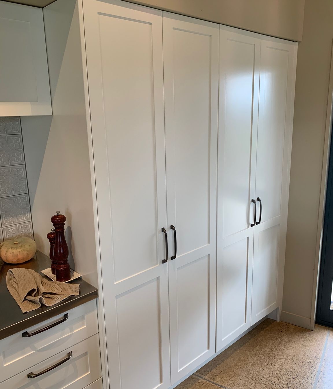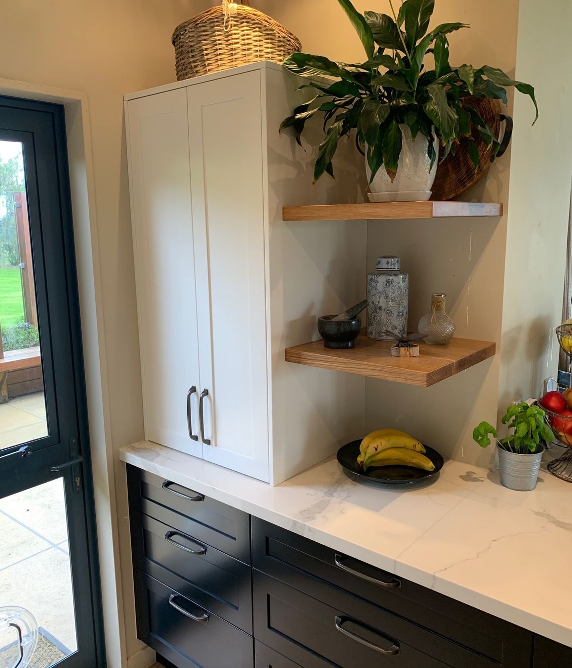 ArchiPro Project Summary - A stunning kitchen re-face featuring elegant shaker doors and panels, expertly finished in 2 pot lacquer and complemented by 40mm engineered stone, transforming the space into a beautiful and functional area despite the challenges posed by Covid-19.