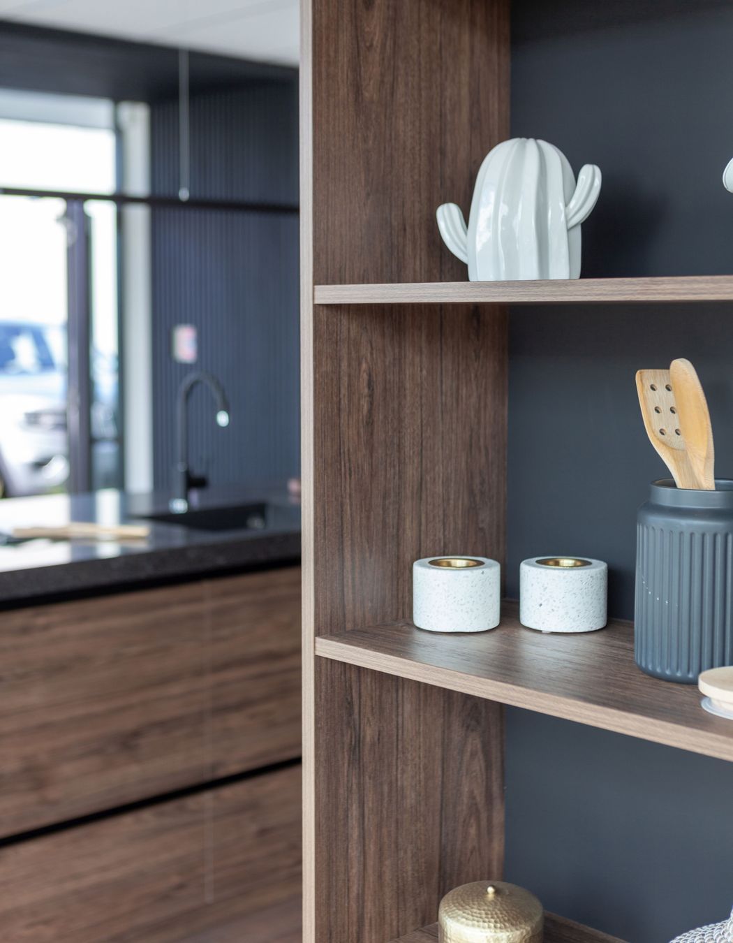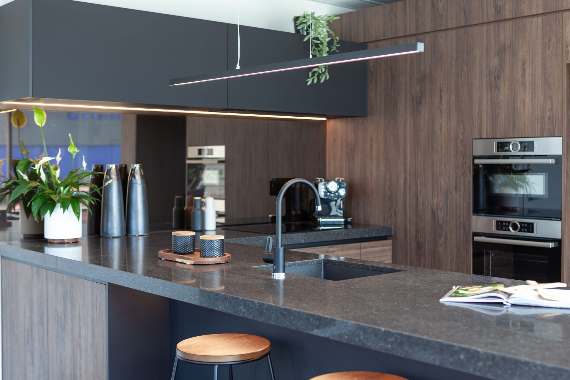 ArchiPro Project Summary - Kitchen Story Showroom in West Auckland features innovative designs by Andrea Burney of Yellowfox, showcasing the new melamine colour range from Prime Panels, including the stunning Hickory Walnut with a realistic Timberland finish.