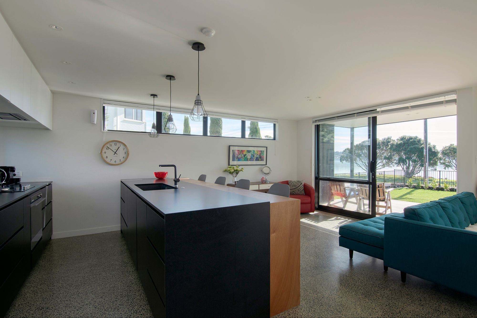 ArchiPro Project Summary - A spatially efficient split-level home designed to maximize panoramic views of Manukau Harbour, featuring an open-plan ground floor, custom concrete steps, and mixed covered decks that seamlessly connect indoor and outdoor living.