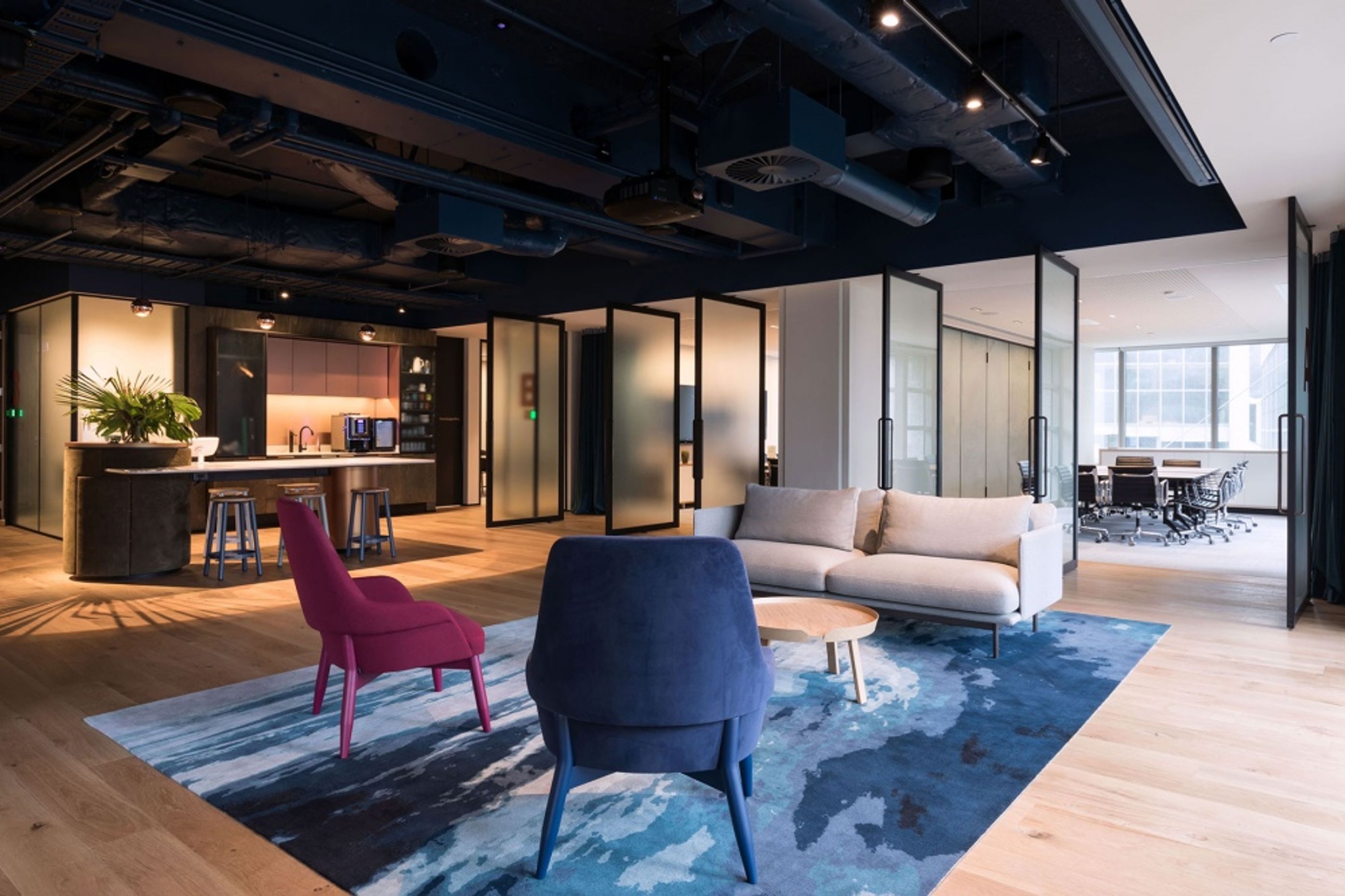 ArchiPro Project Summary - The Kiwi Property Offices project features modern design elements, including silver graphics and plaster walls, creating a functional and aesthetically pleasing workspace.