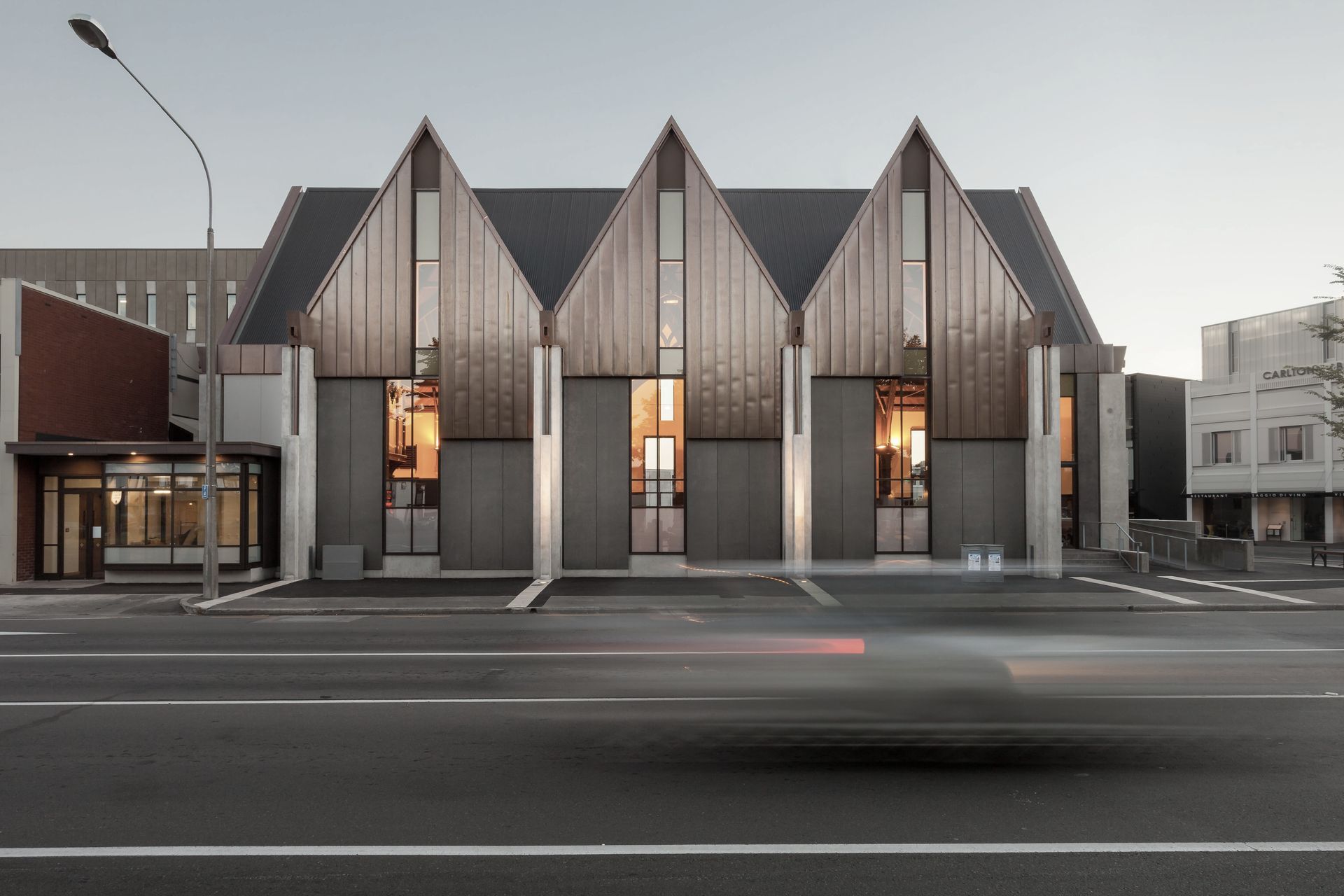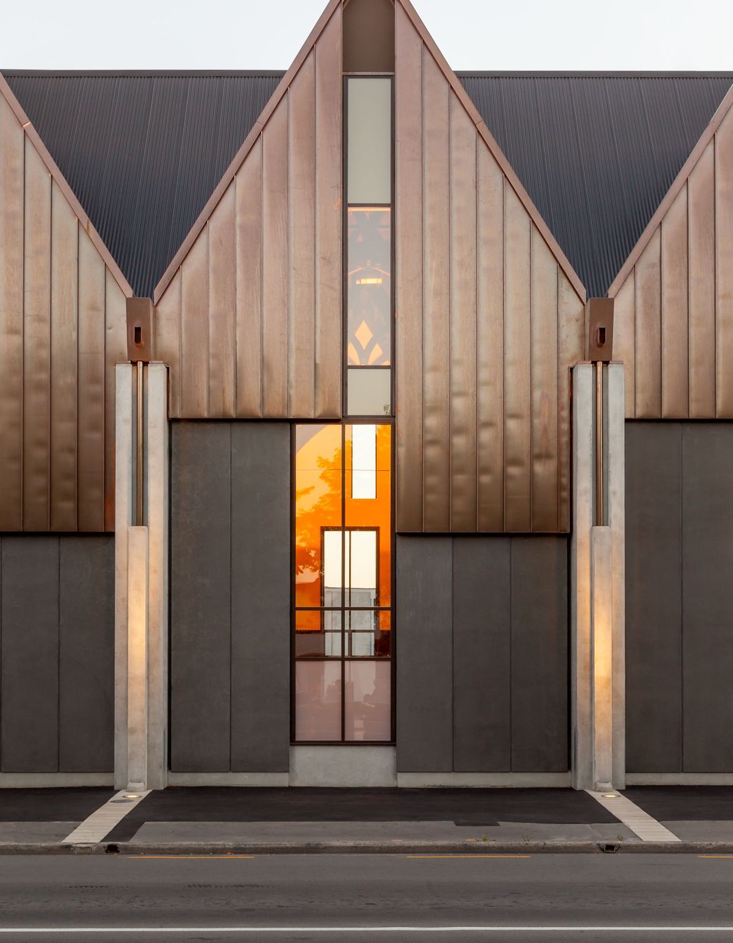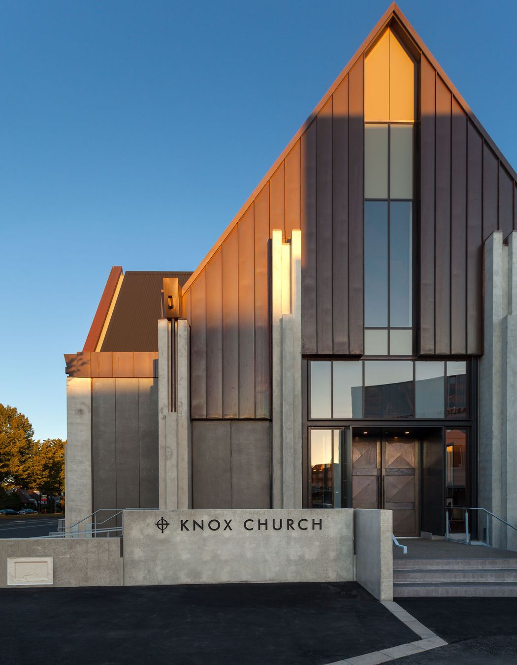 ArchiPro Project Summary - The revitalization of Knox Church in Christchurch by Wilkie + Bruce Architect, featuring beautifully crafted black oxide panels with an acid etch finish, preserving its historical significance for the local community.