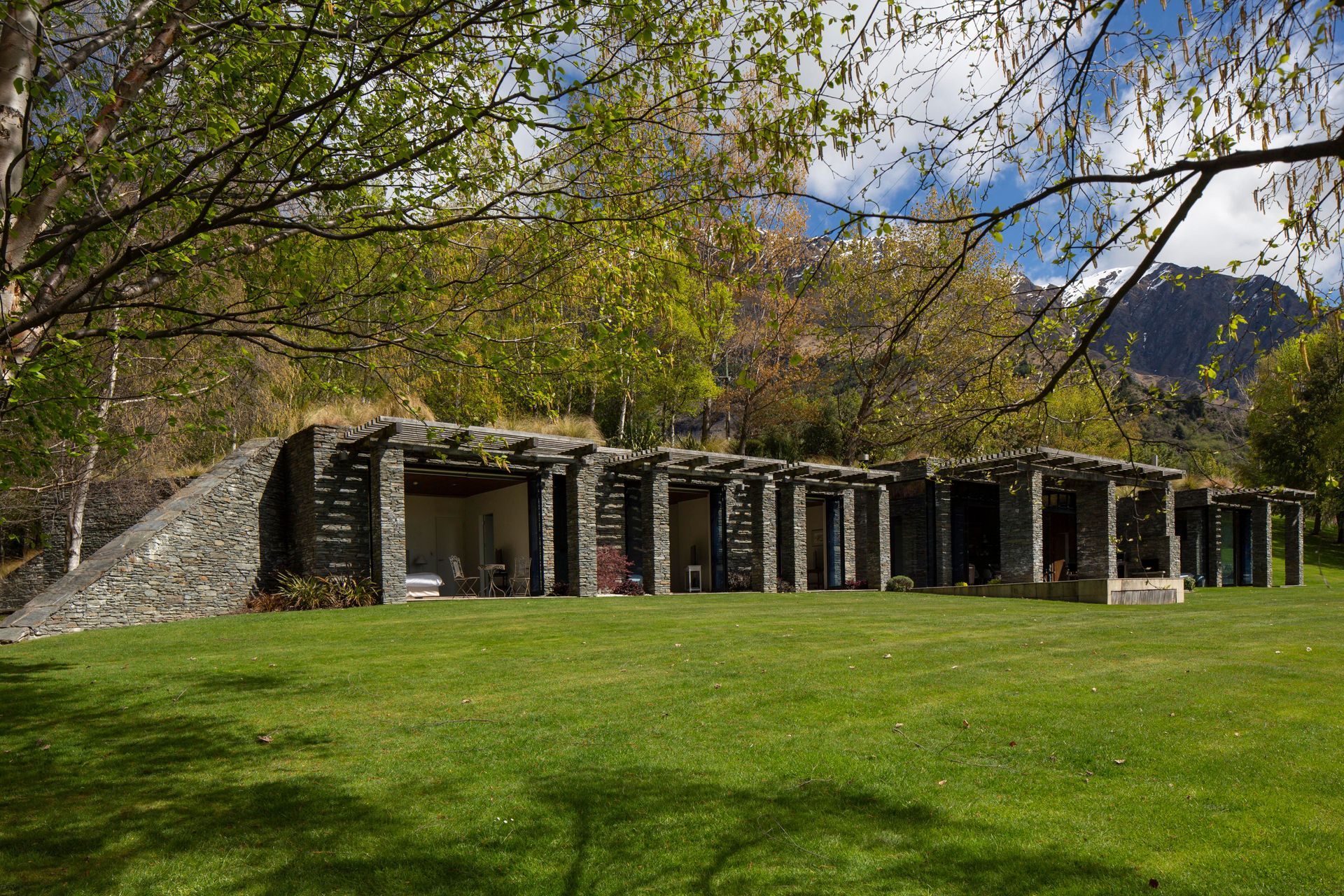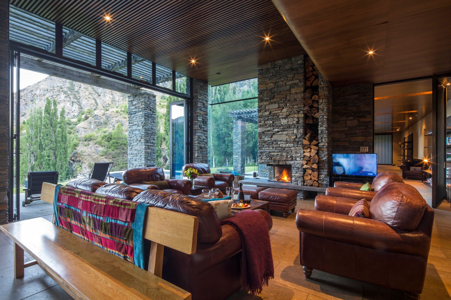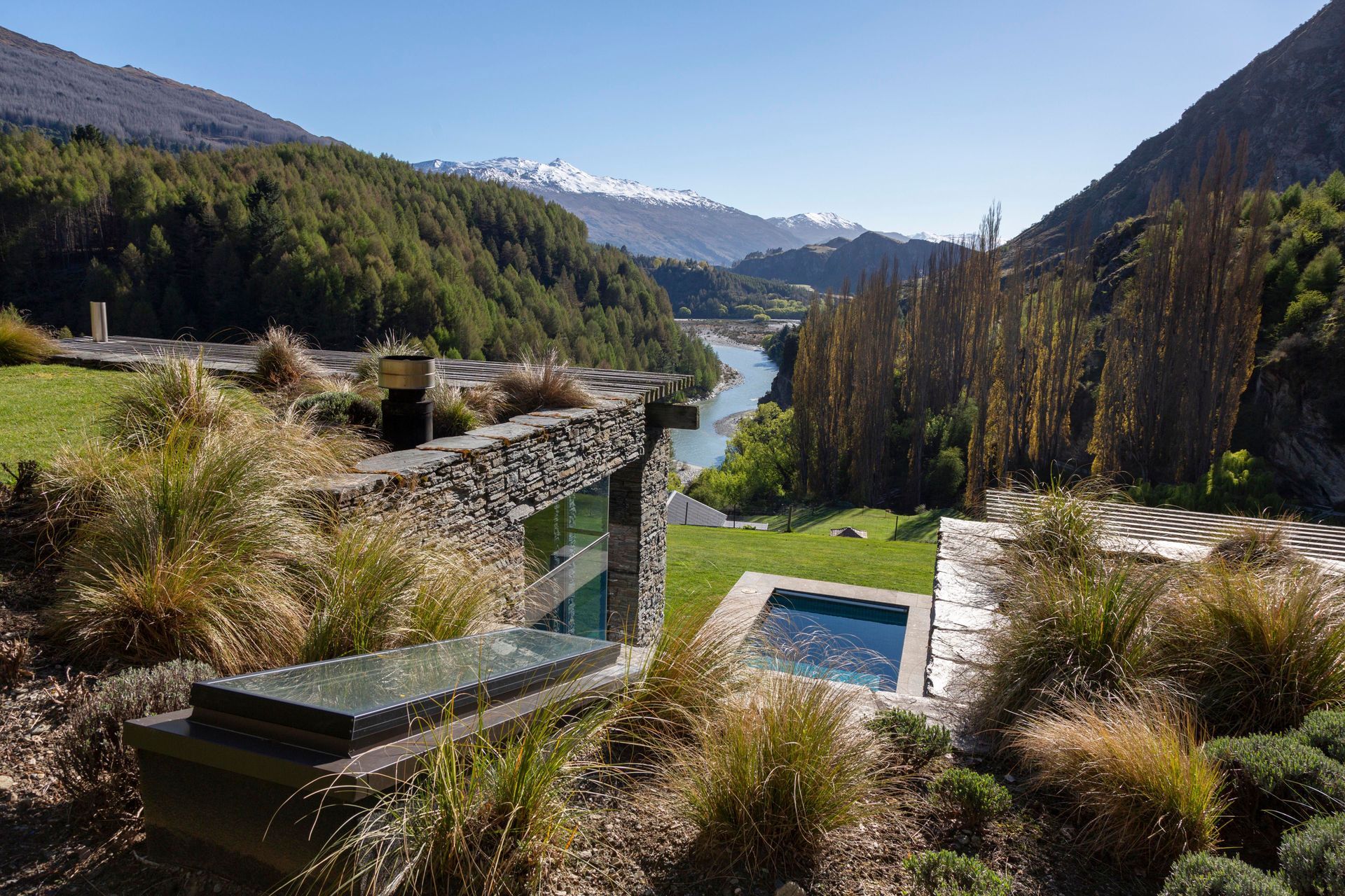 ArchiPro Project Summary - Award-winning environmentally designed house in Arthurs Point, featuring schist stone and natural wood beams, with stunning views of the Shotover River and Coronet Peak.